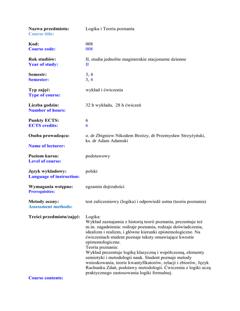 Nazwa przedmiotu: Course title: Logika i Teoria poznania Kod: Course code: 008 008 Rok studiów: Year of study: II, studia jednolite magisterskie stacjonarne dzienne II Semestr: Semester: 3, 4 3, 4 Typ zajęć: Type of course: wykład i ćwiczenia Liczba godzin: Number of hours: 32 h wykładu, 28 h ćwiczeń Punkty ECTS: ECTS credits: 6 6 Osoba prowadząca: o. dr Zbigniew Nikodem Brzózy, dr Przemysław StrzyŜyński, ks. dr Adam Adamski Name of lecturer: Poziom kursu: Level of course: podstawowy Język wykładowy: Language of instruction: polski Wymagania wstępne: egzamin dojrzałości Prerequisites: Metody oceny: Assessment methods: test zaliczeniowy (logika) i odpowiedź ustna (teoria poznania) Treści przedmiotu/zajęć: Logika: Wykład zaznajamia z historią teorii poznania, prezentuje teŜ m.in. zagadnienia: rodzaje poznania, rodzaje doświadczenia, idealizm i realizm, i główne kierunki epistemologiczne. Na ćwiczeniach student poznaje teksty omawiające kwestie epistemologiczne. Teoria poznania: Wykład prezentuje logikę klasyczną i współczesną, elementy semiotyki i metodologii nauk. Student poznaje metody wnioskowania, teorie kwantyfikatorów, relacji i zbiorów, Język Rachunku Zdań, podstawy metodologii. Ćwiczenia z logiki uczą praktycznego zastosowania logiki formalnej. Course contents: 2 Cele i efekty kształcenia: Celem wykładów i ćwiczeń z teorii poznania jest ukazanie zagadnień i poglądów epistemologicznych.. Student powinien umieć rozpoznawać podstawowe poglądy epistemologiczne i ich konsekwencje zwłaszcza dla teologii. Celem wykładów jest prezentacja podstawowych pojęć i teorii logicznych. Student powinien: 1) rozmieć podstawowe pojęcia i teorie logiki 2) odróŜniać wnioskowania zawodne od niezawodnych Na ćwiczenia student powinien: nabyć umiejętność wnioskowania, oceny wnioskowań, odczytywać sens wyraŜeń logiki formalnej. Objectives and learning outcomes: Zalecana literatura: Teoria poznania: Arno Anzenbacher, Kraków WAM 2005. Wprowadzenie do filozofii, s. 118-226. Gabriel Gottfried, Teoria poznania od Kartezjusza do Wittgensteina, Kraków WAM 2007. Logika: Materiały do wykładów z logiki, dla studentów teologii na Wydziale Teologii UAM, (do uŜytku wewnętrznego), Przemysław StrzyŜyński Mała Encyklopedia Logiki, red. W. Marciszewski, Ossolineum, 1970. Logika, M. Kowalewski, Pallotinum 1959. Ćwiczenia z logiki, B. Stanosz, PWN 1999. Logika praktyczna, Z. Ziembiński, PWN 1963. O zasadzie sprzeczności u Arystotelesa, J. Łukasiewicz, PWN 1987. Wprowadzenie do logiki lub Logika dla prawników, W.Patryas Introduction to Logic, I. M. Copi, Macmillan, New York 1986. Wykłady z dziejów logiki, T. Kotarbiński, PWN 1985. Recommended reading: KALKULACJA NAKŁADU PRACY STUDENTA: 1. Godziny kontaktowe (łącznie ilość godzin wykładów i ćwiczeń): 60 h = 2 pkt. ECTS 2. Lektura: Skrypt z teorii poznania i Materiały do wykładów z logiki, dla studentów teologii na Wydziale Teologii UAM, (do uŜytku wewnętrznego), Przemysław StrzyŜyński: 30 h 3. Lektura tekstów na ćwiczenia i wykonanie zadań z logiki: 60 h 4. Przygotowanie do testu: 40 h 5. Napisanie testu: 1,5 h Razem: 191,5 h = 6 pkt. ECTS 2