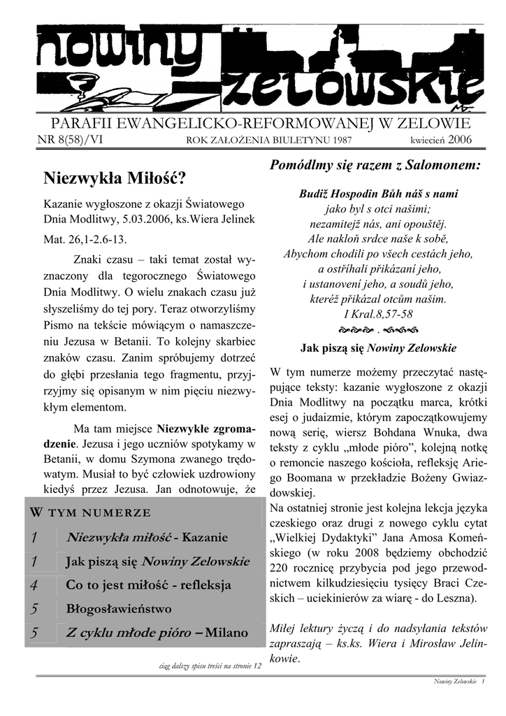 PARAFII EWANGELICKO-REFORMOWANEJ W ZELOWIE NR 8(58)/VI ROK ZAŁOŻENIA BIULETYNU 1987 Niezwykła Miłość? Kazanie wygłoszone z okazji Światowego Dnia Modlitwy, 5.03.2006, ks.Wiera Jelinek Mat. 26,1-2.6-13. Znaki czasu – taki temat został wyznaczony dla tegorocznego Światowego Dnia Modlitwy. O wielu znakach czasu już słyszeliśmy do tej pory. Teraz otworzyliśmy Pismo na tekście mówiącym o namaszczeniu Jezusa w Betanii. To kolejny skarbiec znaków czasu. Zanim spróbujemy dotrzeć do głębi przesłania tego fragmentu, przyjrzyjmy się opisanym w nim pięciu niezwykłym elementom. Ma tam miejsce Niezwykłe zgromadzenie. Jezusa i jego uczniów spotykamy w Betanii, w domu Szymona zwanego trędowatym. Musiał to być człowiek uzdrowiony kiedyś przez Jezusa. Jan odnotowuje, że W 1 1 4 5 5 TYM NUMERZE Niezwykła miłość - Kazanie Jak piszą się Nowiny Zelowskie Co to jest miłość - refleksja Błogosławieństwo Z cyklu młode pióro – Milano ciąg dalszy spisu treści na stronie 12 kwiecień 2006 Pomódlmy się razem z Salomonem: Budiž Hospodin Bůh náš s nami jako byl s otci našimi; nezamitejž nás, ani opouštěj. Ale nakloň srdce naše k sobě, Abychom chodili po všech cestách jeho, a ostříhali přikázaní jeho, i ustanovení jeho, a soudů jeho, kteréž přikázal otcům našim. I Kral.8,57-58 [[[ . \\\ Jak piszą się Nowiny Zelowskie W tym numerze możemy przeczytać następujące teksty: kazanie wygłoszone z okazji Dnia Modlitwy na początku marca, krótki esej o judaizmie, którym zapoczątkowujemy nową serię, wiersz Bohdana Wnuka, dwa teksty z cyklu „młode pióro”, kolejną notkę o remoncie naszego kościoła, refleksję Ariego Boomana w przekładzie Bożeny Gwiazdowskiej. Na ostatniej stronie jest kolejna lekcja języka czeskiego oraz drugi z nowego cyklu cytat „Wielkiej Dydaktyki” Jana Amosa Komeńskiego (w roku 2008 będziemy obchodzić 220 rocznicę przybycia pod jego przewodnictwem kilkudziesięciu tysięcy Braci Czeskich – uciekinierów za wiarę - do Leszna). Miłej lektury życzą i do nadsyłania tekstów zapraszają – ks.ks. Wiera i Mirosław Jelinkowie. Nowiny Zelowskie 1 wśród obecnych uczniów był też wcześniej Niezwykłe wydarzenie. ciąg dalszy ze strony 1 zmartwychwzbudzony przez Jezusa Łazarz, Olejek ten kobieta wylała na głowę Jeposługiwała im wszystkim Marta. Jest tam również ich siostra Maria. A dziś ty i ja. Je- zusa. Niezwykłe wydarzenie. Niektórzy egsteśmy na niezwykłym zgromadzeniu. Nie- zegeci widzą w geście bezimiennej kobiety zwykły gość. Do domu trędowatego wszedł oznakę gościnności, a zatem podkreślają rapodmuch życia, nowej wizji i świeżości. Je- dość, jaką ma ten gest wyrażać. Tego rodzaju śli kiedyś był chory i skazany na zagładę za uczucia byłyby jednak pewnym zgrzytem, życia, tak teraz cieszy się z otrzymania nie- chodzi wszak o historię wprowadzającą nas w jako drugiej szansy. Szymon ma niespłacal- mękę Jezusa. Poza tym nic nie wskazuje na ny dług wdzięczności wobec swojego leka- to, że kobieta jest gospodynią czy też niewolrza, lekarza duszy i ciała. Lekarza, który tak nicą w domu, w którym gości Jezus (a tylko naprawdę przywrócił go społeczności ży- wtedy jej gest mógłby mieć taki sens). Gdyby wych i zdrowych. Przywrócił mu też możli- to była przyjęta oznaka gościnności, nie nawość kontaktu z ludem Bożym. Szymon, potkałaby na sprzeciw. choć już uzdrowiony, zachowuje przydomek A tu natychmiast odzywają się głosy: „trędowaty”. Podobnie jak każdy człowiek, kto widział taką rozrzutność? Na cóż taka który już z racji swego człowieczeństwa zo- strata? Przecież można to było spieniężyć i stał dotknięty nieprawością i skłonnością do zadziałać charytatywnie. Argument ten możgrzechu. W Bożych oczach jesteśmy śmier- naby potraktować z odrobiną ironii. Roczne telnie zarażeni złem od młodości naszej. wynagrodzenie robotnika nie rozwiąże zbyt Chorzy na trąd grzechu. Tylko dzięki łasce wielu problemów ubogich... chociażby dlateBożej możemy, jak uzdrowiony Szymon go reakcja apostołów na ten szczery gest koTrędowaty, mówić: jestem usprawiedliwio- biety jest zawstydzająca. Odzwierciedla też nym z łaski grzesznikiem Simul justus et mentalność niejednego współczesnego człosimul peccator, „zawsze usprawiedliwiony – wieka. Wydaje się, jakby apostołami kierozawsze grzeszny”. Oto co niezwykły gość wała jakaś zazdrość – zazdrość o to, że ktoś wniósł do domu Szymona i w nasze życie. kocha Chrystusa bardziej niż oni. To powoNiezwykły przedmiot. Nagle uwaga duje powstanie dysonansu poznawczego, któwszystkich skupia się na kobiecie. Tu, u ry muszą sobie wyrównać. To budzi ich weMateusza, bezimiennej. Ta podchodzi do wnętrzny sprzeciw. Przy czym nie jest to Jezusa trzymając w ręku Niezwykły sprzeciw mobilizujący do większej troskliwoprzedmiot - flakonik z najkosztowniejszego ści i miłości. Wywołuje on agresję wobec kotworzywa – delikatnego alabastru; flakonik biety, ukrytą pod przykryciem troski o druwypełniony bardzo kosztownym pachni- gich. Bo zazdrość tłumi, czy wręcz niszczy dłem. Marek i Łukasz zauważają, że był to radość z dobra, którego są świadkami. Zaolejek nardowy… (Olejek nardowy produ- zdrość może zniszczyć wszelkie dobre miękowano z roślin rosnących w dolinach Hi- dzyludzkie relacje może zniszczyć każdą malajów i był jednym z najbardziej luksu- wspólnotę, może zaciemnić każdy dobry sowych pachnideł starożytności.) Poznajemy czyn, czy – ogólnie rzecz biorąc – każde szacunkową cenę olejku: ponad trzysta denarów, czyli był więc wart mniej więcej tyle, co roczna pensja robotnika. Nowiny Zelowskie 2 dobro pojawiające się na tym świecie. To takie gładkie ogólniki – powiecie. Bo, przecież, gdybyśmy dziś byli świadkami podobnego zachowania, czy ktoś nazwałby je i