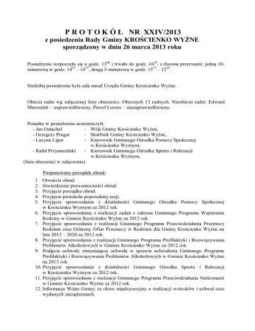 P R O T O K Ó Ł NR XXIV/2013 z posiedzenia Rady Gminy KROŚCIENKO WYŻNE sporządzony w dniu 26 marca 2013 roku Posiedzenie rozpoczęło się o godz. 1300 i trwało do godz. 1620, z dwoma przerwami: jedną 10minutową w godz. 1425 – 1435, drugą 5-minutową w godz. 1515 – 1520. Siedzibą posiedzenia była sala narad Urzędu Gminy Krościenko Wyżne. Obecni radni wg załączonej listy obecności. Obecnych 13 radnych. Nieobecni radni: Edward Marszałek – usprawiedliwiony, Paweł Lorens – nieusprawiedliwiony. Ponadto w posiedzeniu uczestniczyli: - Jan Omachel - Wójt Gminy Krościenko Wyżne, - Grzegorz Prugar - Skarbnik Gminy Krościenko Wyżne, - Lucyna Liput - Kierownik Gminnego Ośrodka Pomocy Społecznej w Krościenku Wyżnym, - Rafał Przymusiński - Kierownik Gminnego Ośrodka Sportu i Rekreacji w Krościenku Wyżnym, (l(lista obecności w załączeniu). Proponowany porządek obrad: 1. 2. 3. 4. 5. Otwarcie obrad. Stwierdzenie prawomocności obrad. Przyjęcie porządku obrad. Przyjęcie protokołu poprzedniej sesji. Przyjęcie sprawozdania z działalności Gminnego Ośrodka Pomocy Społecznej w Krościenku Wyżnym za 2012 rok. 6. Przyjęcie sprawozdania z realizacji zadań z zakresu Gminnego Programu Wspierania Rodziny w Gminie Krościenko Wyżne za 2012 rok. 7. Przyjęcie sprawozdania z realizacji Gminnego Programu Przeciwdziałania Przemocy Rodzinie oraz Ochrony Ofiar Przemocy w Rodzinie dla Gminy Krościenko Wyżne na lata 2012 – 2020 za 2012 rok. 8. Przyjęcie sprawozdania z realizacji Gminnego Programu Profilaktyki i Rozwiązywania Problemów Alkoholowych w Gminie Krościenko Wyżne za 2012 rok. 9. Podjęcie uchwały zmieniającej uchwałę w sprawie uchwalenia Gminnego Programu Profilaktyki i Rozwiązywania Problemów Alkoholowych w Gminie Krościenko Wyżne na 2013 rok. 10. Przyjęcie sprawozdania z działalności Gminnego Ośrodka Sportu i Rekreacji w Krościenku Wyżnym za 2012 rok. 11. Przyjęcie sprawozdania z realizacji Gminnego Programu Przeciwdziałania Narkomanii w Gminie Krościenko Wyżne za 2012 rok. 12. Informacja Wójta Gminy za okres międzysesyjny o realizacji wniosków i uchwał oraz wydanych zarządzeniach. 2 13. Podjęcie uchwały w sprawie uchylenia uchwały własnej Nr XXIII/191/2013 z dnia 5 lutego 2013 r. w sprawie udzielenia pełnomocnictwa do reprezentowania Rady Gminy Krościenko Wyżne w postępowaniu przed sądami administracyjnymi. 14. Podjęcie uchwały w sprawie przyjęcia Programu opieki nad zwierzętami bezdomnymi oraz zapobiegania bezdomności zwierząt w Gminie Krościenko Wyżne na 2013 rok. 15. Podjęcie uchwały w sprawie zgody na wyodrębnienie w budżecie Gminy Krościenko Wyżne na 2014 rok środków stanowiących fundusz sołecki. 16. Podjęcie uchwały w sprawie określenia przystanków komunikacyjnych, których właścicielem lub zarządzającym jest Gmina Krościenko Wyżne oraz warunków i zasad korzystania z tych obiektów. 17. Podjęcie uchwały w sprawie wyrażenia zgody na nabycie nieruchomości gruntowych położonych przy ulicy Wspólnej w obrębie Krościenko Wyżne. 18. Podjęcie uchwały w sprawie wyrażenia zgody na zbycie w trybie bezprzetargowym części nieruchomości gruntowych (3645/5 i 3559/18) położonych przy ulicy Spacerowej w obrębie Krościenko Wyżne na rzecz Rejonu Budowy Dróg i Mostów w Krośnie Sp. z o.o. 19. Podjęcie uchwały w sprawie określenia zasad nabywania, zbywania i obciążania nieruchomości stanowiących własność Gminy Krościenko Wyżne oraz ich wydzierżawiania lub najmu na okres dłuższy niż trzy lata. 20. Podjęcie uchwały w sprawie zmian w uchwale budżetowej Gminy Krościenko Wyżne na 2013 rok. 21. Podjęcie uchwały o zmianie uchwały w sprawie uchwalenia Wieloletniej Prognozy Finansowej Gminy Krościenko Wyżne na lata 2013-2018. 22. Wolne wnioski, interpelacje i zapytania. 23. Zamknięcie sesji. Ad. 1 Rozpoczynając XXIV Sesję Rady Gminy Krościenko Wyżne Przewodniczący Rady – Antoni Dębiec otworzył obrady, powitał wszystkich radnych oraz obecnych na posiedzeniu. Ad. 2 W drugim punkcie proponowanego porządku obrad prowadzący posiedzenie – Antoni Dębiec na podstawie listy obecności stwierdził, że na sesji można podejmować prawomocne uchwały i rozstrzygnięcia. Zauważył, że w sesji uczestniczy 13 radnych Gminy Krościenko Wyżne. Ad. 3 Następnie przystąpiono do przyjęcia proponowanego porządku obrad. Wójt Gminy – Jan Omachel wystąpił z wnioskiem o zmianę proponowanego porządku obrad, tj. aby po pkt 19 wprowadzić pkt 20 w brzmieniu: „20. Podjęcie uchwały w sprawie realizacji i zabezpieczenia środków dla projektu pn. „Termomodernizacja obiektów użyteczności publicznej w Gminie Krościenko Wyżne”. Dotychczasowe pkt 20-23 realizować jako 21-24. 3 Radni nie złożyli wniosków o zmianę proponowanego porządku obrad, wobec czego Przewodniczący Rady Gminy przystąpił do przegłosowania wniosku złożonego przez Wójta Gminy, dot. nowego brzmienia pkt 20. W głosowaniu jawnym uczestniczyło 13 radnych: - „za” zmianą głosowało 13 radnych, - „przeciw” – 0 radnych, - „wstrzymało się” od głosu 0 radnych, Przewodniczący Rady Gminy stwierdził, że ww. wniosek został przyjęty. Następnie Przewodniczący Rady Gminy przystąpił do przegłosowania porządku obrad wraz ze zmianą. W głosowaniu jawnym uczestniczyło 13 radnych: - „za” przyjęciem porządku obrad głosowało 13 radnych, - „przeciw” – 0 radnych, - „wstrzymało się” od głosu 0 radnych, wobec czego Rada Gminy Krościenko Wyżne przyjęła porządek obrad XXIV Sesji Rady Gminy Krościenko Wyżne w następującym brzmieniu: Proponowany porządek obrad: 1. 2. 3. 4. 5. Otwarcie obrad. Stwierdzenie prawomocności obrad. Przyjęcie porządku obrad. Przyjęcie protokołu poprzedniej sesji. Przyjęcie sprawozdania z działalności Gminnego Ośrodka Pomocy Społecznej w Krościenku Wyżnym za 2012 rok. 6. Przyjęcie sprawozdania z realizac