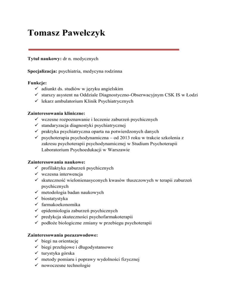 Tomasz Pawełczyk Tytuł naukowy: dr n. medycznych Specjalizacja: psychiatria, medycyna rodzinna Funkcje: adiunkt ds. studiów w języku angielskim starszy asystent na Oddziale Diagnostyczno-Obserwacyjnym CSK IS w Łodzi lekarz ambulatorium Klinik Psychiatrycznych Zainteresowania kliniczne: wczesne rozpoznawanie i leczenie zaburzeń psychicznych standaryzacja diagnostyki psychiatrycznej praktyka psychiatryczna oparta na potwierdzonych danych psychoterapia psychodynamiczna – od 2013 roku w trakcie szkolenia z zakresu psychoterapii psychodynamicznej w Studium Psychoterapii Laboratorium Psychoedukacji w Warszawie Zainteresowania naukowe: profilaktyka zaburzeń psychicznych wczesna interwencja skuteczność wielonienasyconych kwasów tłuszczowych w terapii zaburzeń psychicznych metodologia badan naukowych biostatystyka farmakoekonomika epidemiologia zaburzeń psychicznych predykcja skuteczności psychofarmakoterapii podłoże biologiczne zmiany w przebiegu psychoterapii Zainteresowania pozazawodowe: biegi na orientację biegi przełajowe i długodystansowe turystyka górska metody pomiaru i poprawy wydolności fizycznej nowoczesne technologie