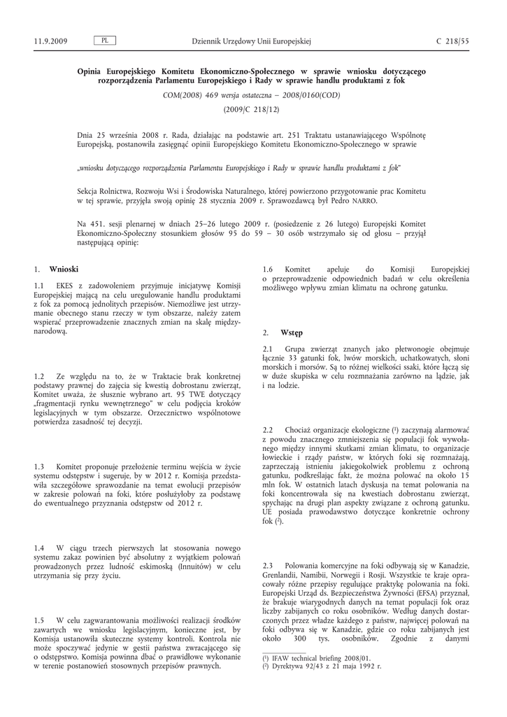 PL 11.9.2009 Dziennik Urzędowy Unii Europejskiej C 218/55 Opinia Europejskiego Komitetu Ekonomiczno-Społecznego w sprawie wniosku dotyczącego rozporządzenia Parlamentu Europejskiego i Rady w sprawie handlu produktami z fok COM(2008) 469 wersja ostateczna – 2008/0160(COD) (2009/C 218/12) Dnia 25 września 2008 r. Rada, działając na podstawie art. 251 Traktatu ustanawiającego Wspólnotę Europejską, postanowiła zasięgnąć opinii Europejskiego Komitetu Ekonomiczno-Społecznego w sprawie „wniosku dotyczącego rozporządzenia Parlamentu Europejskiego i Rady w sprawie handlu produktami z fok” Sekcja Rolnictwa, Rozwoju Wsi i Środowiska Naturalnego, której powierzono przygotowanie prac Komitetu w tej sprawie, przyjęła swoją opinię 28 stycznia 2009 r. Sprawozdawcą był Pedro NARRO. Na 451. sesji plenarnej w dniach 25–26 lutego 2009 r. (posiedzenie z 26 lutego) Europejski Komitet Ekonomiczno-Społeczny stosunkiem głosów 95 do 59 – 30 osób wstrzymało się od głosu – przyjął następującą opinię: 1. Wnioski 1.1 EKES z zadowoleniem przyjmuje inicjatywę Komisji Europejskiej mającą na celu uregulowanie handlu produktami z fok za pomocą jednolitych przepisów. Niemożliwe jest utrzy manie obecnego stanu rzeczy w tym obszarze, należy zatem wspierać przeprowadzenie znacznych zmian na skalę między narodową. 1.2 Ze względu na to, że w Traktacie brak konkretnej podstawy prawnej do zajęcia się kwestią dobrostanu zwierząt, Komitet uważa, że słusznie wybrano art. 95 TWE dotyczący „fragmentacji rynku wewnętrznego” w celu podjęcia kroków legislacyjnych w tym obszarze. Orzecznictwo wspólnotowe potwierdza zasadność tej decyzji. 1.3 Komitet proponuje przełożenie terminu wejścia w życie systemu odstępstw i sugeruje, by w 2012 r. Komisja przedsta wiła szczegółowe sprawozdanie na temat ewolucji przepisów w zakresie polowań na foki, które posłużyłoby za podstawę do ewentualnego przyznania odstępstw od 2012 r. 1.4 W ciągu trzech pierwszych lat stosowania nowego systemu zakaz powinien być absolutny z wyjątkiem polowań prowadzonych przez ludność eskimoską (Innuitów) w celu utrzymania się przy życiu. 1.5 W celu zagwarantowania możliwości realizacji środków zawartych we wniosku legislacyjnym, konieczne jest, by Komisja ustanowiła skuteczne systemy kontroli. Kontrola nie może spoczywać jedynie w gestii państwa zwracającego się o odstępstwo. Komisja powinna dbać o prawidłowe wykonanie w terenie postanowień stosownych przepisów prawnych. 1.6 Komitet apeluje do Komisji Europejskiej o przeprowadzenie odpowiednich badań w celu określenia możliwego wpływu zmian klimatu na ochronę gatunku. 2. Wstęp 2.1 Grupa zwierząt znanych jako płetwonogie obejmuje łącznie 33 gatunki fok, lwów morskich, uchatkowatych, słoni morskich i morsów. Są to różnej wielkości ssaki, które łączą się w duże skupiska w celu rozmnażania zarówno na lądzie, jak i na lodzie. 2.2 Chociaż organizacje ekologiczne (1) zaczynają alarmować z powodu znacznego zmniejszenia się populacji fok wywoła nego między innymi skutkami zmian klimatu, to organizacje łowieckie i rządy państw, w których foki się rozmnażają, zaprzeczają istnieniu jakiegokolwiek problemu z ochroną gatunku, podkreślając fakt, że można polować na około 15 mln fok. W ostatnich latach dyskusja na temat polowania na foki koncentrowała się na kwestiach dobrostanu zwierząt, spychając na drugi plan aspekty związane z ochroną gatunku. UE posiada prawodawstwo dotyczące konkretnie ochrony fok (2). 2.3 Polowania komercyjne na foki odbywają się w Kanadzie, Grenlandii, Namibii, Norwegii i Rosji. Wszystkie te kraje opra cowały różne przepisy regulujące praktykę polowania na foki. Europejski Urząd ds. Bezpieczeństwa Żywności (EFSA) przyznał, że brakuje wiarygodnych danych na temat populacji fok oraz liczby zabijanych co roku osobników. Według danych dostar czonych przez władze każdego z państw, najwięcej polowań na foki odbywa się w Kanadzie, gdzie co roku zabijanych jest około 300 tys. osobników. Zgodnie z danymi (1) IFAW technical briefing 2008/01. (2) Dyrektywa 92/43 z 21 maja 1992 r. C 218/56 PL Dziennik Urzędowy Unii Europejskiej rządu kanadyjskiego (1), w 2008 r. upolowano 275 tys. fok i przyznano łącznie 17 tys. zezwoleń. Na dalszym miejscu za Kanadą znajdują się Grenlandia (2) i Namibia (3) ze 160 tys. i 80 tys. zabijanych rocznie osobników. 2.4 W Unii Europejskiej foki są zabijane i skórowane w dwóch krajach: Finlandii i Szwecji. W Wielkiej Brytanii (Szkocja) wytwarza się produkty z fok. Na terytorium Wspól noty działalność ta nie ma wymiaru komercyjnego, tak jak w Norwegii i Kanadzie, lecz ukierunkowana jest na dwa cele: rekreację i kontrolę populacji żywiącej się rybami. 2.5 Foki są zabijane dla futra wykorzystywanego w ciepłych okryciach, dla tłuszczu do produkcji oleju, mięsa jako poży wienia dla zwierząt oraz genitaliów, które cieszą się coraz więk szym uznaniem na kontynencie azjatyckim przy wytwarzaniu afrodyzjaków. 2.6 Istnieją różne sposoby zabijania fok. Najczęściej używa się karabinów i hakapików (które wyglądają jak ostrze zakoń czone rodzajem młotka). Chociaż ten rodzaj harpunu, zwany hakapikiem, wygląda prosto i prymitywnie, to naukowcy uznają go za najbardziej skuteczną metodę szybkiego ogłuszania i zabijania fok. 2.7 W opinii naukowej opublikowanej w 2007 r. (4) EFSA stwierdził, że „istnieją szybkie i skuteczne sposoby zabijania fok pozwalające uniknąć zadawania im bólu i cierpienia”. Jednakże w badaniu stwierdzono również, że w praktyce sposoby zabi jania nie zawsze są skuteczne i humanitarne. Zadaniem różnych przepisów krajowych jest regulowanie rozmiarów hakapików i form ich użycia, a także kalibru karabinów i szybkości pocisku. 3. Streszczenie wniosku Komisji 3.1 26 września 2006 r. Parlament Europejski przyjął dekla rację (5), 