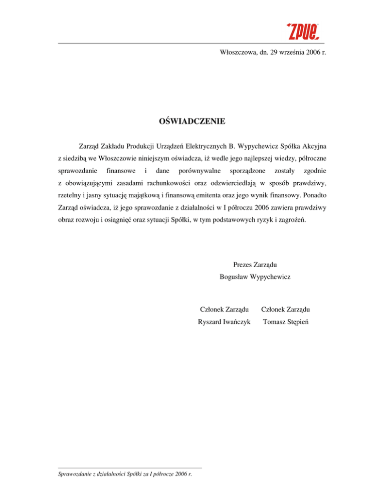 Włoszczowa, dn. 29 wrze nia 2006 r. O WIADCZENIE Zarz d Zakładu Produkcji Urz dze Elektrycznych B. Wypychewicz Spółka Akcyjna z siedzib we Włoszczowie niniejszym o wiadcza, i wedle jego najlepszej wiedzy, półroczne sprawozdanie finansowe i dane porównywalne sporz dzone z obowi zuj cymi zasadami rachunkowo ci oraz odzwierciedlaj zostały zgodnie w sposób prawdziwy, rzetelny i jasny sytuacj maj tkow i finansow emitenta oraz jego wynik finansowy. Ponadto Zarz d o wiadcza, i jego sprawozdanie z działalno ci w I półroczu 2006 zawiera prawdziwy obraz rozwoju i osi gni oraz sytuacji Spółki, w tym podstawowych ryzyk i zagro e . Prezes Zarz du Bogusław Wypychewicz Sprawozdanie z działalno ci Spółki za I półrocze 2006 r. Członek Zarz du Członek Zarz du Ryszard Iwa czyk Tomasz St pie