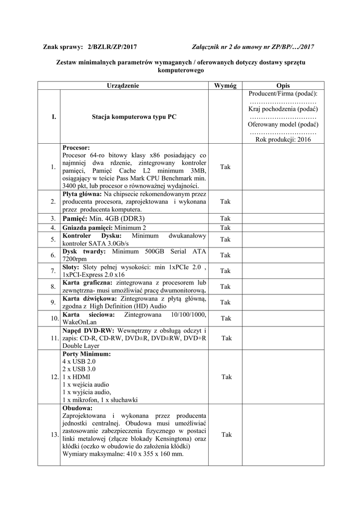 Znak sprawy: 2/BZLR/ZP/2017 Załącznik nr 2 do umowy nr ZP/BP/…/2017 Zestaw minimalnych parametrów wymaganych / oferowanych dotyczy dostawy sprzętu komputerowego Urządzenie I. Wymóg Stacja komputerowa typu PC Procesor: Procesor 64-ro bitowy klasy x86 posiadający co najmniej dwa rdzenie, zintegrowany kontroler 1. pamięci, Pamięć Cache L2 minimum 3MB, osiągający w teście Pass Mark CPU Benchmark min. 3400 pkt, lub procesor o równoważnej wydajności. Płyta główna: Na chipsecie rekomendowanym przez 2. producenta procesora, zaprojektowana i wykonana przez producenta komputera. 3. Pamięć: Min. 4GB (DDR3) 4. Gniazda pamięci: Minimum 2 Kontroler Dysku: Minimum dwukanałowy 5. kontroler SATA 3.0Gb/s Dysk twardy: Minimum 500GB Serial ATA 6. 7200rpm Sloty: Sloty pełnej wysokości: min 1xPCIe 2.0 , 7. 1xPCI-Express 2.0 x16 Karta graficzna: zintegrowana z procesorem lub 8. zewnętrzna- musi umożliwiać pracę dwumonitorową. Karta dźwiękowa: Zintegrowana z płytą główną, 9. zgodna z High Definition (HD) Audio Karta sieciowa: Zintegrowana 10/100/1000, 10. WakeOnLan Napęd DVD-RW: Wewnętrzny z obsługą odczyt i 11. zapis: CD-R, CD-RW, DVD±R, DVD±RW, DVD+R Double Layer Porty Minimum: 4 x USB 2.0 2 x USB 3.0 12. 1 x HDMI 1 x wejścia audio 1 x wyjścia audio, 1 x mikrofon, 1 x słuchawki Obudowa: Zaprojektowana i wykonana przez producenta jednostki centralnej. Obudowa musi umożliwiać zastosowanie zabezpieczenia fizycznego w postaci 13. linki metalowej (złącze blokady Kensingtona) oraz kłódki (oczko w obudowie do założenia kłódki) Wymiary maksymalne: 410 x 355 x 160 mm. Tak Tak Tak Tak Tak Tak Tak Tak Tak Tak Tak Tak Tak Opis Producent/Firma (podać): ………………………… Kraj pochodzenia (podać) ………………………… Oferowany model (podać) ………………………… Rok produkcji: 2016 14. 15. 16. 17. 18. Zasilacz: minimum 180W umożliwiający bezproblemową pracę komputera przy pełnym wyposażeniu w dodatkowe urządzenia podpięte poprzez porty i sloty rozszerzeń, przy pełnym obciążeniu. Klawiatura, mysz: Klawiatura typu Windows pełnowymiarowa, układ typu QWERTY US, port USB. Mysz optyczna ze skrolem minimum 400dpi, minimum dwa przyciski, port USB, trwale oznaczone logo producenta jednostki centralnej. System operacyjny: preinstalowany, minimum Windows 7 Professional w polskiej wersji językowej lub system równoważny, przy czym dostarczany system zapewni kompatybilność z usługą katalogową Active Directory oraz obsługę wszystkich zasad grupy Active Directory bez instalacji i konfiguracji dodatkowego oprogramowania, oraz zapewni pełną integrację z systemami: KS-MEDIS, Płatnik. Wymagany wieczysty okres trwania licencji systemu operacyjnego. Pakiet oprogramowania biurowego: klasy minimum MS Office 2013 lub równoważny, przy czym wszystkie elementy oprogramowania biurowego oraz jego licencja będą pochodziły od tego samego producenta. Pakiet oprogramowania biurowego obejmuje co najmniej: edytor tekstu, arkusz kalkulacyjny, program do tworzenia prezentacji, klienta poczty, narzędzia do tworzenia notatek przy pomocy klawiatury lub notatek odręcznych na ekranie urządzenia typu tablet PC z mechanizmem OCR. Wymagany wieczysty okres trwania licencji pakietu oprogramowania biurowego oraz wersja pudełkowa. Zachowanie pełnej zgodności z formatami plików utworzonych za pomocą oprogramowania MS Office 2003, MS Office 2007, MS Office 2010, MS Office 2013 z uwzględnieniem poprawnej realizacji użytych w nich funkcji i makropoleceń. Dodatkowe oprogramowanie: a) Oprogramowanie producenta komputera, umożliwiające wykonanie szybkiej reinstalacji systemu operacyjnego oraz backupu. Konieczna jest również możliwość dostępu do internetu z poziomu w/w podsystemu oraz kompatybilność z MS Active directory. b) Oprogramowanie producenta komputera do wykonania kopii bezpieczeństwa systemu operacyjnego i danych użytkownika na dysku twardym, zewnętrznych dyskach, sieci, CD-ROM-ie oraz ich odtworzenie po ewentualnej awarii systemu operacyjnego bez potrzeby jego reinstalacji; c) Oprogramowanie do nagrywania płyt DVD RW+, DVD RWd) Oprogramowanie producenta komputera Tak Tak Tak Tak Tak umożliwiające aktualizację sterowników Atesty i certyfikaty: a) Certyfikat ISO 9001 dla producenta sprzętu na proces projektowania i produkcji lub równoważny, 19. b) Certyfikat zgodności CE, c) Deklaracja ECO – określająca miedzy innymi maksymalną głośność pracy komputera na poziomie nie większym niż 30dB, Tak 20. Gwarancja: min. 24 miesiące Tak Dodatkowe wyposażenie: Listwa zasilająca przeciwprzepięciowa min. 5 gniazdowa, z bolcem uziemiającym, długość kabla 21. zasilającego min 3 metry Switch Ethernet min. 5 portów 10/100Mb/s, z zasilaczem zewnętrznym Tak II. Drukarka komputerowa Technologia druku: laserowa monochromatyczna 2. Format: min. A4 3. Szybkość procesora:min.750 MHz 1. 4. Miesięczne obciążenie: do 30000 stron 5. Standardowa pamięć: min.128 MB 6. Rozdzielczość druku mono: min.600x600 dpi Automatyczny druk dwustronny: Gramatura dla 7. podajnika standardowego: min. 163 g/m² 8. Wyświetlacz LCD Standardowa pojemność podajników: min.250 9. arkuszy 10. Pojemność odbiornika papieru: min. 150 arkuszy 11. 12. 13. 14. 15. 16. Producent/Firma (podać): ………………………… Kraj pochodzenia (podać) ………………………… Oferowany model (podać) ………………………… Rok produkcji: 2016 Obsługiwane formaty nośników: min. A4,A5,A6,B5,koperty (C5, DL, B5) standardowe języki drukarki: min. PCL 5c, PCL 6, PostScript, PCLm, PDF Ethernet - druk w sieci LAN: Standardowe rozwiązania komunikacyjne: USB 2.0 Hi-Speed, Ethernet 10/100 Wymiary urządzenia w mm (W x Sz x G):max.252 x 385 x 404 waga produktu (netto): max. 6,7 kg Certyfikaty: Energy Star lub równoważny Wyposażenie: KABEL USB, Instrukcja instalacji, Przewód zasilania, Oprogramowanie na płycie CD Tak Tak Tak Tak 