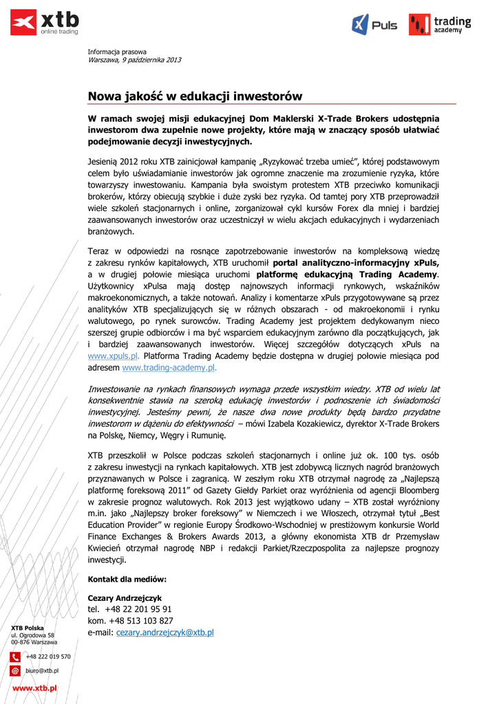 Informacja prasowa Warszawa, 9 października 2013 Nowa jakość w edukacji inwestorów W ramach swojej misji edukacyjnej Dom Maklerski X-Trade Brokers udostępnia inwestorom dwa zupełnie nowe projekty, które mają w znaczący sposób ułatwiać podejmowanie decyzji inwestycyjnych. Jesienią 2012 roku XTB zainicjował kampanię „Ryzykować trzeba umieć”, której podstawowym celem było uświadamianie inwestorów jak ogromne znaczenie ma zrozumienie ryzyka, które towarzyszy inwestowaniu. Kampania była swoistym protestem XTB przeciwko komunikacji brokerów, którzy obiecują szybkie i duże zyski bez ryzyka. Od tamtej pory XTB przeprowadził wiele szkoleń stacjonarnych i online, zorganizował cykl kursów Forex dla mniej i bardziej zaawansowanych inwestorów oraz uczestniczył w wielu akcjach edukacyjnych i wydarzeniach branżowych. Teraz w odpowiedzi na rosnące zapotrzebowanie inwestorów na kompleksową wiedzę z zakresu rynków kapitałowych, XTB uruchomił portal analityczno-informacyjny xPuls, a w drugiej połowie miesiąca uruchomi platformę edukacyjną Trading Academy. Użytkownicy xPulsa mają dostęp najnowszych informacji rynkowych, wskaźników makroekonomicznych, a także notowań. Analizy i komentarze xPuls przygotowywane są przez analityków XTB specjalizujących się w różnych obszarach - od makroekonomii i rynku walutowego, po rynek surowców. Trading Academy jest projektem dedykowanym nieco szerszej grupie odbiorców i ma być wsparciem edukacyjnym zarówno dla początkujących, jak i bardziej zaawansowanych inwestorów. Więcej szczegółów dotyczących xPuls na www.xpuls.pl. Platforma Trading Academy będzie dostępna w drugiej połowie miesiąca pod adresem www.trading-academy.pl. Inwestowanie na rynkach finansowych wymaga przede wszystkim wiedzy. XTB od wielu lat konsekwentnie stawia na szeroką edukację inwestorów i podnoszenie ich świadomości inwestycyjnej. Jesteśmy pewni, że nasze dwa nowe produkty będą bardzo przydatne inwestorom w dążeniu do efektywności – mówi Izabela Kozakiewicz, dyrektor X-Trade Brokers na Polskę, Niemcy, Węgry i Rumunię. XTB przeszkolił w Polsce podczas szkoleń stacjonarnych i online już ok. 100 tys. osób z zakresu inwestycji na rynkach kapitałowych. XTB jest zdobywcą licznych nagród branżowych przyznawanych w Polsce i zagranicą. W zeszłym roku XTB otrzymał nagrodę za „Najlepszą platformę foreksową 2011” od Gazety Giełdy Parkiet oraz wyróżnienia od agencji Bloomberg w zakresie prognoz walutowych. Rok 2013 jest wyjątkowo udany – XTB został wyróżniony m.in. jako „Najlepszy broker foreksowy” w Niemczech i we Włoszech, otrzymał tytuł „Best Education Provider” w regionie Europy Środkowo-Wschodniej w prestiżowym konkursie World Finance Exchanges & Brokers Awards 2013, a główny ekonomista XTB dr Przemysław Kwiecień otrzymał nagrodę NBP i redakcji Parkiet/Rzeczpospolita za najlepsze prognozy inwestycji. Kontakt dla mediów: Cezary Andrzejczyk XTB Polska ul. Ogrodowa 58 00-876 Warszawa +48 222 019 570 [email protected] www.xtb.pl tel. +48 22 201 95 91 kom. +48 513 103 827 e-mail: [email protected]