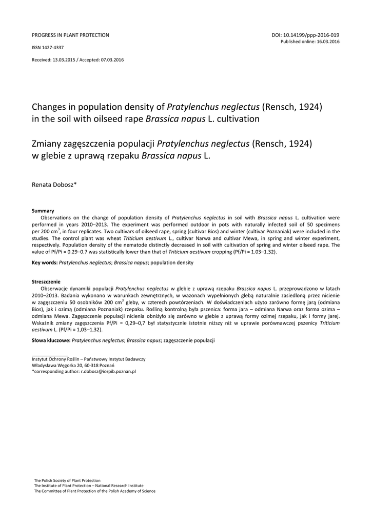 PROGRESS IN PLANT PROTECTION 55 (4): xxx-xxx, 2015 ISSN 1427-4337 DOI: 10.14199/ppp-2016-019 Published online: 16.03.2016 Received: 13.03.2015 / Accepted: 07.03.2016 Changes in population density of Pratylenchus neglectus (Rensch, 1924) in the soil with oilseed rape Brassica napus L. cultivation Zmiany zagęszczenia populacji Pratylenchus neglectus (Rensch, 1924) w glebie z uprawą rzepaku Brassica napus L. Renata Dobosz* Summary Observations on the change of population density of Pratylenchus neglectus in soil with Brassica napus L. cultivation were performed in years 2010–2013. The experiment was performed outdoor in pots with naturally infected soil of 50 specimens 3 per 200 cm , in four replicates. Two cultivars of oilseed rape, spring (cultivar Bios) and winter (cultivar Poznaniak) were included in the studies. The control plant was wheat Triticium aestivum L., cultivar Narwa and cultivar Mewa, in spring and winter experiment, respectively. Population density of the nematode distinctly decreased in soil with cultivation of spring and winter oilseed rape. The value of Pf/Pi = 0.29–0.7 was statistically lower than that of Triticium aestivum cropping (Pf/Pi = 1.03–1.32). Key words: Pratylenchus neglectus; Brassica napus; population density Streszczenie Obserwacje dynamiki populacji Pratylenchus neglectus w glebie z uprawą rzepaku Brassica napus L. przeprowadzono w latach 2010–2013. Badania wykonano w warunkach zewnętrznych, w wazonach wypełnionych glebą naturalnie zasiedloną przez nicienie 3 w zagęszczeniu 50 osobników 200 cm gleby, w czterech powtórzeniach. W doświadczeniach użyto zarówno formę jarą (odmiana Bios), jak i ozimą (odmiana Poznaniak) rzepaku. Rośliną kontrolną była pszenica: forma jara – odmiana Narwa oraz forma ozima – odmiana Mewa. Zagęszczenie populacji nicienia obniżyło się zarówno w glebie z uprawą formy ozimej rzepaku, jak i formy jarej. Wskaźnik zmiany zagęszczenia Pf/Pi = 0,29–0,7 był statystycznie istotnie niższy niż w uprawie porównawczej pszenicy Triticium aestivum L. (Pf/Pi = 1,03–1,32). Słowa kluczowe: Pratylenchus neglectus; Brassica napus; zagęszczenie populacji Instytut Ochrony Roślin – Państwowy Instytut Badawczy Władysława Węgorka 20, 60-318 Poznań *corresponding author: [email protected] The Polish Society of Plant Protection The Institute of Plant Protection – National Research Institute The Committee of Plant Protection of the Polish Academy of Science 2 Pratylenchus neglectus w uprawie rzepaku / Pratylenchus neglectus in oilseed rape cultivation Wstęp / Introduction Oprócz soi Glycine max (L.) i słonecznika Helianthus annuus L., rzepak Brassica napus L. jest jednym z najważniejszych gatunków roślin oleistych uprawianych na świecie. Największymi producentami tej rośliny są Chiny, Kanada oraz Indie, gdzie produkcja osiąga odpowiednio 25, 20 i 14% ogólnej uprawy rzepaku na świecie (FAO). Według Głównego Urzędu Statystycznego areał przeznaczony pod uprawę rzepaku w Polsce osiągnął w 2013 roku około 0,9 mln ha i wzrósł w przybliżeniu o 25 procent w stosunku do powierzchni gruntów objętych uprawą tej rośliny w roku 2012 (www.stat.gov.pl). Rzepak jest rośliną o szerokim zastosowaniu wykorzystywaną w przemyśle spożywczym, do produkcji biopaliw, a także jako źródło wysokobiałkowych pasz w hodowli zwierząt. Wszystkie gatunki rodzaju Pratylenchus Filipjev, 1936 są obligatoryjnymi pasożytami roślin, a w ich cyklu osobniczym wyodrębnia się sześć stadiów rozwojowych: stadium jaja, formy młodociane J2–J4 oraz formy dorosłe. Wszystkie stadia z wyjątkiem jaj posiadają zdolność ruchu, co umożliwia aktywne ich przemieszczanie się w glebie. Obserwacje długości cyklu rozwojowego P. penetrans (Cobb, 1917) (Mizukubo i Adachi 1997; Wu i wsp. 2002), P. coffae (Zimmermann, 1898) i P. loosi Loof, 1960 (Wu i wsp. 2002) oraz P. thornei Sher et Allen, 1953 (Castillo i wsp. 1995) i P. zeae Graham, 1951 (Meyer 1985), przeprowadzone w warunkach kontrolowanych pokazały, że czas trwania cyklu rozwojowego wynosi od 22 do 46 dni i zależy od wilgotności, temperatury, roślinyżywiciela i gatunku nicienia. Ponadto, również w warunkach laboratoryjnych, zaobserwowano, że wydzieliny korzeni kukurydzy wpływają na proces opuszczania jaj przez formy J2 P. zeae (De Waele i wsp. 1988). Poza obszarem Antarktydy, występowanie korzeniaka pospolitego P. neglectus (Rensch, 1924) zostało odnotowane na wszystkich kontynentach. Gatunek ten znajdowany był w tkankach korzeni i w glebie otaczającej systemy korzeniowe zarówno roślin dziko rosnących, jak i uprawnych: zbóż, strączkowych, okopowych, truskawki oraz rzepaku (Wolny 1990; Castillo i Volvas 2007; Kumari 2012). Badania Wolnego (1990) wykazały, że P. neglectus wystąpił aż w 56% prób zebranych z pól, na których uprawiano rzepak ozimy wykazujący objawy zahamowania wzrostu. Niektóre gatunki i odmiany zbóż oraz roślin uprawnych z rodziny bobowatych Fabaceae Lindl. nie wpływają na poziom zagęszczenia populacji Pratylenchus spp. w glebie utrzymując liczebność na stałym poziomie, inne natomiast modyfikują zagęszczenie populacji korzeniaków prowadząc do wzrostu lub obniżenia liczebności populacji tych nicieni w glebie (Al-Rehiayani i Hafez 1998; Di Vito i wsp. 2000; Tylor i wsp. 2000; Ballard i wsp. 2006). Na zagęszczenie populacji korzeniaków oddziałują również rośliny z rodziny krzyżowych Brassicaceae Burnett. W badaniach in vitro z użyciem rzepaku swoją liczebność zmniejszyły populacje P. crenatus Loof, 1960, P. thornei, P. fallax Seinhorst, 1968, P. penetrans oraz P. pinguicaudatus Corbett, 1969, przy czym rośliną porównawczą była wówczas kukurydza (Webb 1990, 1996). W doświadczeniu z uprawą rzepaku w kontro- lowanych warunkach szklarni zmniejszyła się liczebność populacji P. scribneri Steiner, 1943 (Bernard i Montgomery-Dee 1993), a uprawa rzepy Brassica rapa L. i gorc