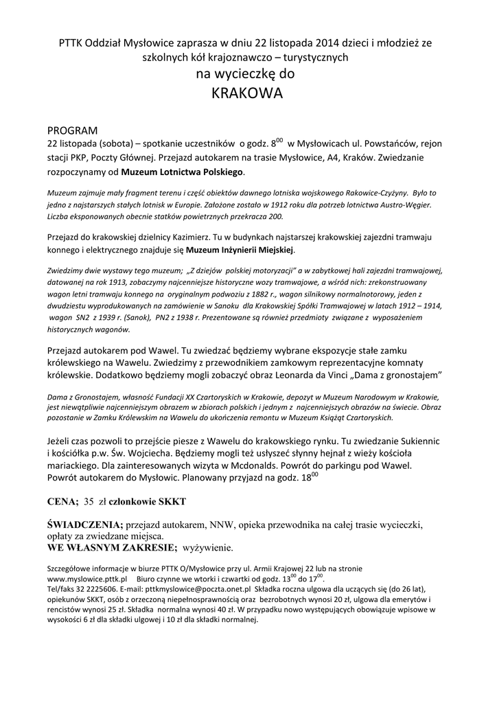 PTTK Oddział Mysłowice zaprasza w dniu 22 listopada 2014 dzieci i młodzież ze szkolnych kół krajoznawczo – turystycznych na wycieczkę do KRAKOWA PROGRAM 22 listopada (sobota) – spotkanie uczestników o godz. 800 w Mysłowicach ul. Powstańców, rejon stacji PKP, Poczty Głównej. Przejazd autokarem na trasie Mysłowice, A4, Kraków. Zwiedzanie rozpoczynamy od Muzeum Lotnictwa Polskiego. Muzeum zajmuje mały fragment terenu i część obiektów dawnego lotniska wojskowego Rakowice-Czyżyny. Było to jedno z najstarszych stałych lotnisk w Europie. Założone zostało w 1912 roku dla potrzeb lotnictwa Austro-Węgier. Liczba eksponowanych obecnie statków powietrznych przekracza 200. Przejazd do krakowskiej dzielnicy Kazimierz. Tu w budynkach najstarszej krakowskiej zajezdni tramwaju konnego i elektrycznego znajduje się Muzeum Inżynierii Miejskiej. Zwiedzimy dwie wystawy tego muzeum; „Z dziejów polskiej motoryzacji” a w zabytkowej hali zajezdni tramwajowej, datowanej na rok 1913, zobaczymy najcenniejsze historyczne wozy tramwajowe, a wśród nich: zrekonstruowany wagon letni tramwaju konnego na oryginalnym podwoziu z 1882 r., wagon silnikowy normalnotorowy, jeden z dwudziestu wyprodukowanych na zamówienie w Sanoku dla Krakowskiej Spółki Tramwajowej w latach 1912 – 1914, wagon SN2 z 1939 r. (Sanok), PN2 z 1938 r. Prezentowane są również przedmioty związane z wyposażeniem historycznych wagonów. Przejazd autokarem pod Wawel. Tu zwiedzać będziemy wybrane ekspozycje stałe zamku królewskiego na Wawelu. Zwiedzimy z przewodnikiem zamkowym reprezentacyjne komnaty królewskie. Dodatkowo będziemy mogli zobaczyć obraz Leonarda da Vinci „Dama z gronostajem” Dama z Gronostajem, własność Fundacji XX Czartoryskich w Krakowie, depozyt w Muzeum Narodowym w Krakowie, jest niewątpliwie najcenniejszym obrazem w zbiorach polskich i jednym z najcenniejszych obrazów na świecie. Obraz pozostanie w Zamku Królewskim na Wawelu do ukończenia remontu w Muzeum Książąt Czartoryskich. Jeżeli czas pozwoli to przejście piesze z Wawelu do krakowskiego rynku. Tu zwiedzanie Sukiennic i kościółka p.w. Św. Wojciecha. Będziemy mogli też usłyszeć słynny hejnał z wieży kościoła mariackiego. Dla zainteresowanych wizyta w Mcdonalds. Powrót do parkingu pod Wawel. Powrót autokarem do Mysłowic. Planowany przyjazd na godz. 1800 CENA; 35 zł członkowie SKKT ŚWIADCZENIA; przejazd autokarem, NNW, opieka przewodnika na całej trasie wycieczki, opłaty za zwiedzane miejsca. WE WŁASNYM ZAKRESIE; wyżywienie. Szczegółowe informacje w biurze PTTK O/Mysłowice przy ul. Armii Krajowej 22 lub na stronie 00 00 www.myslowice.pttk.pl Biuro czynne we wtorki i czwartki od godz. 13 do 17 . Tel/faks 32 2225606. E-mail: [email protected] Składka roczna ulgowa dla uczących się (do 26 lat), opiekunów SKKT, osób z orzeczoną niepełnosprawnością oraz bezrobotnych wynosi 20 zł, ulgowa dla emerytów i rencistów wynosi 25 zł. Składka normalna wynosi 40 zł. W przypadku nowo występujących obowiązuje wpisowe w wysokości 6 zł dla składki ulgowej i 10 zł dla składki normalnej.