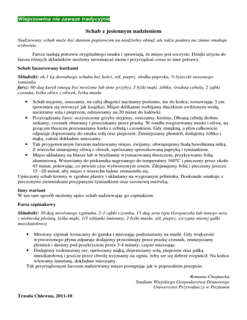 Wieprzowina nie zawsze tradycyjnie Schab z jesiennym nadzieniem Nadziewany schab moŜe być daniem popisowym na niedzielny obiad, ale takŜe podany na zimno smakuje wybornie. Farsze nadają potrawie oryginalnego smaku i sprawiają, Ŝe mięso jest soczyste. Dzięki uŜyciu do farszu róŜnych składników moŜemy urozmaicać menu i przyrządzać coraz to inne potrawy. Schab faszerowany kurkami Składniki: ok.1 kg dorodnego schabu bez kości, sól, pieprz, słodka papryka, ½ łyŜeczki suszonego tymianku farsz: 60 dag kurek (mogą być mroŜone lub inne grzyby), 2 łyŜki mąki, Ŝółtko, średnia cebula, 2 ząbki czosnku, łyŜka oliwy z oliwek, łyŜka masła Schab myjemy, osuszamy, na całej długości nacinamy poziomo, nie do końca, zostawiając 3 cm (powinien się otworzyć jak ksiąŜka). Mięso delikatnie rozbijamy tłuczkiem zwilŜonym wodą, nacieramy solą i pieprzem, odstawiamy na 20 minut do lodówki. • Przyrządzamy farsz: oczyszczone grzyby myjemy, osuszamy, kroimy, Obraną cebulę drobno siekamy, czosnek obieramy i przeciskamy przez praskę. W rondlu rozgrzewamy masło i oliwę, na gorącym tłuszczu przesmaŜamy kurki z cebulą i czosnkiem. Gdy zmiękną, a płyn całkowicie odparuje doprawiamy do smaku solą oraz pieprzem. Zmniejszamy płomień, dodajemy Ŝółtko i mąkę, całość dokładnie mieszamy. • Tak przygotowanym farszem nadziewamy mięso, zwijamy, obwiązujemy białą bawełnianą nitką. Z wierzchu smarujemy oliwą z oliwek, oprószamy sproszkowaną papryką i tymiankiem. • Mięso układamy na blasze lub w brytfannie wysmarowanej tłuszczem, przykrywamy folią aluminiową. Wstawiamy do piekarnika nagrzanego do temperatury 160°C i pieczemy przez około 45 minut, polewając, co pewien czas wytworzonym sosem. Zdejmujemy folię i pieczemy jeszcze 15 –20 minut, aby mięso z wierzchu ładnie zrumieniło się. Upieczony schab kroimy w zgrabne plastry i układamy na wygrzanym półmisku. Doskonale smakuje z pieczonymi ziemniakami posypanymi tymiankiem oraz sezonową surówką. • Inny wariant W ten sam sposób moŜemy upiec schab nadziewając go szpinakiem. Farsz szpinakowy Składniki: 50 dag mroŜonego szpinaku, 2-3 ząbki czosnku, 15 dag sera typu Gorgonzola lub innego sera z niebieską pleśnią, łyŜka mąki, 1/3 szklanki śmietany, 2 łyŜki masła, sól, pieprz, szczypta startej gałki muszkatołowej MroŜony szpinak wrzucamy do garnka i mieszając podsmaŜamy na maśle. Gdy większość wytworzonego płynu odparuje dodajemy przeciśnięty przez praskę czosnek, zmniejszamy płomień i dusimy pod przykryciem przez 3-4 minuty, często mieszając. • Dodajemy rozkruszony ser, oprószamy mąką, doprawiamy solą, pieprzem oraz gałką muszkatołową i jeszcze przez chwilę trzymamy na ogniu, Ŝeby ser się dobrze rozpuścił. Na końcu wlewamy śmietanę, dokładnie mieszamy. Tak przyrządzonym farszem nadziewamy mięso postępując jak w poprzednim przepisie. • Romana Chojnacka Studium Wiejskiego Gospodarstwa Domowego Uniwersytet Przyrodniczy w Poznaniu Trzoda Chlewna, 2011-10