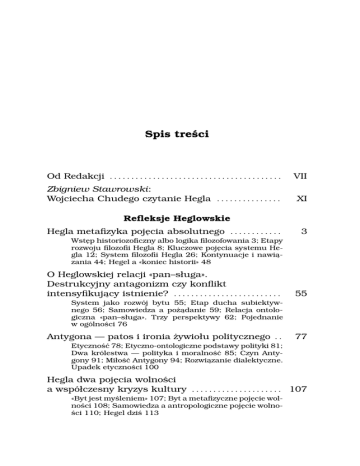 Spis treści Od Redakcji . . . . . . . . . . . . . . . . . . . . . . . . . . . . . . . . . . . . . . . . VII Zbigniew Stawrowski: Wojciecha Chudego czytanie Hegla . . . . . . . . . . . . . . . XI Refleksje Heglowskie Hegla metafizyka poje˛cia absolutnego . . . . . . . . . . . . 3 Wste˛p historiozoficzny albo logika filozofowania 3; Etapy rozwoju filozofii Hegla 8; Kluczowe poje˛cia systemu Hegla 12; System filozofii Hegla 26; Kontynuacje i nawia˛zania 44; Hegel a «koniec historii» 48 O Heglowskiej relacji «pan–sługa». Destrukcyjny antagonizm czy konflikt intensyfikuja˛cy istnienie? . . . . . . . . . . . . . . . . . . . . . . . . . 55 System jako rozwój bytu 55; Etap ducha subiektywnego 56; Samowiedza a poża˛danie 59; Relacja ontologiczna «pan–sługa». Trzy perspektywy 62; Pojednanie w ogólności 76 Antygona — patos i ironia żywiołu politycznego . . 77 Etyczność 78; Etyczno-ontologiczne podstawy polityki 81; Dwa królestwa — polityka i moralność 85; Czyn Antygony 91; Miłość Antygony 94; Rozwia˛zanie dialektyczne. Upadek etyczności 100 Hegla dwa poje˛cia wolności a współczesny kryzys kultury . . . . . . . . . . . . . . . . . . . . . 107 «Byt jest myśleniem» 107; Byt a metafizyczne poje˛cie wolności 108; Samowiedza a antropologiczne poje˛cie wolności 110; Hegel dziś 113 VI Spis treści Filozofia dialektycznej refleksji . . . . . . . . . . . . . . . . . . . . 117 Filozofia i rzeczywistość jako system zontologizowanej refleksji 120; Spekulatywne rozwia˛zanie problemu refleksji 148 Zamiast zakończenia. Świat jako kultura . . . . . . . . 197 Uwaga meta-metafizyczna 200 Informacja o pierwodrukach . . . . . . . . . . . . . . . . . . . . . . 202 Indeks osób i postaci . . . . . . . . . . . . . . . . . . . . . . . . . . . . . . 203 Nota biograficzna . . . . . . . . . . . . . . . . . . . . . . . . . . . . . . . . . . 207 Publikacje Wojciecha Chudego . . . . . . . . . . . . . . . . . . . . 209