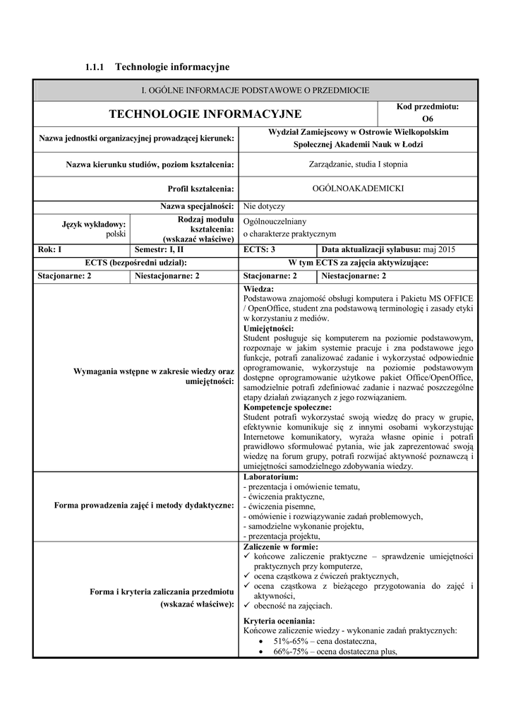 1.1.1 Technologie informacyjne I. OGÓLNE INFORMACJE PODSTAWOWE O PRZEDMIOCIE Kod przedmiotu: O6 TECHNOLOGIE INFORMACYJNE Nazwa jednostki organizacyjnej prowadzącej kierunek: Wydział Zamiejscowy w Ostrowie Wielkopolskim Społecznej Akademii Nauk w Łodzi Zarządzanie, studia I stopnia Nazwa kierunku studiów, poziom kształcenia: OGÓLNOAKADEMICKI Profil kształcenia: Język wykładowy: polski Rok: I Nazwa specjalności: Rodzaj modułu kształcenia: (wskazać właściwe) Semestr: I, II ECTS (bezpośredni udział): Stacjonarne: 2 Niestacjonarne: 2 Wymagania wstępne w zakresie wiedzy oraz umiejętności: Forma prowadzenia zajęć i metody dydaktyczne: Forma i kryteria zaliczania przedmiotu (wskazać właściwe): Nie dotyczy Ogólnouczelniany o charakterze praktycznym ECTS: 3 Data aktualizacji sylabusu: maj 2015 W tym ECTS za zajęcia aktywizujące: Stacjonarne: 2 Niestacjonarne: 2 Wiedza: Podstawowa znajomość obsługi komputera i Pakietu MS OFFICE / OpenOffice, student zna podstawową terminologię i zasady etyki w korzystaniu z mediów. Umiejętności: Student posługuje się komputerem na poziomie podstawowym, rozpoznaje w jakim systemie pracuje i zna podstawowe jego funkcje, potrafi zanalizować zadanie i wykorzystać odpowiednie oprogramowanie, wykorzystuje na poziomie podstawowym dostępne oprogramowanie użytkowe pakiet Office/OpenOffice, samodzielnie potrafi zdefiniować zadanie i nazwać poszczególne etapy działań związanych z jego rozwiązaniem. Kompetencje społeczne: Student potrafi wykorzystać swoją wiedzę do pracy w grupie, efektywnie komunikuje się z innymi osobami wykorzystując Internetowe komunikatory, wyraża własne opinie i potrafi prawidłowo sformułować pytania, wie jak zaprezentować swoją wiedzę na forum grupy, potrafi rozwijać aktywność poznawczą i umiejętności samodzielnego zdobywania wiedzy. Laboratorium: - prezentacja i omówienie tematu, - ćwiczenia praktyczne, - ćwiczenia pisemne, - omówienie i rozwiązywanie zadań problemowych, - samodzielne wykonanie projektu, - prezentacja projektu, Zaliczenie w formie: końcowe zaliczenie praktyczne – sprawdzenie umiejętności praktycznych przy komputerze, ocena cząstkowa z ćwiczeń praktycznych, ocena cząstkowa z bieżącego przygotowania do zajęć i aktywności, obecność na zajęciach. Kryteria oceniania: Końcowe zaliczenie wiedzy - wykonanie zadań praktycznych: 51%-65% – cena dostateczna, 66%-75% – ocena dostateczna plus, Katedra (Zakład) odpowiedzialna za przedmiot: Osoba koordynująca przedmiot: 76%-85% – ocena dobra, 86%-93% – ocena dobra plus, 94%-100% – ocena bardzo dobra Kryteria oceny podsumowującej: 70% oceny podsumowującej stanowi ocena z zadań praktycznych, 20% oceny podsumowującej stanowi ocena realizacji zadań w ramach ćwiczeń, 10% aktywność na zajęciach, frekwencja. Zakład Technologii Programowania, Sieci i Grafiki komputerowej Mgr inż. Janina Grobelna II. WYMIAR GODZINOWY ZAJĘĆ ORAZ INDYWIDUALNEJ PRACY WŁASNEJ STUDENTA Ogólna liczba godzin zajęć dydaktycznych na studiach stacjonarnych i niestacjonarnych z podziałem na formy: St udi a st acj onar ne Wykład: St udi a nie st ac j ona rne Wykład: Ćwiczenia: Konwersatorium: Laboratorium: Ćwiczenia projektowe: Ćwiczenia: Konwersatorium: 45 Laboratorium: Ćwiczenia projektowe: Warsztaty: 36 Warsztaty: Seminarium: Seminarium: Zajęcia terenowe: Zajęcia terenowe: Praktyki: Konsultacje przedmiotowe: Praktyki: Konsultacje przedmiotowe: Egzaminy i zaliczenia w sesji Inna forma (jaka): 6 Egzaminy i zaliczenia w sesji Inna forma (jaka): 4 RAZEM: Praca własna studenta (PWS): 51 24 RAZEM: Praca własna studenta (PWS): 40 35 RAZEM z PWS: 75 RAZEM z PWS: Sumaryczne obciążenie pracą studenta wg form aktywności: 75 Szacowana liczba godzin potrzebnych na zrealizowanie aktywności: Forma aktywności: studia stacjonarne studia niestacjonarne Godziny realizowane w bezpośrednim kontakcie z nauczycielem akademickim: Praca własna studenta/związana z prowadzonymi badaniami naukowymi: Przygotowanie się do zajęć Przygotowanie esejów/prezentacji/referatów 51 24 40 35 4 10 Wykonanie projektów Zapoznanie z literaturą podstawową 10 10 4 5 6 10 75 75 Pisemna praca zaliczeniowa Przygotowanie do egzaminu Przygotowanie do zaliczenia SUMA: III. TREŚCI KSZTAŁCENIA Treści kształcenia (uszczegółowione, zaprezentowane z podziałem na poszczególne formy zajęć, opis szczegółowy poszczególnych bloków kształcenia): Laboratorium: 1. 2. 3. 4. 5. 6. 7. 8. Architektura komputera. Przegląd urządzeń peryferyjnych. Systemy zapisu i archiwizacji informacji cyfrowej. Poznanie systemu operacyjnego na przykładzie systemu MS Windows. Oprogramowanie narzędziowe, aplikacje użytkowe, licencjonowanie oprogramowa-nia, prawo autorskie. Oprogramowania użytkowe na przykładzie wybranych aplikacji MS Office (Word, Excel, Power Point). Sieci komputerowe – rodzaje, architektura, media transmisyjne, adresowanie. Zabezpieczenia systemów i sieci komputerowych. Technologie komunikacji internetowej – poczta, chat, VoIP. Przegladarki internetowe. Zasoby informacji w Internecie, wyszukiwanie i wiarygodność danych. IV. OBSZAROWE I KIERUNKOWE EFEKTY KSZTAŁCENIA Kod wg KEK: Wiedza: Kod KRK: K_W14 zna standardowe metody statystyczne oraz wybrane inne metody ilościowe a także narzędzia informatyczne gromadzenia, analizy i prezentacji danych ekonomicznych i społecznych S1A_W06 K_W18 posiada elementarną wiedzę na temat istoty i znaczenia wybranych norm i standardów w poszczególnych obszarach działalności organizacji (np. standardy rachunkowości, standardy znormalizowanych systemów zarządzania, normy pracy itp.) S1A_W07 K_W08 zna obszary funkcjonalne organizacji oraz podstawowe relacje pomiędzy tymi obszarami S1A_W02, S1A_W03 Kod wg KEK: Umiejętności: Kod KRK: K_U03 ma umiejętność stosowania wybranych elementów wiedzy specjalistycznej do współpracy z przedstawicielami innych obszarów funkcjonalnych w