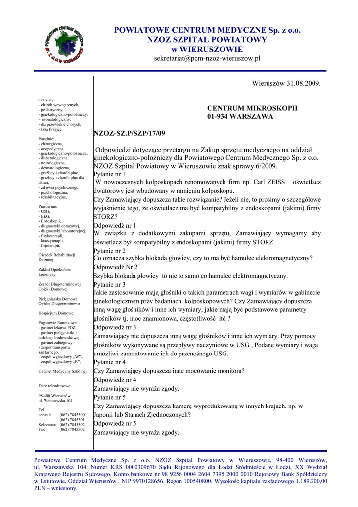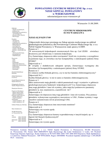 POWIATOWE CENTRUM MEDYCZNE Sp. z o.o. NZOZ SZPITAL POWIATOWY w WIERUSZOWIE [email protected] Wieruszów 31.08.2009. Oddziały: - chorób wewnętrznych, - pediatryczny, - ginekologiczno-połoŜniczy, - neonatologiczny, - dla przewlekle chorych, - Izba Przyjęć. Poradnie: - chirurgiczna, - ortopedyczna, - ginekologiczno-połoŜnicza, - diabetologiczna, - neurologiczna, - dermatologiczna, - gruźlicy i chorób płuc, - gruźlicy i chorób płuc dla dzieci, - zdrowia psychicznego, - psychologiczna, - rehabilitacyjna, Pracownie: - USG, - EKG, - Endoskopii, - diagnostyki obrazowej, - diagnostyki laboratoryjnej, - fizykoterapii, - kinezyterapii, - fizjoterapii, Ośrodek Rehabilitacji Dziennej Zakład OpiekuńczoLeczniczy Zespół Długoterminowej Opieki Domowej Pielęgniarska Domowa Opieka Długoterminowa Hospicjum Domowe Pogotowie Ratunkowe - gabinet lekarza POZ, - gabinet pielęgniarki i połoŜnej środowiskowej, - gabinet zabiegowy, - zespół transportu sanitarnego, - zespół wyjazdowy „W”, - zespół wyjazdowy „R”, Gabinet Medycyny Szkolnej Dane teleadresowe: 98-400 Wieruszów ul. Warszawska 104 Tel. centrala (062) 7845500 (062) 7845501 Sekretariat (062) 7845502 Fax (062) 7845502 CENTRUM MIKROSKOPII 01-934 WARSZAWA NZOZ-SZ.P/SZP/17/09 Odpowiedzi dotyczące przetargu na Zakup sprzętu medycznego na oddział ginekologiczno-połoŜniczy dla Powiatowego Centrum Medycznego Sp. z o.o. NZOZ Szpital Powiatowy w Wieruszowie znak sprawy 6/2009. Pytanie nr 1 W nowoczesnych kolposkopach renomowanych firm np. Carl ZEISS oświetlacz dwutorowy jest wbudowany w ramieniu kolposkopu. Czy Zamawiający dopuszcza takie rozwiązanie? JeŜeli nie, to prosimy o szczegółowe wyjaśnienie tego, Ŝe oświetlacz ma być kompatybilny z endoskopami (jakimi) firmy STORZ? Odpowiedź nr 1 W związku z dodatkowymi zakupami sprzętu, Zamawiający wymagamy aby oświetlacz był kompatybilny z endoskopami (jakimi) firmy STORZ. Pytanie nr 2 Co oznacza szybka blokada głowicy, czy to ma być hamulec elektromagnetyczny? Odpowiedź Nr 2 Szybka blokada głowicy to nie to samo co hamulec elektromagnetyczny. Pytanie nr 3 Jakie zastosowanie mają głośniki o takich parametrach wagi i wymiarów w gabinecie ginekologicznym przy badaniach kolposkopowych? Czy Zamawiający dopuszcza inną wagę głośników i inne ich wymiary, jakie mają być podstawowe parametry głośników tj. moc znamionowa, częstotliwość itd ? Odpowiedź nr 3 Zamawiający nie dopuszcza inną wagę głośników i inne ich wymiary. Przy pomocy głośników wykonywane są przepływy naczyniowe w USG , Podane wymiary i waga umoŜliwi zamontowanie ich do przenośnego USG. Pytanie nr 4 Czy Zamawiający dopuszcza inne mocowanie monitora? Odpowiedź nr 4 Zamawiający nie wyraŜa zgody. Pytanie nr 5 Czy Zamawiający dopuszcza kamerę wyprodukowaną w innych krajach, np. w Japonii lub Stanach Zjednoczonych? Odpowiedź nr 5 Zamawiający nie wyraŜa zgody. Powiatowe Centrum Medyczne Sp. z o.o. NZOZ Szpital Powiatowy w Wieruszowie, 98-400 Wieruszów, ul. Warszawska 104. Numer KRS 0000309670 Sądu Rejonowego dla Łodzi Śródmieście w Łodzi, XX Wydział Krajowego Rejestru Sądowego. Konto bankowe nr 98 9256 0004 2604 7395 2000 0010 Rejonowy Bank Spółdzielczy w Lututowie, Oddział Wieruszów . NIP 9970128656. Regon 100540800. Wysokość kapitału zakładowego 1.189.200,00 PLN – wniesiony.