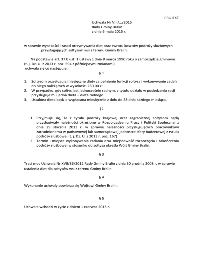 PROJEKT Uchwała Nr VIII/…/2015 Rady Gminy Bralin z dnia 6 maja 2015 r. w sprawie wysokości i zasad otrzymywania diet oraz zwrotu kosztów podróży służbowych przysługujących sołtysom wsi z terenu Gminy Bralin. Na podstawie art. 37 b ust. 1 ustawy z dnia 8 marca 1990 roku o samorządzie gminnym (t. j. Dz. U. z 2013 r. poz. 594 z późniejszymi zmianami) uchwala się co następuje: §1 1. 2. 3. Sołtysom przysługują miesięczne diety za pełnienie funkcji sołtysa i wykonywanie zadań do niego należących w wysokości 260,00 zł. W przypadku, gdy sołtys jest jednocześnie radnym, z tytułu udziału w posiedzeniu sesji przysługuje mu jedna dieta – dieta radnego. Ustalona dieta będzie wypłacana miesięcznie z dołu do 28 dnia każdego miesiąca. §2 1. Przyjmuje się, że z tytułu podróży krajowej oraz zagranicznej sołtysom będą przysługiwały należności określone w Rozporządzeniu Pracy i Polityki Społecznej z dnia 29 stycznia 2013 r. w sprawie należności przysługujących pracownikowi zatrudnionemu w państwowej lub samorządowej jednostce sfery budżetowej z tytułu podróży służbowej (t. j. Dz. U. z 2013 r. poz. 167) 2. Termin i miejsce wykonywania zadania oraz miejscowość rozpoczęcia i zakończenia podróży służbowej w stosunku do sołtysa określa Wójt Gminy Bralin. §3 Traci moc Uchwała Nr XVII/86/2012 Rady Gminy Bralin z dnia 30 grudnia 2008 r. w sprawie ustalenia diet dla sołtysów wsi z terenu Gminy Bralin . §4 Wykonanie uchwały powierza się Wójtowi Gminy Bralin. §5 Uchwała wchodzi w życie z dniem 1 czerwca 2015 r. Uzasadnienie: Podstawą prawną uregulowania kwestii diet oraz zwrotu kosztów podróży służbowej dla sołtysów jest przepis art. 37b ust. 1 ustawy z dnia 8 marca 1990 r. o samorządzie gminnym, zgodnie z którym rada gminy może ustanowić zasady, na jakich przewodniczącemu organu wykonawczego jednostki pomocniczej będzie przysługiwała dieta oraz zwrot kosztów podróży służbowej.
