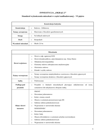 INWESTYCJA „OKRĄG 2” Standard wykończenia mieszkań w części nadbudowanej – VI piętro Konstrukcja budynku Konstrukcja o Stalowo - Żelbetowa Ściany zewnętrzne o Murowane z bloczków gazobetonowych Stropy o Na belkach stalowych Dach o Stropodach Wysokość mieszkań o Około 2,9 m. Mieszkania o Drzwi o odp. ogniowej EI30 o Drzwi dwuskrzydłowe, antywłamaniowe np.: firmy Dierre o Okładzina drewnopodobna o Elementy stalowe zabezpieczone antykorozyjnie o Ościeżnica stalowa o Klamki i szyldy stalowe o Ściany wewnętrzne międzylokalowe warstwowe z bloczków gipsowych o Ściany wewnętrzne działowe z bloczków gipsowych Sufity o Podwieszane Podłoga pod o Posadzki w lokalach mieszkalnych pływające oddylatowane od ścian, Drzwi wejściowe Ściany wewnętrzne cementowe lub anhydrytowe zbrojone siatką posadzki FRONT Okna i drzwi o Drewniane jednoramowe o Kolor: ciemny orzech o Okucia z systemem przesuwnym typu HS o Szklone szkłem jednokomorowym o Wyposażone w nawiewniki okienne DZIEDZINIEC tarasowe o Drewniane jednoramowe o Kolor: biały o Okucia obwiedniowe z systemem uchylno-rozwieralnym o Szklone szkłem jednokomorowym o Wyposażone w nawiewniki okienne 1 Drzwi wewnętrzne o Otwory przygotowane do montażu ościeżnic regulowanych i drzwi o Przygotowane podejścia do zamontowania urządzeń (zlewozmywak z baterią, zmywarka, lodówka, kuchnia elektryczna) w miejscach przewidzianych w projekcie Kuchnia o Ściany - tynk gipsowy maszynowy (stosowany do pomieszczeń o podwyższonej wilgotności) o Przygotowane podejścia do zamontowania urządzeń w miejscach przewidzianych w projekcie (pralka, umywalka, miska ustępowa, wanna lub natrysk) o Bez białego montażu o Ściany zewnętrzne – tynk gipsowy maszynowy ( stosowany do pomieszczeń o Łazienka podwyższonej wilgotności), w miejscach pod glazurę ściany murowane gładkie bez tynku o Instalacja centralnego ogrzewania zasilana z sieci miejskiej o Instalacja lokalowa podposadzkowa (rury z tworzywa sztucznego) o Przy drzwiach tarasowych, w pasie podokiennym, grzejniki kanałowe montowane w posadzce (np. firmy PURMO, wg. projektu wykonawczego) Instalacja C.O o Grzejniki w pomieszczeniach mieszkalnych, grzejniki płytowe (np. firmy PURMO, wg. projektu wykonawczego) o W łazienkach grzejniki drabinkowe (np. firmy j.w, wg. projektu wykonawczego) o Głowice termostatyczne o Instalacja lokalowa podposadzkowa (rury z tworzywa sztucznego) o Indywidualne wodomierze Instalacja o Z tworzywa sztucznego PVC kanalizacyjna o Piony zabudowane płytami G-K lub bloczkami gipsowymi Instalacja o Wentylacja mechaniczna wentylacyjna o W kuchni dodatkowy pion do podłączenia okapu Klimatyzacja o Przygotowanie i montaż instalacji podtynkowej (bez jednostek centralnych) o Tablica mieszkaniowa natynkowa o Skrzynka instalacji internetowej i telefonicznej o Wypust 3-fazowy w kuchni do zasilania kuchenki o Instalacja zasilania zmywarki, pralki, okapu o Instalacja gniazd ogólnego przeznaczenia z osprzętem o Instalacja oświetlenia, wypusty ścienne i sufitowe do instalacji opraw (bez Instalacja wodna Instalacja elektryczna opraw) o Instalacja domofonowa o Instalacja TV Inne instalacje 2 o Instalacja telefoniczna i internetowa o Wykończone wg. projektu architektonicznego – (płytki granitowe) o Balustrady z profili stalowych Balkony 3