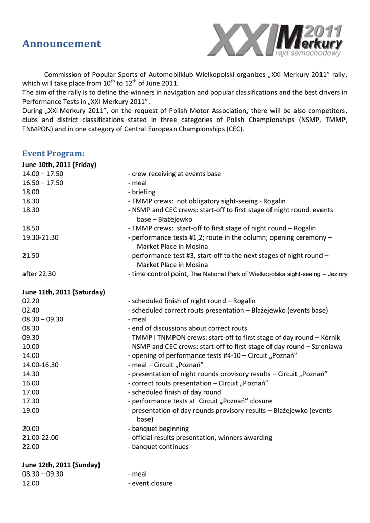 Announcement Commission of Popular Sports of Automobilklub Wielkopolski organizes „XXI Merkury 2011” rally, which will take place from 10th to 12th of June 2011. The aim of the rally is to define the winners in navigation and popular classifications and the best drivers in Performance Tests in „XXI Merkury 2011”. During „XXI Merkury 2011”, on the request of Polish Motor Association, there will be also competitors, clubs and district classifications stated in three categories of Polish Championships (NSMP, TMMP, TNMPON) and in one category of Central European Championships (CEC). Event Program: June 10th, 2011 (Friday) 14.00 – 17.50 16.50 – 17.50 18.00 18.30 18.30 18.50 19.30-21.30 21.50 after 22.30 June 11th, 2011 (Saturday) 02.20 02.40 08.30 – 09.30 08.30 09.30 10.00 14.00 14.00-16.30 14.30 16.00 17.00 17.30 19.00 - crew receiving at events base - meal - briefing - TMMP crews: not obligatory sight-seeing - Rogalin - NSMP and CEC crews: start-off to first stage of night round. events base – Błażejewko - TMMP crews: start-off to first stage of night round – Rogalin - performance tests #1,2; route in the column; opening ceremony – Market Place in Mosina - performance test #3, start-off to the next stages of night round – Market Place in Mosina - time control point, The National Park of Wielkopolska sight-seeing – Jeziory 20.00 21.00-22.00 22.00 - scheduled finish of night round – Rogalin - scheduled correct routs presentation – Błażejewko (events base) - meal - end of discussions about correct routs - TMMP i TNMPON crews: start-off to first stage of day round – Kórnik - NSMP and CEC crews: start-off to first stage of day round – Szreniawa - opening of performance tests #4-10 – Circuit „Poznao” - meal – Circuit „Poznao” - presentation of night rounds provisory results – Circuit „Poznao” - correct routs presentation – Circuit „Poznao” - scheduled finish of day round - performance tests at Circuit „Poznao” closure - presentation of day rounds provisory results – Błażejewko (events base) - banquet beginning - official results presentation, winners awarding - banquet continues June 12th, 2011 (Sunday) 08.30 – 09.30 12.00 - meal - event closure Błażejewko Rogalin Market Place in Mosina Jeziory Kórnik Szreniawa Circuit „Poznao” - 52°11'59.748"N, 17°6'34.415"E - 52°13'57"N, 16°56'10.212"E - 52°14'40.02"N, 16°51'8.747"E - 52°16'11.279"N, 16°47'55.176"E - 52°14'39.048"N, 17°5'46.464"E - 52°18'56.232"N, 16°48'3.312"E - 52°25'2.999"N, 16°47'49.055"E Event organizers: Commander Organizing Commander Navigation Commander Touristic Commander Krzysztof Pospieszny Marcin Wojcieszak Maurycy Skowrooski Michał Michalak Calculating Commission Alicja Halątka, Norbert Kuźniak, Wojciech Puchalski Itinerary Designers Ewa Szukała, Anna Sudoł, Beta Tomczak-Taisner, Krzysztof Szukała, Tomasz Sudoł, Piotr Solecki, Michał Michalak, Maurycy Skowrooski, Wojtek Puchalski Itinerary Verifiers Norbert Kuźniak, Maurycy Skowrooski, Michał Michalak, Stanisław Gurniewicz Performance Tests Referees Ewa Szukała, Teresa Bielejewska , Krzysztof Szukała, Maciej Kunkul, Józef Kunkul, Ireneusz Bielejewski, Wojtek Gabryelczyk Other Organizers: Anna Malicka, Anna Kościelna, Barbara Pospieszna, Elżbieta Salamon, Róża Szufladowicz, Małgorzata Michalak, Magdalena Solecka, Urszula Frąckowiak, Hubert Piątek, Jarosław Sulczyoski, Grzegorz Halatka, Grzegorz Rybak Fees: Fees for foreign crews taking part in CEC are stated according to CEC regulations Registration: Competitors should send filled application forms to: [email protected] till 23.05.2011 and pay the due fee on the first day of the event. Event base: Hotel Perkoz "OŚRODEK SZKOLENIOWO – WYPOCZYNKOWY BŁAŻEJEWKO" SP. Z O.O. Błażejewko, 62-035 Kórnik www.blazejewko.com.pl Detailed information for foreign crews: Barbara Pospieszna Tel +48 607 671 426 [email protected] Final provisions: NSMP, TMMP, TMMPON Rounds will proceed according to their valid regulations. CEC Rounds will proceed according to valid CEC regulations. The organizers are not liable to any charges regarding to the damage caused to participants, equipment, and third parties during the event. While driving, participants are obliged to follow road traffic and safety regulations. All future information about „XXI Merkury 2011” rally will be presented as announcements on the Automobilklub Wielkopolski website. Commander Krzysztof Pospieszny Automobilklub Wielkopolski invites you to the event