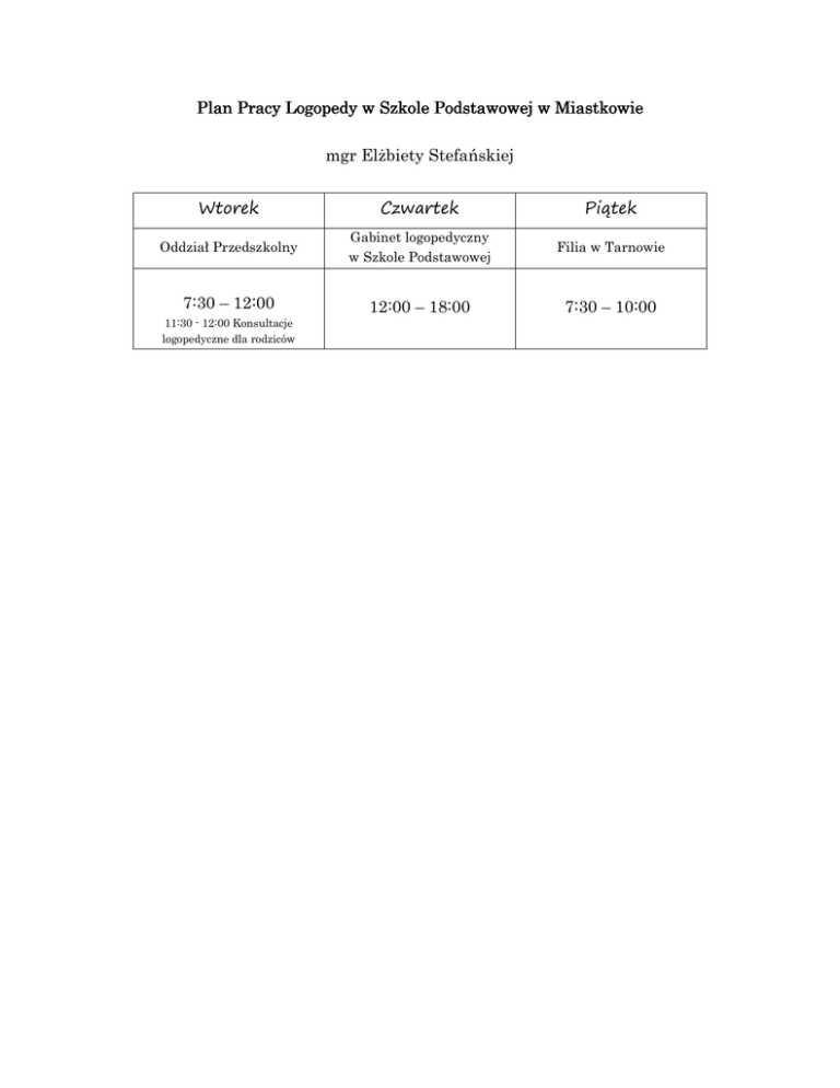 Plan Pracy Logopedy w Szkole Podstawowej w Miastkowie Plan