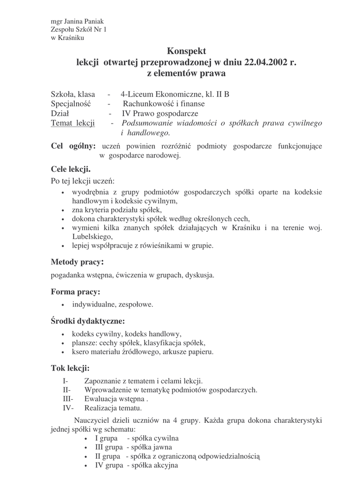 mgr Janina Paniak Zespołu Szkół Nr 1 w Kra niku Konspekt lekcji otwartej przeprowadzonej w dniu 22.04.2002 r. z elementów prawa Szkoła, klasa Specjalno Dział Temat lekcji - 4-Liceum Ekonomiczne, kl. II B Rachunkowo i finanse - IV Prawo gospodarcze - Podsumowanie wiadomo ci o spółkach prawa cywilnego i handlowego. Cel ogólny: ucze powinien rozró ni w gospodarce narodowej. podmioty gospodarcze funkcjonuj ce Cele lekcji. Po tej lekcji ucze : • • • • • wyodr bnia z grupy podmiotów gospodarczych spółki oparte na kodeksie handlowym i kodeksie cywilnym, zna kryteria podziału spółek, dokona charakterystyki spółek według okre lonych cech, wymieni kilka znanych spółek działaj cych w Kra niku i na terenie woj. Lubelskiego, lepiej współpracuje z rówie nikami w grupie. Metody pracy: pogadanka wst pna, wiczenia w grupach, dyskusja. Forma pracy: • indywidualne, zespołowe. rodki dydaktyczne: • • • kodeks cywilny, kodeks handlowy, plansze: cechy spółek, klasyfikacja spółek, ksero materiału ródłowego, arkusze papieru. Tok lekcji: IIIIIIIV- Zapoznanie z tematem i celami lekcji. Wprowadzenie w tematyk podmiotów gospodarczych. Ewaluacja wst pna . Realizacja tematu. Nauczyciel dzieli uczniów na 4 grupy. Ka da grupa dokona charakterystyki jednej spółki wg schematu: • I grupa - spółka cywilna • III grupa - spółka jawna • II grupa - spółka z ograniczon odpowiedzialno ci • IV grupa - spółka akcyjna Czynno ci ucznia: 1. 2. 3. 4. Ka dy ucze przygotowuje tabel dwudzieln , w której b dzie notował wiadomo ci . Uczniowie poszukuj stosownych materiałów i dokonuj wyboru ródeł informacji, dobieraj odpowiednie cechy spółek (przedstawiaj propozycj rozwi za ). Uczniowie dokonuj wymiany pogl dów w grupie i ostatecznie ustalaj zestawienie cech spółki. Lider grupy dokonuje prezentacji cech i wypisuje je na du ej planszy wg podanego wzoru. Czynno ci nauczyciela. 1. Nauczyciel koordynuje prac w grupach. 2. Nauczyciel ocenia poprawno podanych wiadomo ci 3. Nauczyciel udziela ewentualnie dodatkowych wyja nie . V- Podsumowanie Wypełnianie tabeli w zeszycie Lp. 1. 2. 3 4. 5. 6. 7. 8. 9. 10. 11. Cechy spółki Spółka cywilna Spółka jawna Spółka z o. o. Spółka akcyjna RÓDŁA PRAWA OSOBOWO PRAWNA FIRMA UMOWY ORGAN REJESTRUJ CY WYSOKO KAPITAŁU ILO ZAŁO YCIELI ODPOWIEDZIALNO ZAKŁADU OPODATKOWANIE SPÓŁKI FUNDUSZE PODZIAŁ ZYSKÓW ORGANY SPÓŁKI VI- Zadanie domowe: Dla wszystkich: - Wska po dwa przykłady na ka dy rodzaj spółki działaj cej w Kra niku lub woj. lubelskim ( skorzystaj z „PANORAMY FIRM”) Dla ch tnych: - Któr ze spółek zało yłby gospodarcz . Uzasadnij ! podejmuj c w przyszło ci działalno Opracowała: