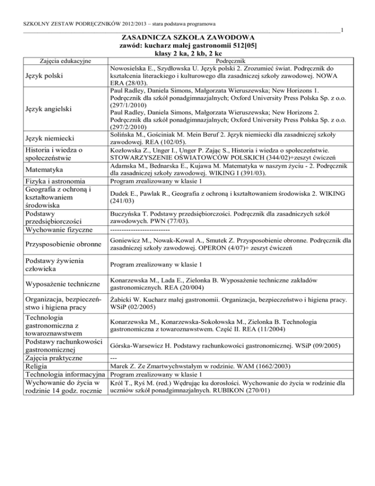 SZKOLNY ZESTAW PODRĘCZNIKÓW 2012/2013 – stara podstawa programowa ________________________________________________________________________________________________________________1 ZASADNICZA SZKOŁA ZAWODOWA zawód: kucharz małej gastronomii 512[05] klasy 2 ka, 2 kb, 2 kc Zajęcia edukacyjne Język polski Język angielski Język niemiecki Historia i wiedza o społeczeństwie Matematyka Fizyka i astronomia Geografia z ochroną i kształtowaniem środowiska Podstawy przedsiębiorczości Wychowanie fizyczne Podręcznik Nowosielska E., Szydłowska U. Język polski 2. Zrozumieć świat. Podręcznik do kształcenia literackiego i kulturowego dla zasadniczej szkoły zawodowej. NOWA ERA (28/03). Paul Radley, Daniela Simons, Małgorzata Wieruszewska; New Horizons 1. Podręcznik dla szkół ponadgimnazjalnych; Oxford University Press Polska Sp. z o.o. (297/1/2010) Paul Radley, Daniela Simons, Małgorzata Wieruszewska; New Horizons 2. Podręcznik dla szkół ponadgimnazjalnych; Oxford University Press Polska Sp. z o.o. (297/2/2010) Solińska M., Gościniak M. Mein Beruf 2. Język niemiecki dla zasadniczej szkoły zawodowej. REA (102/05). Kozłowska Z., Unger I., Unger P. Zając S., Historia i wiedza o społeczeństwie. STOWARZYSZENIE OŚWIATOWCÓW POLSKICH (344/02)+zeszyt ćwiczeń Adamska M., Bednarska E., Kujawa M. Matematyka w naszym życiu - 2. Podręcznik dla zasadniczej szkoły zawodowej. WIKING I (391/03). Program zrealizowany w klasie 1 Dudek E., Pawlak R., Geografia z ochroną i kształtowaniem środowiska 2. WIKING (241/03) Buczyńska T. Podstawy przedsiębiorczości. Podręcznik dla zasadniczych szkół zawodowych. PWN (77/03). -------------------------- Przysposobienie obronne Goniewicz M., Nowak-Kowal A., Smutek Z. Przysposobienie obronne. Podręcznik dla zasadniczej szkoły zawodowej. OPERON (4/07)+ zeszyt ćwiczeń Podstawy żywienia człowieka Program zrealizowany w klasie 1 Wyposażenie techniczne Konarzewska M., Lada E., Zielonka B. Wyposażenie techniczne zakładów gastronomicznych. REA (20/004) Organizacja, bezpieczeństwo i higiena pracy Technologia gastronomiczna z towaroznawstwem Podstawy rachunkowości gastronomicznej Zajęcia praktyczne Religia Technologia informacyjna Wychowanie do życia w rodzinie 14 godz. rocznie Żabicki W. Kucharz małej gastronomii. Organizacja, bezpieczeństwo i higiena pracy. WSiP (02/2005) Konarzewska M., Konarzewska-Sokołowska M., Zielonka B. Technologia gastronomiczna z towaroznawstwem. Część II. REA (11/2004) Górska-Warsewicz H. Podstawy rachunkowości gastronomicznej. WSiP (09/2005) --Marek Z. Ze Zmartwychwstałym w rodzinie. WAM (1662/2003) Program zrealizowany w klasie 1 Król T., Ryś M. (red.) Wędrując ku dorosłości. Wychowanie do życia w rodzinie dla uczniów szkół ponadgimnazjalnych. RUBIKON (270/01) SZKOLNY ZESTAW PODRĘCZNIKÓW 2012/2013 – stara podstawa programowa ________________________________________________________________________________________________________________2 TECHNIKUM nr 9 zawód: technik organizacji usług gastronomicznych 341[07] klasy 2 Ta, 3 Ta, 4 Ta, 4 Tb Zajęcia edukacyjne Język polski Język angielski Język niemiecki Historia Wiedza o społeczeństwie Wiedza o kulturze Podręczniki Klasa 2 Chemperek D., Kalbarczyk A. Zrozumieć tekst - zrozumieć człowieka. Renesans preromantyzm. Podręcznik do języka polskiego dla liceum i technikum. Klasa 1, część 2. Zakres podstawowy i rozszerzony. WSiP S. A. (128/08) Chemperek D., Kalbarczyk A., Trześniowski D. Zrozumieć tekst - zrozumieć człowieka. Wiek XIX. Podręcznik do języka polskiego dla liceum i technikum. Klasa II. Część 1. Zakres podstawowy i rozszerzony. WSiP S. A. (218/08) Klasa 3 Chemperek D., Kalbarczyk A., Trześniowski D. Zrozumieć tekst - zrozumieć człowieka. Wiek XIX. Podręcznik do języka polskiego dla liceum i technikum. Klasa II. Część 1. Zakres podstawowy i rozszerzony. WSiP S. A. (218/08) Chemperek D., Kalbarczyk A., Trześniowski D. Zrozumieć tekst-zrozumieć człowieka. Modernizm - dwudziestolecie międzywojenne. Podręcznik do języka polskiego dla liceum i technikum. Klasa II. Część 2. Zakres podstawowy i rozszerzony. WSiP S. A. (56/09/S) Klasa 4 Chemperek D., Kalbarczyk A., Trześniowski D. Zrozumieć tekst-zrozumieć człowieka. Modernizm - dwudziestolecie międzywojenne. Podręcznik do języka polskiego dla liceum i technikum. Klasa II. Część 2. WSiP S. A. (56/09/S) Chemperek D., Kalbarczyk A., Trześniowski D. Zrozumieć tekst-zrozumieć człowieka. Literatura współczesna. Podręcznik do języka polskiego dla liceum i technikum. Klasa III. Zakres podstawowy i rozszerzony. WSiP S. A. (86/5/09/S). Klasa 2 Martyn Hobbs, Julia Starr Keddle, Marta Umińska Real Life Elementary. Wersja uaktualniona; Pearson Central Europe Sp. z o.o. (320/1/2011) Klasa 3Ta Marta Umińska, Bob Hastnigs, Dominika Chandler, Hannna Mrozowska Repetytorium maturalne. Podręcznik do języka angielskiego. Poziom podstawowy, Pearson Central Europe Sp. z o.o.(351/2011) Klasa 4 Ta Jenny Quintana, Ilona Gąsiorkiewicz-Kozłowska; Oxford repetytorium. Matura podstawowa. Podręcznik do języka angielskiego. Oxford University Press Polska Sp. z o.o. (265/2010) Klasa 4 Tb Marta Umińska, Bob Hastnigs, Dominika Chandler, Hannna Mrozowska Repetytorium maturalne. Podręcznik do języka angielskiego. Poziom podstawowy, Pearson Central Europe Sp. z o.o.( 351/2011) Klasa 2 Rapacka S., Lewandowska M., Nawrotkiewicz J. Hier und da 1. Podręcznik z ćwiczeniami dla liceum ogólnokształcącego, liceum profilowanego i technikum wraz z Zeszytem maturalnym. Zakres podstawowy. WYD.SZKOLNE PWN (88/05) Klasa 2 i 3 Rapacka S., Lewandowska M., Nawrotkiewicz J. Hier und da 2. Zakres podstawowy. Podręcznik dla klas maturalnych. WYD.SZKOLNE PWN (130/06). Klassa 4 Ta Rapacka S., Lewandowska M., Nawrotkiewicz J. Hier und da 3. Podręcznik do języka niemieckiego dla szkół ponadgimnazjalnych. WYD.SZKOLNE PWN (102/07) Klasa 4 Tb Serzysko C., Sekulski 