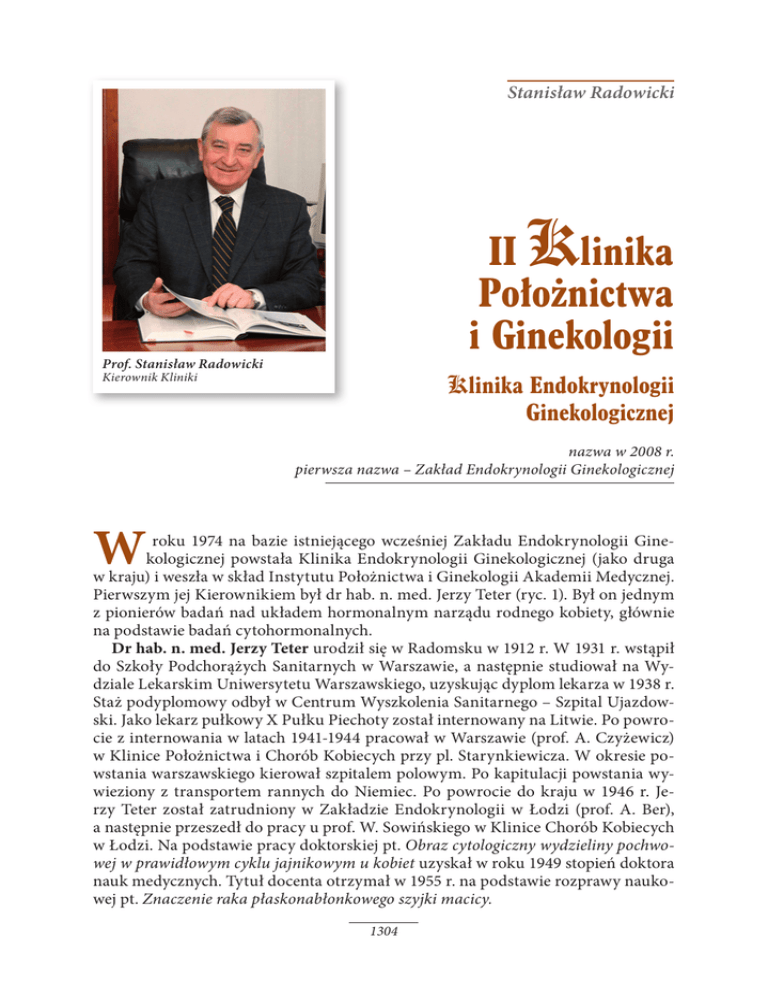 Stanisław Radowicki II Klinika Położnictwa i Ginekologii Prof. Stanisław Radowicki Kierownik Kliniki Klinika Endokrynologii Ginekologicznej nazwa w 2008 r. pierwsza nazwa – Zakład Endokrynologii Ginekologicznej W roku 1974 na bazie istniejącego wcześniej Zakładu Endokrynologii Ginekologicznej powstała Klinika Endokrynologii Ginekologicznej (jako druga w kraju) i weszła w skład Instytutu Położnictwa i Ginekologii Akademii Medycznej. Pierwszym jej Kierownikiem był dr hab. n. med. Jerzy Teter (ryc. 1). Był on jednym z pionierów badań nad układem hormonalnym narządu rodnego kobiety, głównie na podstawie badań cytohormonalnych. Dr hab. n. med. Jerzy Teter urodził się w Radomsku w 1912 r. W 1931 r. wstąpił do Szkoły Podchorążych Sanitarnych w Warszawie, a następnie studiował na Wydziale Lekarskim Uniwersytetu Warszawskiego, uzyskując dyplom lekarza w 1938 r. Staż podyplomowy odbył w Centrum Wyszkolenia Sanitarnego – Szpital Ujazdowski. Jako lekarz pułkowy X Pułku Piechoty został internowany na Litwie. Po powrocie z internowania w latach 1941-1944 pracował w Warszawie (prof. A. Czyżewicz) w Klinice Położnictwa i Chorób Kobiecych przy pl. Starynkiewicza. W okresie powstania warszawskiego kierował szpitalem polowym. Po kapitulacji powstania wywieziony z transportem rannych do Niemiec. Po powrocie do kraju w 1946 r. Jerzy Teter został zatrudniony w Zakładzie Endokrynologii w Łodzi (prof. A. Ber), a następnie przeszedł do pracy u prof. W. Sowińskiego w Klinice Chorób Kobiecych w Łodzi. Na podstawie pracy doktorskiej pt. Obraz cytologiczny wydzieliny pochwowej w prawidłowym cyklu jajnikowym u kobiet uzyskał w roku 1949 stopień doktora nauk medycznych. Tytuł docenta otrzymał w 1955 r. na podstawie rozprawy naukowej pt. Znaczenie raka płaskonabłonkowego szyjki macicy. 1304 Klinika Endokrynologii Ginekologicznej W roku 1956 rozpoczął pracę w I Klinice Położnictwa i Chorób Kobiecych Akademii Medycznej w Warszawie pod kierunkiem prof. A. Czyżewicza, a następnie prof. T. Bulskiego. W 1964 r. zorganizował i kierował Zakładem Endokrynologii Klinicznej Akademii Medycznej, który w 1973 r. został przekształcony w Klinikę Endokrynologii Klinicznej Akademii Medycznej w Warszawie. Jednostką tą kierował do chwili przejścia na emeryturę, to jest do 1986 r. Ryc. 1. Główne zainteresowania naukowe prof. Jerzego TeteDoc. Jerzy Teter ra dotyczyły patogenezy, diagnostyki i leczenia schorzeń Kierownik Kliniki układu hormonalnego u kobiet. Jest autorem podręczniw latach 1974-1986 ków z zakresu endokrynologii ginekologicznej. Profesor Jerzy Teter stworzył podstawy rozwoju endokrynologii ginekologicznej w Polsce, propagując i rozwijając nowoczesne metody oceny biologicznego działania hormonów u kobiet (badania cytohormonalne). Drugim nurtem jego działalności naukowej są zagadnienia chorób nowotworowych układu rodnego u kobiet. Był zwolennikiem i propagatorem stosowania hormonalnej terapii zastępczej u kobiet w okresie menopauzy. Jest autorem lub współautorem ponad 350 publikacji i doniesień naukowych. Został odznaczony Krzyżem Zasługi i Krzyżem Odrodzenia Polski. Zmarł w 1993 r. Ryc. 2. Po przejściu na emeryturę w roku 1986 dr hab. n. med. Prof. Stanisław Radowicki Jerzego Tetera i po rozwiązaniu Instytutu Położnictwa Kierownik Kliniki i Ginekologii kierownictwo Kliniki objął prof. dr hab. od 1986 r. – nadal n. med. Stanisław Radowicki. W tym samym roku dokonano strukturalnej przebudowy Kliniki. Utworzono 12-łóżkowy Oddział Kliniczny, wprowadzając nowe algorytmy postępowania diagnostycznego i leczenia zaburzeń hormonalnych u kobiet. Unowocześniono Pracownię Biochemii Hormonów, wyposażając ją w najnowocześniejszą wówczas w kraju aparaturę analityczną, umożliwiającą oznaczanie wielu hormonów steroidowych i białkowych we krwi. Zakupiono nowoczesny aparat ultrasonograficzny, tworząc Pracownię Ultrasonografii. Podjęto pierwsze w Akademii Medycznej w Warszawie prace nad komputeryzacją historii choroby oraz obiegu dokumentacji klinicznej. Opracowany model komputerowej historii choroby został wyróżniony w ramach prac innowacyjnych prowadzonych przez Komitet Badań Naukowych. Stworzono nowy kompleksowy model funkcjonowania Kliniki Endokrynologii Ginekologicznej, pozwalający łączyć i wzajemnie uzupełniać działania wszystkich składowych Kliniki, to jest Przychodni Przyklinicznej, Oddziału Klinicznego, Pracowni Biochemii Hormonów i Pracowni Ultrasonografii. Zastosowane zmiany pozwoliły w sposób znaczący zwiększyć liczbę leczonych chorych. Wypracowany model organizacji Kliniki umożliwił wprowadzenie światowych standardów w dziedzinie diagnostyki i leczenia zaburzeń hormonalnych u kobiet. 1305 Dzieje I Wydziału Lekarskiego Akademii Medycznej w Warszawie Schemat organizacyjny Kliniki został przyjęty jako rozwiązanie wzorcowe w większości istniejących Klinik Endokrynologii Ginekologicznej w kraju. W 1986 r. opracowano po raz pierwszy kompleksowy program nauczania studentów podstaw endokrynologii ginekologicznej. W tym samym roku opracowano program szkolenia podyplomowego z zakresu endokrynologii ginekologicznej dla lekarzy. Od roku 2001 prowadzone są staże specjalizacyjne oraz kursy z zakresu endokrynologii ginekologicznej dla lekarzy specjalizujących się w położnictwie i ginekologii oraz endokrynologii. W roku 1999 decyzją Władz Uczelni Klinika Endokrynologii Ginekologicznej została przeniesiona do Szpitala Klinicznego im. Ks. Anny Mazowieckiej. Zwiększeniu uległa baza łóżkowa. Poszerzono i unowocześniono zakres badań diagnostycznych w zakresie biochemii, genetyki medycznej oraz badań wizualizacyjnych. Wprowadzono do pakietu badań diagnostycznych i leczniczych metody endoskopowe (histeroskopia, laparoskopia). Umożliwiło to w sposób znaczący zwiększenie zakresu i jakości badań diagnostycznych oraz metod terapeutycznych, stosowanych u kobiet