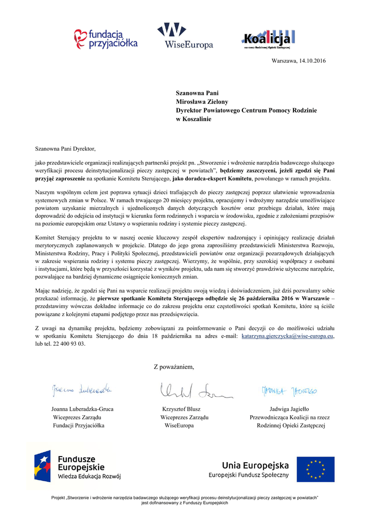 Warszawa, 14.10.2016 Szanowna Pani Mirosława Zielony Dyrektor Powiatowego Centrum Pomocy Rodzinie w Koszalinie Szanowna Pani Dyrektor, jako przedstawiciele organizacji realizujących partnerski projekt pn. „Stworzenie i wdrożenie narzędzia badawczego służącego weryfikacji procesu deinstytucjonalizacji pieczy zastępczej w powiatach”, będziemy zaszczyceni, jeżeli zgodzi się Pani przyjąć zaproszenie na spotkanie Komitetu Sterującego, jako doradca-ekspert Komitetu, powołanego w ramach projektu. Naszym wspólnym celem jest poprawa sytuacji dzieci trafiających do pieczy zastępczej poprzez ułatwienie wprowadzenia systemowych zmian w Polsce. W ramach trwającego 20 miesięcy projektu, opracujemy i wdrożymy narzędzie umożliwiające powiatom uzyskanie mierzalnych i ujednoliconych danych dotyczących kosztów oraz przebiegu działań, które mają doprowadzić do odejścia od instytucji w kierunku form rodzinnych i wsparcia w środowisku, zgodnie z założeniami przepisów na poziomie europejskim oraz Ustawy o wspieraniu rodziny i systemie pieczy zastępczej. Komitet Sterujący projektu to w naszej ocenie kluczowy zespół ekspertów nadzorujący i opiniujący realizację działań merytorycznych zaplanowanych w projekcie. Dlatego do jego grona zaprosiliśmy przedstawicieli Ministerstwa Rozwoju, Ministerstwa Rodziny, Pracy i Polityki Społecznej, przedstawicieli powiatów oraz organizacji pozarządowych działających w zakresie wspierania rodziny i systemu pieczy zastępczej. Wierzymy, że wspólnie, przy szerokiej współpracy z osobami i instytucjami, które będą w przyszłości korzystać z wyników projektu, uda nam się stworzyć prawdziwie użyteczne narzędzie, pozwalające na bardziej dynamiczne osiągnięcie koniecznych zmian. Mając nadzieję, że zgodzi się Pani na wsparcie realizacji projektu swoją wiedzą i doświadczeniem, już dziś pozwalamy sobie przekazać informację, że pierwsze spotkanie Komitetu Sterującego odbędzie się 26 października 2016 w Warszawie – przedstawimy wówczas dokładne informacje co do zakresu projektu oraz częstotliwości spotkań Komitetu, które są ściśle powiązane z kolejnymi etapami podjętego przez nas przedsięwzięcia. Z uwagi na dynamikę projektu, będziemy zobowiązani za poinformowanie o Pani decyzji co do możliwości udziału w spotkaniu Komitetu Sterującego do dnia 18 października na adres e-mail: [email protected], lub tel. 22 400 93 03. Z poważaniem, Joanna Luberadzka-Gruca Wiceprezes Zarządu Fundacji Przyjaciółka Krzysztof Blusz Wiceprezes Zarządu WiseEuropa Jadwiga Jagiełło Przewodnicząca Koalicji na rzecz Rodzinnej Opieki Zastępczej Projekt „Stworzenie i wdrożenie narzędzia badawczego służącego weryfikacji procesu deinstytucjonalizacji pieczy zastępczej w powiatach” jest dofinansowany z Funduszy Europejskich