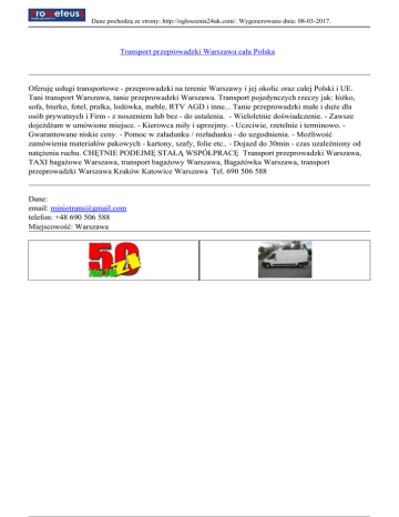Dane pochodzą ze strony: http://ogloszenia24uk.com/. Wygenerowano dnia: 08-03-2017. Transport przeprowadzki Warszawa cała Polska Oferuję usługi transportowe - przeprowadzki na terenie Warszawy i jej okolic oraz całej Polski i UE. Tani transport Warszawa, tanie przeprowadzki Warszawa. Transport pojedynczych rzeczy jak: łóżko, sofa, biurko, fotel, pralka, lodówka, meble, RTV AGD i inne... Tanie przeprowadzki małe i duże dla osób prywatnych i Firm - z noszeniem lub bez - do ustalenia. - Wieloletnie doświadczenie. - Zawsze dojeżdżam w umówione miejsce. - Kierowca miły i uprzejmy. - Uczciwie, rzetelnie i terminowo. Gwarantowane niskie ceny. - Pomoc w załadunku / rozładunku - do uzgodnienia. - Możliwość zamówienia materiałów pakowych - kartony, szafy, folie etc.. - Dojazd do 30min - czas uzależniony od natężenia ruchu. CHĘTNIE PODEJMĘ STAŁĄ WSPÓŁPRACĘ Transport przeprowadzki Warszawa, TAXI bagażowe Warszawa, transport bagażowy Warszawa, Bagażówka Warszawa, transport przeprowadzki Warszawa Kraków Katowice Warszawa Tel. 690 506 588 Dane: email: [email protected] telefon: +48 690 506 588 Miejscowość: Warszawa