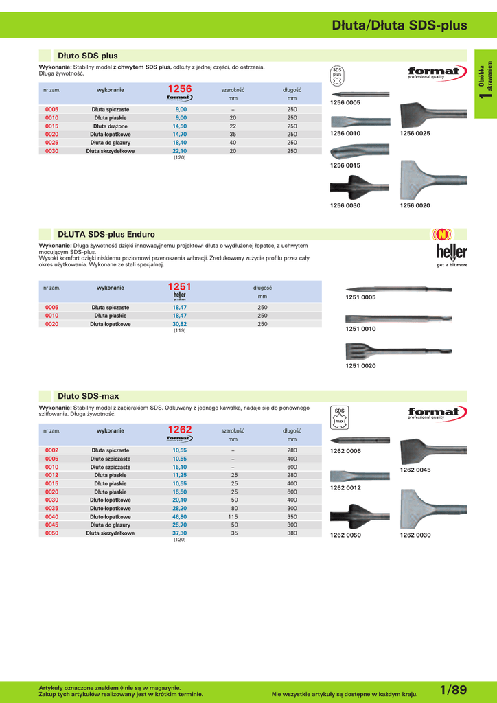Dłuta/Dłuta SDS-plus Obróbka skrawaniem Dłuto SDS plus nr zam. wykonanie 1256 0005 0010 0015 0020 0025 0030 Dłuta spiczaste Dłuta płaskie Dłuta drążone Dłuta łopatkowe Dłuta do glazury Dłuta skrzydełkowe 9,00 9,00 14,50 14,70 18,40 22,10 szerokość mm długość mm – 20 22 35 40 20 250 250 250 250 250 250 1 Wykonanie: Stabilny model z chwytem SDS plus, odkuty z jednej części, do ostrzenia. Długa żywotność. 1256 0005 1256 0010 1256 0025 (120) 1256 0015 1256 0030 1256 0020 DŁUTA SDS-plus Enduro " Wykonanie: Długa żywotność dzięki innowacyjnemu projektowi dłuta o wydłużonej łopatce, z uchwytem mocującym SDS-plus. Wysoki komfort dzięki niskiemu poziomowi przenoszenia wibracji. Zredukowany zużycie profilu przez cały okres użytkowania. Wykonane ze stali specjalnej. nr zam. wykonanie 1251 0005 0010 0020 Dłuta spiczaste Dłuta płaskie Dłuta łopatkowe 18,47 18,47 30,82 długość mm 1251 0005 250 250 250 1251 0010 (119) 1251 0020 Dłuto SDS-max Wykonanie: Stabilny model z zabierakiem SDS. Odkuwany z jednego kawałka, nadaje się do ponownego szlifowania. Długa żywotność. nr zam. wykonanie 1262 0002 0005 0010 0012 0015 0020 0030 0035 0040 0045 0050 Dłuta spiczaste Dłuto szpiczaste Dłuto szpiczaste Dłuta płaskie Dłuto płaskie Dłuto płaskie Dłuto łopatkowe Dłuto łopatkowe Dłuto łopatkowe Dłuta do glazury Dłuta skrzydełkowe 10,55 10,55 15,10 11,25 10,55 15,50 20,10 28,20 46,80 25,70 37,30 (120) Artykuły oznaczone znakiem ◊ nie są w magazynie. Zakup tych artykułów realizowany jest w krótkim terminie. szerokość mm długość mm – – – 25 25 25 50 80 115 50 35 280 400 600 280 400 600 400 300 350 300 380 1262 0005 1262 0045 1262 0012 1262 0050 1262 0030 Nie wszystkie artykuły są dostępne w każdym kraju. 1/89