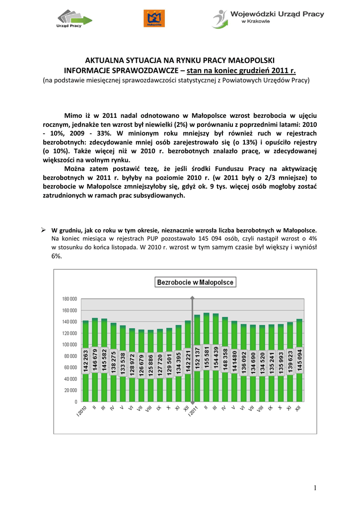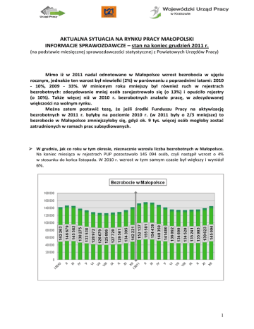 AKTUALNA SYTUACJA NA RYNKU PRACY MAŁOPOLSKI INFORMACJE SPRAWOZDAWCZE – stan na koniec grudzień 2011 r. (na podstawie miesięcznej sprawozdawczości statystycznej z Powiatowych Urzędów Pracy) Mimo iż w 2011 nadal odnotowano w Małopolsce wzrost bezrobocia w ujęciu rocznym, jednakże ten wzrost był niewielki (2%) w porównaniu z poprzednimi latami: 2010 - 10%, 2009 - 33%. W minionym roku mniejszy był również ruch w rejestrach bezrobotnych: zdecydowanie mniej osób zarejestrowało się (o 13%) i opuściło rejestry (o 10%). Także więcej niż w 2010 r. bezrobotnych znalazło pracę, w zdecydowanej większości na wolnym rynku. Można zatem postawić tezę, że jeśli środki Funduszu Pracy na aktywizację bezrobotnych w 2011 r. byłyby na poziomie 2010 r. (w 2011 były o 2/3 mniejsze) to bezrobocie w Małopolsce zmniejszyłoby się, gdyż ok. 9 tys. więcej osób mogłoby zostać zatrudnionych w ramach prac subsydiowanych. W grudniu, jak co roku w tym okresie, nieznacznie wzrosła liczba bezrobotnych w Małopolsce. Na koniec miesiąca w rejestrach PUP pozostawało 145 094 osób, czyli nastąpił wzrost o 4% w stosunku do końca listopada. W 2010 r. wzrost w tym samym czasie był większy i wyniósł 6%. 1 W grudniu napływ bezrobotnych do rejestrów PUP był nieznacznie wyższy niż w listopadzie, natomiast odpływ - niższy. W PUP wyrejestrowało się o 14% mniej niż w poprzednim miesiącu. W grudniu mniejszy był również ruch bezrobotnych w rejestrach PUP w 2011 r. porównaniu do roku poprzedniego– zdecydowanie mniej bezrobotnych zarejestrowało się (o 21%) oraz o 15% mniej wyrejestrowało się. W 2011 roku zarejestrowało się w PUP łącznie 179 966 osób, tj. o 13% mniej niż w roku 2010 (206 825 os.). W przypadku odpływu osób bezrobotnych z rejestrów PUP, w 2011 r. liczba ta wyniosła 177 093 osób, co w odniesieniu do 2010 r. stanowi spadek o prawie 10%. Spadek ilości ofert w końcu roku jest tendencją notowana rokrocznie. W grudniu utrzymała się tendencja spadkowa w ilości zgłoszonych ofert pracy. Do małopolskich urzędów pracy wpłynęło 2 504 ofert, co w odniesieniu do miesiąca poprzedniego oznacza spadek o 18%, natomiast w porównaniu do analogicznego okresu roku poprzedniego spadek wyniósł 13%. W roku 2011 do powiatowych urzędów pracy zgłoszono 55 814 ofert pracy, co stanowi spadek o 26% w odniesieniu do roku 2010. Spadek ten dotyczy wyłącznie ofert pracy subsydiowanej. 2 W grudniu odnotowano spadek w liczbie bezrobotnych podejmujących pracę. Pracę podjęło 5 401 osób, tj. 10% mniej osób w ujęciu miesięcznym. Również w porównaniu do grudnia 2010 r. odnotowano spadek w liczba podjęć pracy o 18%. Jednak mimo znacznego ograniczenia środków Funduszu Pracy (o 2/3 mniej) roku ubiegłym w porównaniu do 2010 r. pracę podjęło więcej osób bezrobotnych, co oznacza ożywienie i większą dostępność wolnych miejsc pracy na wolnym rynku. W grudniu nadal utrzymuje się tendencja spadkowa w napływie absolwentów do urzędów pracy, przeciwnie do grudnia 2010 r. W tym roku w grudniu do rejestrów napłynęło o 1/3 mniej absolwentów niż przed rokiem. W roku 2011 w urzędach pracy łącznie zarejestrowało się 28 896 absolwentów, czyli o 14% mniej niż w 2010 r. 3 W grudniu pracę podjęło 738 bezrobotnych absolwentów. Był to poziom zbliżony do poprzedniego miesiąca, natomiast w porównaniu rocznym w grudniu 2011 odnotowano spadek podjęć pracy przez absolwentów o 18%. W roku 2011 z urzędów pracy łącznie wyrejestrowało się 8 617 absolwentów, co oznacza, iż w minionym roku 10% więcej absolwentów znalazło zatrudnienie. W grudniu plany zwolnień zgłosiło 14 pracodawców i dotyczyły 321 osób. Było to więcej niż w listopadzie 2011 r., a także w grudniu 2010r. W roku 2011 zapowiedzi zwolnień zgłosiło 112 zakładów pracy i dotyczyły 2 150 osób, co w porównaniu do zapowiedzi z roku 2010, w którym zgłoszono 3 557 osób, oznacza spadek o prawie połowę . 4 W grudniu 2011 r. wzrosła realizacja zwolnień z przyczyn zakładu pracy, co jest efektem kumulacji wcześniejszych zapowiedzi. Jednakże w zestawieniu rocznym w 2011 r. w Małopolsce zwolniono z przyczyn zakładu pracy 4 022 osoby, natomiast w 2010 r. 5 549 osób, co oznacza spadek prawie o 1/3. Po zdecydowanym spadku w I połowie roku ilości rejestrujących się po powrocie z zagranicy, od końca II kw. ich liczba systematycznie wzrastała. Tylko w grudniu br. odnotowano spadek w odniesieniu do poprzedniego miesiąca podobnie jak rok wcześniej. W roku 2011 w urzędach pracy łącznie zarejestrowało się 3 876 osób, czyli na poziomie 2010 r. 5 W roku 2011 w Wojewódzkim Urzędzie Pracy w Krakowie wydano 3 144 decyzji administracyjnych dot. uwzględniania okresów zatrudnienia i ubezpieczenia z UE/EOG i Szwajcarii. Widoczny jest znaczny, prawie 50% wzrost w stosunku do 2010 r. 3 144 2 236 1 560 (dane o ilości osób powracających z zagranicy po okresie pracy, w przypadku osób nie ubiegających się o zasiłek zbierane są wyłącznie na podstawie dobrowolnego oświadczenia) Wojewódzki Urząd Pracy poprzez Centra Informacji i Planowania Kariery Zawodowej (CIZ) w Krakowie, Nowym Sączu i Tarnowie realizował powszechnie dostępne usługi poradnictwa zawodowego i informacji zawodowej dla mieszkańców Małopolski. W 2011 r. skorzystało z nich łącznie 28 720 klientów, czyli podobna liczba jak w 2010 r. 6 Ilość klientów korzystających z różnych form usług świadczonych w CIZ 2010-2011 Razem województwo poradnictwo indywidualne poradnictwo grupowe zajęcia aktywizacyjne 2010 2011 2010 2011 2010 2011 2 100 2 129 728 699 1 296 964 indywidualna informacja zawodowa 2010 2011 22 285 22 801 grupaowa informacja zawodowa 2010 2011 2 543 2 127 Razem 2010 2011 28 952 28 720 INFORMACJE SPRAWOZDAWCZE – stan na koniec listopada 2011 r. (na podstawie danych GUS) W Małopolsce na koniec listopada br. stopa bezrobocia wynosiła 10,1%, co niezmiennie da