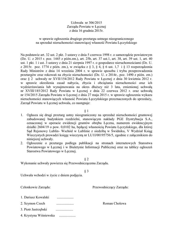Uchwała nr 306/2015 Zarządu Powiatu w Łęcznej z dnia 16 grudnia 2015r. w sprawie ogłoszenia drugiego przetargu ustnego nieograniczonego na sprzedaż nieruchomości stanowiącej własność Powiatu Łęczyńskiego Na podstawie art. 32 ust. 2 pkt. 3 ustawy z dnia 5 czerwca 1998 r. o samorządzie powiatowym (Dz. U. z 2015 r. poz. 1445 z późn.zm.), art. 25b, art. 37 ust.1, art. 38, art. 39 ust. 1, art. 40 ust. 1 pkt. 1 i ust. 3 ustawy z dnia 21 sierpnia 1997 r. o gospodarce nieruchomościami (Dz. U. z 2015r. poz. 1774 z późn. zm.), w związku z § 3, § 4, § 6 ust. 1,7 i § 13 rozporządzenia Rady Ministrów z dnia 14 września 2004 r. w sprawie sposobu i trybu przeprowadzenia przetargów oraz rokowań na zbycie nieruchomości (Dz. U. z 2014r., poz. 1490 z późn. zm.) oraz § 2 uchwały nr XVII/154/2012 Rady Powiatu w Łęcznej z dnia 30 kwietnia 2012 r. w sprawie określenia zasad nabycia, zbycia i obciążania nieruchomości oraz ich wydzierżawiania lub wynajmowania na okres dłuższy niż 3 lata, zmienionej uchwałą nr XVIII/185/2012 Rady Powiatu w Łęcznej z dnia 22 czerwca 2012 r. oraz uchwałą nr 154/2015 Zarządu Powiatu w Łęcznej z dnia 27 maja 2015 r. w sprawie ogłoszenia wykazu nieruchomości stanowiących własność Powiatu Łęczyńskiego przeznaczonych do sprzedaży, Zarząd Powiatu w Łęcznej uchwala, co następuje: 1. 2. §1 Ogłasza się drugi przetarg ustny nieograniczony na sprzedaż nieruchomości gruntowej zabudowanej budynkiem rozdzielni, stanowiącym nakłady PGE Dystrybucja S.A., oznaczonej w operacie ewidencji gruntów obrębu Łęczna, numerem ewidencyjnym działki 2604/19 o pow. 0,0102 ha, będącej własnością Powiatu Łęczyńskiego, dla której Sąd Rejonowy Lublin- Wschód w Lublinie z siedzibą w Świdniku, V Wydział Ksiąg Wieczystych prowadzi księgę wieczystą nr LU1I/00195756/5, zgodnie z załącznikiem do niniejszej uchwały. Ogłoszenie o przetargu podlega publikacji na stronach internetowych Starostwa Powiatowego w Łęcznej i w Biuletynie Informacji Publicznej oraz na tablicy ogłoszeń Starostwa Powiatowego w Łęcznej. §2 Wykonanie uchwały powierza się Przewodniczącemu Zarządu. §3 Uchwała wchodzi w życie z dniem podjęcia. Członkowie Zarządu: Przewodniczący Zarządu: 1. Dariusz Kowalski ................... 2. Szymon Czech .................... 3. Piotr Jastrzębski .................... 4. Krystyna Wiśniewska ................... Roman Cholewa Załącznik do uchwały nr 306./2015 Zarządu Powiatu w Łęcznej z dnia 16 grudnia 2015 r. Zarząd Powiatu w Łęcznej ogłasza grugi ustny przetarg nieograniczony na sprzedaż nieruchomości stanowiącej własność Powiatu Łęczyńskiego położonej w Łęcznej 1. 2. 3. 4. 5. 6. 7. 8. 9. Przedmiotem przetargu jest nieruchomość gruntowa zabudowana budynkiem stanowiącym nakłady PGE Dystrybucja S.A., oznaczona numerem ewidencyjnym działki 2604/19 o pow. 0.0102 ha, położona w Łęcznej, dla której Sąd Rejonowy Lublin – Wschód w Lublinie z siedzibą w Świdniku, V Wydział Ksiąg Wieczystych prowadzi księgę wieczystą nr LU1I/00108816/8. Nieruchomość zlokalizowana jest w obrębie zabudowy administracyjno – biurowej siedziby Starostwa Powiatowego w Łęcznej, ok. 120 m od przebiegającej przez miejscowość drogi krajowej nr 82 (Lublin - Włodawa). Nieruchomość stanowi jedna działka, zabudowana stacją transformatorową. Dojazd do nieruchomości drogą wewnętrzną, utwardzoną. Na rzecz każdoczesnego właściciela nieruchomości ustanowiona zostanie służebność dojazdu do nieruchomości, przez działkę oznaczoną numerem 2608/18. Nieruchomość przeznaczona jest w miejscowym planie zagospodarowania przestrzennego Miasta Łęczna pod UP – tereny usług i administracji. Obciążenia: nieruchomość zabudowana jest budynkiem, stanowiącym nakłady PGE Dystrybucja S.A. Granice zbywanej nieruchomości nie będą wznawiane. Pierwszy przetarg nieograniczony odbył się w dniu 20 sierpnia 2015 r. Przetarg zakończył się wynikiem negatywnym, z powodu nie przystąpienia żadnego oferenta do przetargu. Cena wywoławcza nieruchomości gruntowej (bez nakładów) wynosi 19 311,00 zł (słownie: dziewiętnaście tysięcy trzysta jedenaście złotych 00/100) brutto, w tym podatek VAT o stawce 23%. Teren, na którym położona jest nieruchomość, uzbrojony jest w napowietrzną sieć energetyczną oraz w sieć wodociągową. W przetargu mogą uczestniczyć osoby fizyczne i prawne, które wpłacą wadium w formie, terminie i wysokości określonej w ust. 10 niniejszego ogłoszenia. Do uczestnictwa w przetargu osoby prawne powinny przedłożyć aktualny wypis ze stosownego rejestru. Dopuszcza się udział w przetargu pełnomocników pod warunkiem okazania pełnomocnictwa z uwierzytelnionym notarialnie podpisem mocodawcy. Warunkiem udziału w przetargu jest przedłożenie w dniu przetargu komisji przetargowej: 1) dokumentu potwierdzającego tożsamość osoby przystępującej do przetargu, 2) pisemnej zgody współmałżonka na nabycie nieruchomości w przypadku, gdy ma ona zostać nabyta do małżeńskiego majątku wspólnego, a do przetargu przystępuje tylko jeden ze współmałżonków lub dołączenie do oferty przez osobę składającą ofertę dokumentu (oświadczenia) o istnieniu rozdzielności majątkowej pomiędzy małżonkami, 3) aktualnego dokumentu (np. KRS), z którego wynika upoważnienie przedstawiciela osoby prawnej do jej reprezentowania w przetargu (dotyczy: przystąpienia do przetargu osoby prawnej), 4) umowy między osobami (współwłaścicielami), określającej wysokość udziału każdej z tych osób we wpłaconym wadium oraz w prawie własności nieruchomości w razie jej nabycia (dotyczy: przystąpienia do przetargu więcej niż jednej osoby jako pojedynczego oferenta). Przetarg odbędzie się w dniu 20 stycznia 2016 r., w siedzibie Starostwa Powiatowego w Łęcznej, al. Jana Pawła II 95 A (sala konferencyjna, parter), o godz. 9.00. 10. Wadium