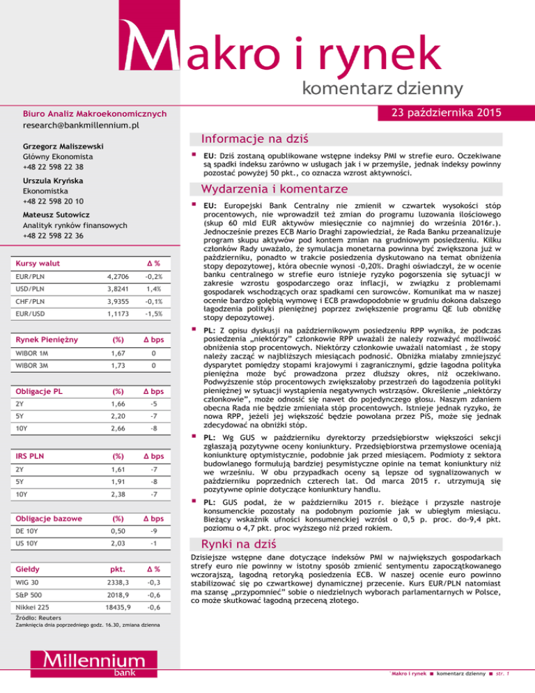 23 października 2015 Biuro Analiz Makroekonomicznych [email protected] Informacje na dziś Grzegorz Maliszewski Główny Ekonomista +48 22 598 22 38 Urszula Kryńska Ekonomistka +48 22 598 20 10 EU: Dziś zostaną opublikowane wstępne indeksy PMI w strefie euro. Oczekiwane są spadki indeksu zarówno w usługach jak i w przemyśle, jednak indeksy powinny pozostać powyżej 50 pkt., co oznacza wzrost aktywności. Wydarzenia i komentarze Mateusz Sutowicz Analityk rynków finansowych +48 22 598 22 36 Kursy walut EU: Europejski Bank Centralny nie zmienił w czwartek wysokości stóp procentowych, nie wprowadził też zmian do programu luzowania ilościowego (skup 60 mld EUR aktywów miesięcznie co najmniej do września 2016r.). Jednocześnie prezes ECB Mario Draghi zapowiedział, że Rada Banku przeanalizuje program skupu aktywów pod kontem zmian na grudniowym posiedzeniu. Kilku członków Rady uważało, że symulacja monetarna powinna być zwiększona już w październiku, ponadto w trakcie posiedzenia dyskutowano na temat obniżenia stopy depozytowej, która obecnie wynosi -0,20%. Draghi oświadczył, że w ocenie banku centralnego w strefie euro istnieje ryzyko pogorszenia się sytuacji w zakresie wzrostu gospodarczego oraz inflacji, w związku z problemami gospodarek wschodzących oraz spadkami cen surowców. Komunikat ma w naszej ocenie bardzo gołębią wymowę i ECB prawdopodobnie w grudniu dokona dalszego łagodzenia polityki pieniężnej poprzez zwiększenie programu QE lub obniżkę stopy depozytowej. PL: Z opisu dyskusji na październikowym posiedzeniu RPP wynika, że podczas posiedzenia „niektórzy” członkowie RPP uważali że należy rozważyć możliwość obniżenia stop procentowych. Niektórzy członkowie uważali natomiast , że stopy należy zacząć w najbliższych miesiącach podnosić. Obniżka miałaby zmniejszyć dysparytet pomiędzy stopami krajowymi i zagranicznymi, gdzie łagodna polityka pieniężna może być prowadzona przez dłuższy okres, niż oczekiwano. Podwyższenie stóp procentowych zwiększałoby przestrzeń do łagodzenia polityki pieniężnej w sytuacji wystąpienia negatywnych wstrząsów. Określenie „niektórzy członkowie”, może odnosić się nawet do pojedynczego głosu. Naszym zdaniem obecna Rada nie będzie zmieniała stóp procentowych. Istnieje jednak ryzyko, że nowa RPP, jeżeli jej większość będzie powołana przez PiS, może się jednak zdecydować na obniżki stóp. PL: Wg GUS w październiku dyrektorzy przedsiębiorstw większości sekcji zgłaszają pozytywne oceny koniunktury. Przedsiębiorstwa przemysłowe oceniają koniunkturę optymistycznie, podobnie jak przed miesiącem. Podmioty z sektora budowlanego formułują bardziej pesymistyczne opinie na temat koniunktury niż we wrześniu. W obu przypadkach oceny są lepsze od sygnalizowanych w październiku poprzednich czterech lat. Od marca 2015 r. utrzymują się pozytywne opinie dotyczące koniunktury handlu. PL: GUS podał, że w październiku 2015 r. bieżące i przyszłe nastroje konsumenckie pozostały na podobnym poziomie jak w ubiegłym miesiącu. Bieżący wskaźnik ufności konsumenckiej wzrósł o 0,5 p. proc. do-9,4 pkt. poziomu o 4,7 pkt. proc wyższego niż przed rokiem. Δ% EUR/PLN 4,2706 -0,2% USD/PLN 3,8241 1,4% CHF/PLN 3,9355 -0,1% EUR/USD 1,1173 -1,5% Rynek Pieniężny (%) Δ bps WIBOR 1M 1,67 0 WIBOR 3M 1,73 0 Obligacje PL (%) Δ bps 2Y 1,66 -5 5Y 2,20 -7 10Y 2,66 -8 IRS PLN (%) Δ bps 2Y 1,61 -7 5Y 1,91 -8 10Y 2,38 -7 Obligacje bazowe (%) Δ bps DE 10Y 0,50 -9 US 10Y 2,03 -1 Giełdy pkt. Δ% WIG 30 2338,3 -0,3 S&P 500 2018,9 -0,6 Nikkei 225 18435,9 -0,6 Rynki na dziś Dzisiejsze wstępne dane dotyczące indeksów PMI w największych gospodarkach strefy euro nie powinny w istotny sposób zmienić sentymentu zapoczątkowanego wczorajszą, łagodną retoryką posiedzenia ECB. W naszej ocenie euro powinno stabilizować się po czwartkowej dynamicznej przecenie. Kurs EUR/PLN natomiast ma szansę „przypomnieć” sobie o niedzielnych wyborach parlamentarnych w Polsce, co może skutkować łagodną przeceną złotego. Źródło: Reuters Zamknięcia dnia poprzedniego godz. 16.30, zmiana dzienna `Makro i rynek komentarz dzienny str. 1 Rynek krajowy Kursy walutowe EUR/PLN i EUR/USD 4,30 1,16 4,25 1,14 4,20 1,12 4,15 1,10 4,10 1,08 EURPLN EURUSD /prawa skala/ Źródło: Reuters Rentowności polskich obligacji [%] 3,4 3,0 2,6 2,2 Tak jak wskazywaliśmy we wczorajszym raporcie posiedzenie EBC było niezwykle istotnym dla rynków wydarzeniem zakończonym łagodną retoryką banku. Spełnione zostały ponadto oczekiwania rynku polegające na ogłoszeniu przez M.Draghiego rewizji dotychczasowego programu ilościowego w grudniu. W domyśle liczyć należy się z możliwością dalszego złagodzenia polityki pieniężnej. Tym bardziej, iż kolejny raz prezes EBC przyznał, iż program QE może ulec wydłużeniu, a wczoraj Rada Prezesów dyskutowała na temat możliwej obniżki stopy depozytowej. W rezultacie, tak jak oczekiwaliśmy, euro traciło wczoraj na wartości względem większości walut. Kurs EUR/PLN zawrócił po serii nieprzerwanych wzrostów notowań i wyznaczeniu najwyższego od dziewięciu miesięcy poziomu 4,2940. Co więcej wzrost wartości złotego był wyraźny i momentami najsilniejszy od lipca tego roku tj. momentu, gdy osiągnięto porozumienie w sprawie Grecji. Aprecjacja nie towarzyszyła natomiast polskiej walucie w relacji do dolara. Kurs USD/PLN wzrósł wczoraj do 3,83 tj. maksimum z połowy sierpnia. Warto przypomnieć, iż była to szósta z rzędu sesja zakończona wzrostem kursu, który nieco ponad tydzień temu wynosił 3,67. Pozytywne nastroje towarzyszyły także wycenie polskiego długu, który w ślad za sytuacją na rynkach bazowych, motywowaną wymową wspomnianego wcześniej posiedzenia ECB, dość solidnie zyskiwał na wartości. Dochodowość polskiej 10-latki zmalała o 8 bps do poziomu 2,66% co oznaczało spadek do 2-tyg