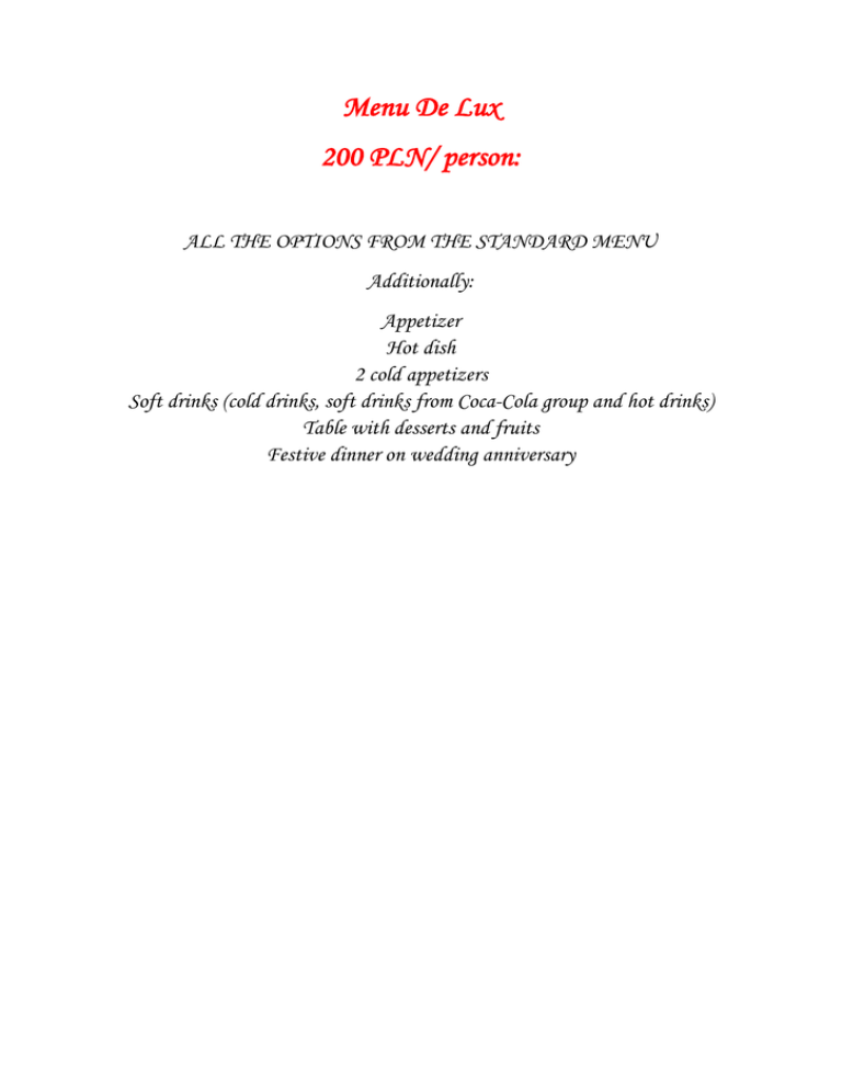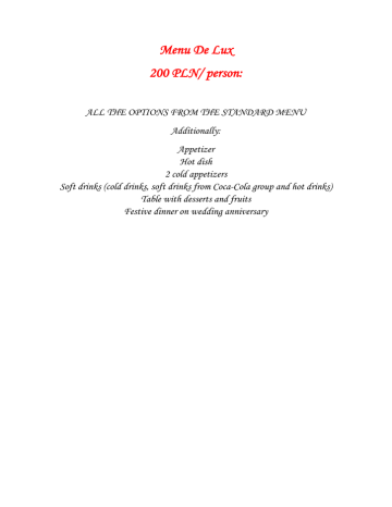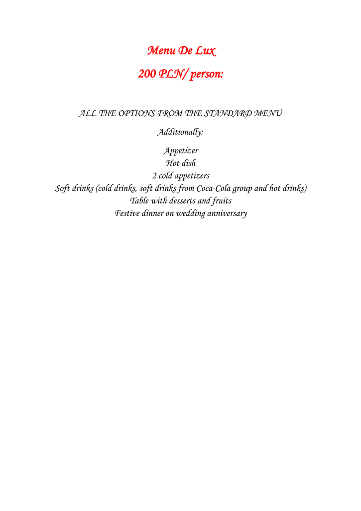 Menu De Lux 200 PLN/ person: ALL THE OPTIONS FROM THE STANDARD MENU Additionally: Appetizer Hot dish 2 cold appetizers Soft drinks (cold drinks, soft drinks from Coca-Cola group and hot drinks) Table with desserts and fruits Festive dinner on wedding anniversary