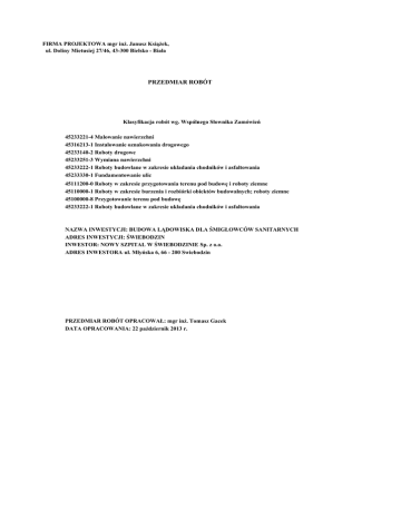 FIRMA PROJEKTOWA mgr inż. Janusz Książek, ul. Doliny Mietusiej 27/46, 43-300 Bielsko - Biała PRZEDMIAR ROBÓT Klasyfikacja robót wg. Wspólnego Słownika Zamówień 45233221-4 Malowanie nawierzchni 45316213-1 Instalowanie oznakowania drogowego 45233140-2 Roboty drogowe 45233251-3 Wymiana nawierzchni 45233222-1 Roboty budowlane w zakresie układania chodników i asfaltowania 45233330-1 Fundamentowanie ulic 45111200-0 Roboty w zakresie przygotowania terenu pod budowę i roboty ziemne 45110000-1 Roboty w zakresie burzenia i rozbiórki obiektów budowalnych; roboty ziemne 45100000-8 Przygotowanie terenu pod budowę 45233222-1 Roboty budowlane w zakresie układania chodników i asfaltowania NAZWA INWESTYCJI: BUDOWA LĄDOWISKA DLA ŚMIGŁOWCÓW SANITARNYCH ADRES INWESTYCJI: ŚWIEBODZIN INWESTOR: NOWY SZPITAL W ŚWIEBODZINIE Sp. z o.o. ADRES INWESTORA:ul. Młyńska 6, 66 - 200 Swiebodzin PRZEDMIAR ROBÓT OPRACOWAŁ: mgr inż. Tomasz Gacek DATA OPRACOWANIA: 22 październik 2013 r. Przedmiar robót ZADANIE: Projekt budowlano - wykonawczy budowy lądowiska sanitarnego dla śmigłowców na terenie: Nowy Szpital w Świebodzinie sp. z o.o. ul. Młyńska 6, 66-200 Świebodzin CZĘŚĆ: Drogowa OPIS ROBÓT Lp. Nr. STWiORB D-01.00.00 Elementy rozliczeniowe robót ZGODNIE Z KONTRAKTEM Jedn. miary Cena Ilość jedn. (netto) 1 2 Roboty przygotowawcze Odtworzenie trasy i punktów wysokościowych Usuniecie humusu grubości 15cm m 3 Wycinka drzew wraz z usunięciem karpiny oraz odwozem na odl. 10 km szt. 39,00 4 Przycięcie drzew Przygotowanie zaplecza budowy i utrzymanie (wykonanie i późniejszy demontaż) Rozbiórka elementów dróg i ulic Rozbiórka krawężników betonowych wraz z odwozem i utylizacją odl. 10km 5 D-01.02.04 6 7 Rozbiórka obrzeży betonowych wraz z odwozem i utylizacją odl. 10km 8 9 Rozbiórka pobocza gruntowego Rozbiórka ogrodzenia z siatki wraz z fundamentami Roboty ziemne Wykonanie nasypu – platforma robocza dla palownicy pospółka 32120mm gr min 50cm Wykonanie nasypu – materiał z dokopu D-02.00.00 10 11 12 D-02.01.01e 13 D-02.03.01b 14 15 16 D-04.00.00 D-04.02.01 17 D-04.04.02 Wykonanie wykopu w torfie pod platformę roboczą wraz z odwozem nadmiaru na odl. do 10 km Wzmocnienie podłoża gruntowego kolumnami wibrocementomywi i wibrobetonowymi Wzmocnienie podłoża w postaci kolumn CMC ha 2 0,70 1 890,00 szt. 19,00 kpl. 1,00 m 17,00 m 8,00 2 m m 24,00 150,00 m3 945,00 m 3 186,40 m 3 539,20 m2 1 550,00 m2 1 550,00 m2 m2 3 150,00 1 665,00 m2 1 550,00 Wzmocnienie podłoża geosyntetykiem Wzmocnienie podłoża geosiatką PET układaną podwójnie krzyżowo 30/300 o wymiarach oczek 40/40mm Warstwa ochronna z piasku gr 5 cm Ułożenie warstwy z geomembrany gr 1,5mm wraz ze zgrzewem Podbudowy Warstwy odsączające i odcinające Ułożenie geosyntetyku z włókniny polipropylenowej przeszywanej włóknami poliestrowymi Podbudowa z kruszywa łamanego stabilizowanego mechanicznie 18 Warstwa transmisyjna z kruszywa łamanego gr. 60 cm pod jezdnią i polem wzlotów m2 240,00 19 Warstwa transmisyjna z kruszywa łamanego gr. 50 cm pod jezdnią i polem wzlotów m2 334,00 20 Warstwa transmisyjna z kruszywa łamanego gr. 30 cm pod jezdnią i polem wzlotów m2 856,00 Podbudowa z kruszywa łamanego gr. 15 cm 21 D-04.04.02 22 D-05.01.00 23 D-05.03.23 24 25 26 Podbudowa z chudego betonu Warstwa podbudowy z betonu klasy C20/25 gr. 22 cm Nawierzchnie gruntowe naturalne Wykonanie nawierzchni trawiastej w strefie przyziemienia i wzlotów z humusu gr. 15cm Nawierzchnia z kostki brukowej betonowej Wykonanie nawierzchni z czerwonej kostki betonowej brukowej gr. 8cm na podsypce pisakowo cementowej gr. 3cm Wykonanie nawierzchni z szarej bezfazowej kostki betonowej brukowej gr. 8cm na podsypce pisakowo cementowej gr. 3cm Wykonanie nawierzchni z kostki szarej betonowej brukowej gr. 8cm na podsypce pisakowo cementowej gr. 3cm 2 jednostkowa m 30,00 m2 225,00 m2 350,00 m2 305,00 m2 225,00 m2 24,00 Wartość (netto) Przedmiar robót ZADANIE: Projekt budowlano - wykonawczy budowy lądowiska sanitarnego dla śmigłowców na terenie: Nowy Szpital w Świebodzinie sp. z o.o. ul. Młyńska 6, 66-200 Świebodzin CZĘŚĆ: Drogowa OPIS ROBÓT Lp. Nr. STWiORB D-06.01.01 Elementy rozliczeniowe robót ZGODNIE Z KONTRAKTEM Jedn. miary Cena Ilość jedn. Humusowanie m 2 580,00 m 2 45,00 30 31 Wykonanie bramy wjazdowej rozwieranej o wysokości min 1,80m szt. 1,00 32 33 szt. m 140,00 1 026,00 m 140,00 m 140,00 36 Zwyżka w kształcie litery V (min wys. 64cm) Drut kolczasty do przeptlotu przez zwyżkę Oporniki Ułożenie betonowych oporników drogowych 12x30cm na ławie betonowej z oporem z betonu C20/25 o wym.35x35 cm Ułożenie krawężników betonowych 15x30 na ławie betonowej z oporem z betonu C20/25 Roboty inne Fundamenty palowe dł. 4,5m (titan) pod ogrodzenie szt. 162,00 37 Fundamenty palowe dł. 4,5m (titan) pod oświetlenie i wskaźnik wiatrów szt. 7,00 38 Oczep żelbetowy o wymiarach 60x60x60cm na fundamentach palowych szt. 169,00 39 Pompowanie wody z wykopów godz. 240,00 D-07.01.01 28 29 D-07.06.01 D-08.01.01 34 35 Wartość (netto) (netto) Humusowanie z obsianiem trawą gr.10cm Oznakowanie poziome Cienkowarstwowe oznakowanie farbą koloru białego miejsca przyziemienia śmigłowca, strefy TLOF oraz oznaczników Cienkowarstwowe oznakowanie lądowiska farbą w formie litery „H” w kolorze czerwonym Ogrodzenia Ogrodzenie o wys. min 1,80m ( siatka pleciona lub zgrzewana) 27 jednostkowa m2 3,00 m 342,00 Suma wartości robót netto: Stawka podatku VAT 23 %. Kwota podatku VAT: Ogółem wartość robót brutto: Podpis Wykonawcy/Pełnomocnika