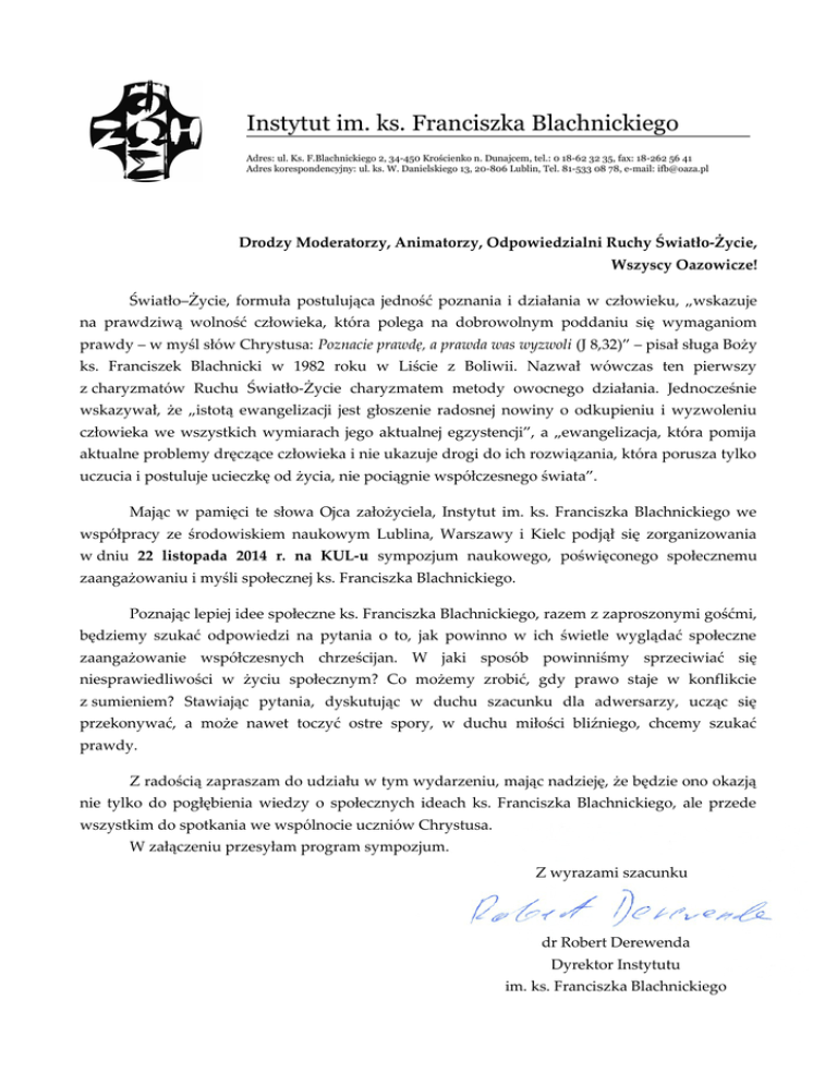 Instytut im. ks. Franciszka Blachnickiego Adres: ul. Ks. F.Blachnickiego 2, 34-450 Krościenko n. Dunajcem, tel.: 0 18-62 32 35, fax: 18-262 56 41 Adres korespondencyjny: ul. ks. W. Danielskiego 13, 20-806 Lublin, Tel. 81-533 08 78, e-mail: [email protected] Drodzy Moderatorzy, Animatorzy, Odpowiedzialni Ruchy Światło-Życie, Wszyscy Oazowicze! Światło–Życie, formuła postulująca jedność poznania i działania w człowieku, „wskazuje na prawdziwą wolność człowieka, która polega na dobrowolnym poddaniu się wymaganiom prawdy – w myśl słów Chrystusa: Poznacie prawdę, a prawda was wyzwoli (J 8,32)” – pisał sługa Boży ks. Franciszek Blachnicki w 1982 roku w Liście z Boliwii. Nazwał wówczas ten pierwszy z charyzmatów Ruchu Światło-Życie charyzmatem metody owocnego działania. Jednocześnie wskazywał, że „istotą ewangelizacji jest głoszenie radosnej nowiny o odkupieniu i wyzwoleniu człowieka we wszystkich wymiarach jego aktualnej egzystencji”, a „ewangelizacja, która pomija aktualne problemy dręczące człowieka i nie ukazuje drogi do ich rozwiązania, która porusza tylko uczucia i postuluje ucieczkę od życia, nie pociągnie współczesnego świata”. Mając w pamięci te słowa Ojca założyciela, Instytut im. ks. Franciszka Blachnickiego we współpracy ze środowiskiem naukowym Lublina, Warszawy i Kielc podjął się zorganizowania w dniu 22 listopada 2014 r. na KUL-u sympozjum naukowego, poświęconego społecznemu zaangażowaniu i myśli społecznej ks. Franciszka Blachnickiego. Poznając lepiej idee społeczne ks. Franciszka Blachnickiego, razem z zaproszonymi gośćmi, będziemy szukać odpowiedzi na pytania o to, jak powinno w ich świetle wyglądać społeczne zaangażowanie współczesnych chrześcijan. W jaki sposób powinniśmy sprzeciwiać się niesprawiedliwości w życiu społecznym? Co możemy zrobić, gdy prawo staje w konflikcie z sumieniem? Stawiając pytania, dyskutując w duchu szacunku dla adwersarzy, ucząc się przekonywać, a może nawet toczyć ostre spory, w duchu miłości bliźniego, chcemy szukać prawdy. Z radością zapraszam do udziału w tym wydarzeniu, mając nadzieję, że będzie ono okazją nie tylko do pogłębienia wiedzy o społecznych ideach ks. Franciszka Blachnickiego, ale przede wszystkim do spotkania we wspólnocie uczniów Chrystusa. W załączeniu przesyłam program sympozjum. Z wyrazami szacunku dr Robert Derewenda Dyrektor Instytutu im. ks. Franciszka Blachnickiego KIK Wiara, jeśli jest konsekwentna, tworzy fakty społeczne KLUB INTELIGENCJI KATOLICKIEJ W LUBLINIE Instytut im. ks. Franciszka Blachnickiego Klub Inteligencji Katolickiej w Lublinie im. prof. Czesława Strzeszewskiego Katedra Świata Hiszpańskiego, Polityki i Relacji Międzynarodowych KUL oraz Instytut Formacji Pastoralno-Liturgicznej (KUL) Stowarzyszenie Diakonia Ruchu Światło-Życie Archidiecezji Lubelskiej – ks. Franciszek Blachnicki zapraszają na sympozjum KONTYNUOWAĆ DZIAŁALNOŚĆ SPOŁECZNĄ ks. Franciszka Blachnickiego DZIŚ 2014 r. aula KUL im. Stefana kard. Wyszyńskiego PROGRAM SYMPOZJUM 8.00 E u c h a r y s t i a w Kościele Akademickim KUL 9.15 Otwarcie sympozjum Sesja I O wolność i godność człowieka i narodów przewodniczy dr hab. Maciej Münnich, Dyrektor Instytutu Historii KUL 9.30 22 XI 13.00 Godne życie rodziny dziś – mgr Bożena Pietras, Przewodnicząca Związku Dużych Rodzin w Lublinie 13.30 Polska szkoła – nadzieje i zagrożenia – mgr Radosław Brzózka, Naczelnik Wydziału Edukacji, Kultury i Sportu Starostwa Powiatowego w Świdniku 14.00 Dyskusja 14.30 Przerwa obiadowa Sesja III Zaangażowanie społeczne ks. Franciszka Blachnickiego – dr Robert Derewenda, Dyrektor Instytutu im. ks. Franciszka Blachnickiego 10.00 Nauczanie społeczne ks. Franciszka Blachnickiego w formacji i działaniu Ruchu Światło-Życie – ks. dr Adam Wodarczyk, Moderator Generalny Ruchu Światło-Życie 10.30 Ruch Światło-Życie wobec współczesnych ideologii – dr hab. Mieczysław Ryba, prof. KUL, Prezes Klubu Inteligencji Katolickiej w Lublinie 11.00 Dyskusja 11.15 Przerwa na kawę Sesja II W służbie godności osoby i rodziny przewodniczy dr hab. Witold Kowalczyk, prof. UMCS, Przewodniczący Rady Instytutu im. ks. Franciszka Blachnickiego 12.00 Lekarz wobec wartości życia – prof. dr hab. Bogdan Chazan, Uniwersytet Jana Kochanowskiego w Kielcach 12.30 Episkopat Polski wobec współczesnych zagrożeń społecznych – bp dr Adam Szal, Delegat Episkopatu ds. Ruchu Światło-Życie Rejestracja uczestnictwa na stronie O prawdę i wolność w życiu społecznym Studium panelowe – prowadzi: dr Radosław Hałas Część 1 15.30 Referaty wprowadzające: Wszystko mi wolno: czy mówienie o grzechu nie narusza wolności? – ks. dr hab. Sławomir Nowosad, prof. KUL, Instytut Teologii Moralnej KUL Uczę (się), jak chcę: spory o wolność w edukacji – dr Agnieszka Salamucha, Zakład Pedagogiki Resocjalizacyjnej UW Wolność wyboru: prawo do aborcji czy prawo do życia? – dr hab. Krzysztof Wiak, prof. KUL, Katedra Prawa Karnego KUL, Papieska Akademia Życia Wolność gospodarcza: czy zawsze trzeba płacić podatki? – dr hab. Andrzej Niezgoda, Katedra Prawa Finansowego UMCS Wolność narodu: czy zagraża nam wojna? – dr hab. Wojciech Gizicki, Katedra Stosunków Międzynarodowych KUL Część 2 16.45 Dyskusja panelowa 17.45 Podsumowanie sympozjum sympozjum.oaza.pl