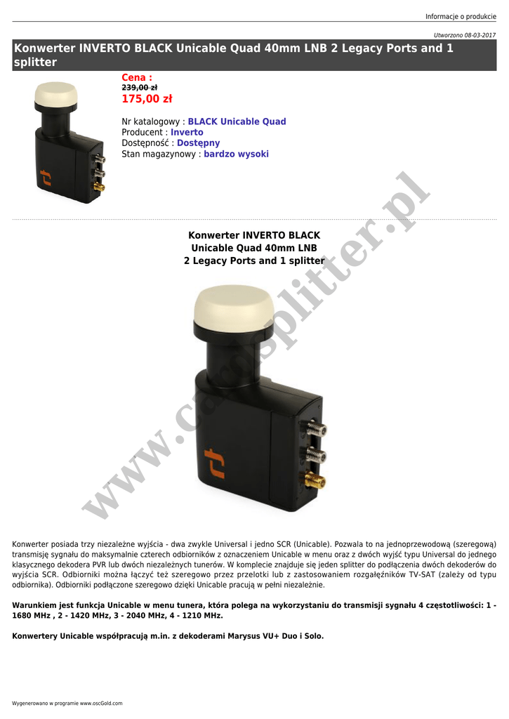 Informacje o produkcie Utworzono 08-03-2017 Konwerter INVERTO BLACK Unicable Quad 40mm LNB 2 Legacy Ports and 1 splitter Cena : 239,00 zł 175,00 zł w w w .c ar d sp lit te r Konwerter INVERTO BLACK Unicable Quad 40mm LNB 2 Legacy Ports and 1 splitter .p l Nr katalogowy : BLACK Unicable Quad Producent : Inverto Dostępność : Dostępny Stan magazynowy : bardzo wysoki Konwerter posiada trzy niezależne wyjścia - dwa zwykle Universal i jedno SCR (Unicable). Pozwala to na jednoprzewodową (szeregową) transmisję sygnału do maksymalnie czterech odbiorników z oznaczeniem Unicable w menu oraz z dwóch wyjść typu Universal do jednego klasycznego dekodera PVR lub dwóch niezależnych tunerów. W komplecie znajduje się jeden splitter do podłączenia dwóch dekoderów do wyjścia SCR. Odbiorniki można łączyć też szeregowo przez przelotki lub z zastosowaniem rozgałęźników TV-SAT (zależy od typu odbiornika). Odbiorniki podłączone szeregowo dzięki Unicable pracują w pełni niezależnie. Warunkiem jest funkcja Unicable w menu tunera, która polega na wykorzystaniu do transmisji sygnału 4 częstotliwości: 1 1680 MHz , 2 - 1420 MHz, 3 - 2040 MHz, 4 - 1210 MHz. Konwertery Unicable współpracują m.in. z dekoderami Marysus VU+ Duo i Solo. Wygenerowano w programie www.oscGold.com sp lit te r Typ konwertera Unicable + 2 wyjścia Legacy Zysk/Gain min. 55dB Współczynnik szumów 200 mA przy 13,5V Pobór prądu TAK Masa/Weight 350g Średnica mocowania 40mm Zakres częstotliwości wejściowych min 40dB Zakres częstotliwości wyjściowych min 20dB Przykładowa konfiguracja 4 odbiorniki w trybie SCR oraz 2 standardowe Częstotliwości SCR 1210 MHz, 1680 MHz , 1420 MHz, 2040 MHz .p l Specyfikacja: w w w .c ar d Gwarancja 24 miesiące