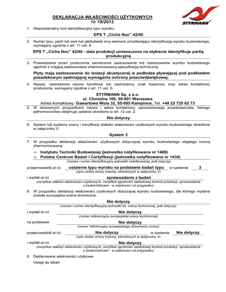 DEKLARACJA WŁAŚCIWOŚCI UŻYTKOWYCH Nr 19/2013 1. Niepowtarzalny kod identyfikacyjny typu wyrobu: EPS T „Cicha Noc” 42/40 2. Numer typu, partii lub serii lub jakikolwiek inny element umożliwiający identyfikację wyrobu budowlanego, wymagany zgodnie z art. 11 ust. 4: EPS T „Cicha Noc” 42/40 - data produkcji umieszczona na etykiecie identyfikuje partię produkcyjną 3. Przewidziane przez producenta zamierzone zastosowanie lub zastosowania wyrobu budowlanego zgodnie z mającą zastosowanie zharmonizowaną specyfikacją techniczną: Płyty mają zastosowanie do izolacji akustycznej w podłodze pływającej pod podkładem posadzkowym spełniającej wymagania ochrony przeciwdźwiękowej. 4. Nazwa, zastrzeżona nazwa handlowa lub zastrzeżony znak towarowy oraz adres kontaktowy producenta, wymagany zgodnie z art. 11 ust. 5: STYRMANN Sp. z o.o. ul. Chmielna 100, 00-801 Warszawa Adres kontaktowy: Gawartowa Wola 32, 05-085 Kampinos, Tel. +48 22 725 62 73 5. W stosownych przypadkach nazwa i adres kontaktowy upoważnionego przedstawiciela, którego pełnomocnictwo obejmuje zadania określone w art. 12 ust. 2: Nie dotyczy 6. System lub systemy oceny i weryfikacji stałości właściwości użytkowych wyrobu budowlanego określone w załączniku V: System 3 7. W przypadku deklaracji właściwości użytkowych dotyczącej wyrobu budowlanego objętego normą zharmonizowaną: • • Instytutu Techniki Budowlanej (jednostka notyfikowana nr 1488) Polskie Centrum Badań i Certyfikacji (jednostka notyfikowana nr 1434) (nazwa i numer identyfikacyjny jednostki notyfikowanej, jeśli dotyczy) przeprowadził(-a/-o) ustalenie typu wyrobu na podstawie badań typu w systemie 3 (opis zadań strony trzeciej, określonych w załączniku V) i wydał(-a/-o) sprawozdanie z badań (certyfikat stałości właściwości użytkowych, certyfikat zgodności zakładowej kontroli produkcji, sprawozdania z badań/obliczeń - w zależności od przypadku) 8. W przypadku deklaracji właściwości użytkowych dotyczącej wyrobu budowlanego, dla którego wydana została europejska ocena techniczna: Nie dotyczy (nazwa i numer identyfikacyjny jednostki ds. oceny technicznej, jeśli dotyczy) i wydał(-a/-o) Nie dotyczy (numer referencyjny europejskiej oceny technicznej) na podstawie Nie dotyczy (numer referencyjny europejskiego dokumentu oceny) Nie dotyczy przeprowadził(-a/-o) w systemie Nie dotyczy (opis zadań strony trzeciej, określonych w załączniku V) i wydał(-a/-o) Nie dotyczy (certyfikat stałości właściwości użytkowych, certyfikat zgodności zakładowej kontroli produkcji, sprawozdania z badań/obliczeń - w zależności od przypadku) 9. Deklarowane właściwości użytkowe Uwagi do tabeli: 1. Kolumna 1 zawiera wykaz zasadniczych charakterystyk określonych w zharmonizowanych specyfikacjach technicznych dla zamierzonego zastosowania lub zamierzonych zastosowań wskazanych w pkt 3 powyżej. 2. Dla każdej zasadniczej charakterystyki wymienionej w kolumnie 1 i zgodnie z wymaganiami art. 6 kolumna 2 zawiera deklarowane właściwości użytkowe wyrażone jako poziom lub klasa, lub w sposób opisowy, powiązane z odpowiednimi zasadniczymi charakterystykami. Zawiera litery „NPD” (właściwości użytkowe nieustalone; ang. No Performance Determined), o ile właściwości użytkowe nie zostały zadeklarowane. 3. Dla każdej zasadniczej charakterystyki wymienionej w kolumnie 1 kolumna 3 zawiera: a) datowane odniesienie do odpowiedniej normy zharmonizowanej oraz w stosownych wypadkach numer referencyjny zastosowanej specjalnej lub odpowiedniej dokumentacji technicznej; lub b) datowane odniesienie do odpowiedniego europejskiego dokumentu oceny, w przypadku gdy jest on dostępny, oraz numer referencyjny zastosowanej europejskiej oceny technicznej. Zasadnicze charakterystyki (zob. uwaga 1) Długość Szerokość Grubość Prostokątność Płaskość Reakcja na ogień Ciągłe spalanie w postaci żarzenia Długotrwała nasiąkliwość wodą Absorpcja wody przy długotrwałej dyfuzji Uwalnianie się substancji niebezpiecznych do środowiska wewnętrznego Wskaźnik izolacyjności od dźwięków powietrznych przenoszonych drogą bezpośrednią Wskaźnik pochłaniania dźwięku Właściwości użytkowe (zob. uwaga 2) L(3) W(3) T(2) S(5) P(10) E NPD NPD NPD NPD SD15 NPD Wskaźnik izolacyjności od dźwięków uderzeniowych (dla podłóg) NPD Opór cieplny 0,93 Współczynnik przewodzenia ciepła Przepuszczalność pary wodnej Naprężenie ściskające przy 10 % odkształceniu Wytrzymałość na zginanie Wytrzymałość na rozciąganie prostopadle do powierzchni czołowych Trwałość reakcji na ogień w funkcji ciepła, warunków atmosferycznych, starzenia/degradacji Trwałość oporu cieplnego w funkcji ciepła, warunków atmosferycznych, starzenia/degradacji Stabilność wymiarowa w określonych warunkach temperaturowych Stabilność wymiarowa w określonych warunkach temperaturowych i wilgotnościowych Trwałość właściwości Odkształcenie w określonych warunkach obciążenia ściskającego i temperatury Trwałość wytrzymałości na ściskanie w funkcji starzenia i degradacji Odporność na zamrażanie-odmrażanie Długotrwała redukcja grubości Ściśliwość Zharmonizowana specyfikacja techniczna (zob. uwaga 3) Nie więcej niż 0,045 W/m⋅K NPD NPD BS50 NPD Brak zmian Brak zmian DS(N)5 NPD Brak zmian NPD NPD NPD NPD CP3 EN 13163:2012 W przypadku gdy na podstawie art. 37 lub 38 zastosowana została specjalna dokumentacja techniczna, wymagania, z którymi wyrób jest zgodny: Nie dotyczy 10. Właściwości użytkowe wyrobu określone w pkt 1 i 2 są zgodne z właściwościami użytkowymi deklarowanymi w pkt 9. Niniejsza deklaracja właściwości użytkowych wydana zostaje na wyłączną odpowiedzialność producenta określonego w pkt 4. W imieniu producenta podpisał(-a): Maciej Zawiślak - Dyrektor (imię nazwisko i stanowisko) Gawartowa Wola, dnia 01.07.2013r. (miejsce i data) (podpis)