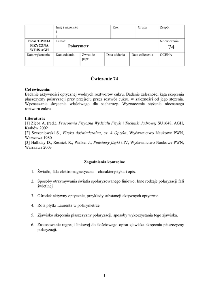 PRACOWNIA FIZYCZNA WFiIS AGH Data wykonania Imię i nazwisko 1. 2. Temat: Rok Grupa Nr ćwiczenia Polarymetr Data oddania Zespół 74 Zwrot do popr. Data oddania Data zaliczenia OCENA Ćwiczenie 74 Cel ćwiczenia: Badanie aktywności optycznej wodnych roztworów cukru. Badanie zależności kąta skręcenia płaszczyzny polaryzacji przy przejściu przez roztwór cukru, w zależności od jego stężenia. Wyznaczanie skręcenia właściwego dla sacharozy. Wyznaczenia stężenia nieznanego roztworu cukru Literatura: [1] Zięba A. (red.), Pracownia Fizyczna Wydziału Fizyki i Techniki Jądrowej SU1648, AGH, Kraków 2002 [2] Szczeniowski S., Fizyka doświadczalna, cz. 4 Optyka, Wydawnictwo Naukowe PWN, Warszawa 1980 [3] Halliday D., Resnick R., Walker J., Podstawy fizyki t.IV, Wydawnictwo Naukowe PWN, Warszawa 2003 Zagadnienia kontrolne 1. Światło, fala elektromagnetyczna – charakterystyka i opis. 2. Sposoby otrzymywania światła spolaryzowanego liniowo. Inne rodzaje polaryzacji fali świetlnej. 3. Ośrodek aktywny optycznie, przykłady substancji aktywnych optycznie. 4. Rola płytki Laurenta w polarymetrze. 5. Zjawisko skręcenia płaszczyzny polaryzacji, sposoby wykorzystania tego zjawiska. 6. Zastosowanie regresji liniowej do ilościowego opisu zjawiska skręcenia płaszczyzny polaryzacji. 1 Użyteczne wzory i stale fizyczne Niektóre substancje wykazują aktywność optyczną polegającą na skręceniu płaszczyzny polaryzacji przechodzącego przez nie światła. Taką aktywność optyczną mogą wykazywać kryształy, ciecze i roztwory niektórych substancji, miedzy innymi roztwory naturalnej sacharozy (cukru). Aktywność optyczna substancji występuje wówczas, kiedy jej cząsteczki maja szczególną budowę chemiczną i mogę występować w postaci dwóch tzw. enancjomerów, które są swoimi lustrzanymi odbiciami. Sacharoza (popularny „cukier”) produkowana przez organizmy żywe jest złożona z takich cząsteczek jednego rodzaju („prawoskrętnych”), które nie posiadają zwierciadlanego odbicia (natomiast sacharoza produkowana chemicznie składa się w równej części z „prawoskrętnych” i „lewoskrętnych” cząsteczek, przez co efekt skręcenia płaszczyzny polaryzacji się niweluje). W przypadku roztworów cukru o niskim stężeniu, kąt skręcenia płaszczyzny polaryzacji jest proporcjonalny do drogi L jaką światło przebywa w roztworze oraz do stężenia roztworu C: 𝛼 = [𝛼 ]20℃ ∙𝐶∙𝐿 (1) 𝐷 Gdzie współczynnik [𝛼 ]20℃ 𝐷 nazywany jest skręceniem właściwym charakterystycznym dla danej substancji rozpuszczonej, i zależy od: rodzaju rozpuszczalnika, długości fali światła i temperatury roztworu. Standardowo skręcenie właściwe określane jest dla światła sodowego (linia D o długości =589,3 nm). Skręcenie właściwe definiowane jest jako kąt, o który skręca się płaszczyzna polaryzacji światła sodowego przy przejściu przez roztwór przygotowany w proporcjach 1g substancji na 10cm3 roztworu, przechodząc przez słup roztworu o długości 10cm, w temperaturze 20 oC. Wartość skręcenia właściwego dla wodnego roztworu cukru w temperaturze 20oC wynosi: [𝛼 ]20℃ = 66,5 𝐷 deg∙ cm3 (2) dm∙g W literaturze i tablicach można spotkać zapis skręcenia właściwego z jednostkami: 66,5 o, gdzie w domyśle są pozostałe jednostki, lub rzadziej używany zapis 6,65 ewentualnie 0,665 deg∙ m2 kg deg∙ cm2 g , w jednostkach układu Si. Jeżeli mierzony roztwór znajduje się w innej niż 20oC temperaturze , należy wprowadzić poprawkę zgodnie z następującym wyrażeniem: [𝛼]𝜃 𝐷 [𝛼 ]20℃ = 1−0,00037(𝜃−20℃) 𝐷 Wzór (3) jest słuszny jedynie dla sacharozy. Przyrządy W ćwiczeniu wykorzystywany jest polarymetr półcieniowy z płytką Laurenta. Polarymetr jest wyposażony w: 1. Źródło światła - lampa sodowa (dł. fali 589,3 nm) 2. Zasilacz lampy sodowej 220-230V, 50Hz 3. Element optyczny z wykorzystaniem kwarcowej płytki Laurenta 4. Okular do obserwacji obrazu otrzymanego z analizatora, z regulacją ostrości 2 (3) 5. Dokładną skalę z noniuszem do odczytu położenia polaryzator/analizator w zakresie 0-180 stopni, z dokładnością 0.05 stopnia 6. Tubę z wymiennymi kuwetami w zakresie długości kuwet 100-200mm 7. Podstawę łączącą wyżej wymienione elementy W ćwiczeniu dokonujemy pomiaru kąta o jaki obrócony jest analizator względem polaryzatora. Płytka Laurenta zastosowana w polarymetrze ułatwia ocenę kontrastu obrazu widocznego w okularze. Analizator sprzęgnięty jest ze skalą kątową (w stopniach). Odczytu kąta skręcenia dokonujemy, gdy obraz w okularze jest jednakowo zaciemniony (minimalne przekręcenie w jedną stronę powoduje pojawienie się ciemniejszych pasków po bokach obrazu, a minimalne przekręcenie w drugą stronę daje ciemniejszy pasek pośrodku). Wykonanie ćwiczenia 1. Ustalenie położenia zerowego polarymetru. Dokładnie wypłukaną kuwetę napełnić wodą destylowaną. Zmierzyć 7-10 razy położenie analizatora przy jednolicie zaciemnionym polu widzenia. Na skali kątowej położenie analizatora należy odczytywać tak jak dla suwmiarki. UWAGA: jeśli któryś z końców kuwety jest wyszczerbiony, należy kuwetę przez cały czas umieszczać tym końcem do góry, aby zapobiec wyciekaniu roztworu/wody. Równie istotne jest aby w kuwecie nie znajdował się pęcherzyk powietrza. Przy zamykaniu kuwety obowiązuje kolejność: kuweta, szkiełko, uszczelka gumowa, nakrętka. Długość kuwety widnieje na kuwecie i podana jest w milimetrach. 2. Przygotowanie roztworów cukru. Przy użyciu kolby miarowej bądź menzurki przygotować roztwór wagowo-objętościowy. W tym celu odważyć należy żądaną ilość cukru. Wsypać do kolby lub menzurki. Uzupełnić roztwór wodą do całkowitej objętości 100cm3. Cierpliwie mieszać do zupełnego rozpuszczenia cukru w wodzie. Zanotować w tabeli stężenie. Napełnić kuwetę. Wykonać 710 pomiarów k