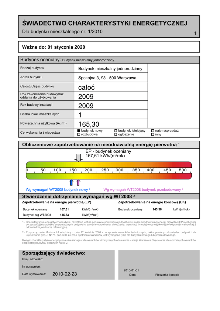 ŚWIADECTWO CHARAKTERYSTYKI ENERGETYCZNEJ Dla budynku mieszkalnego nr: 1/2010 1 Ważne do: 01 stycznia 2020 Budynek oceniany: Budynek mieszkalny jednorodzinny Rodzaj budynku Budynek mieszkalny jednorodzinny Adres budynku Spokojna 3, 93 - 500 Warszawa Całość/Część budynku ca³oæ 2009 2009 1 165,30 Rok zakończenia budowy/rok oddania do użytkowania Rok budowy instalacji Liczba lokali mieszkalnych Powierzchnia użytkowa (Af, m²) Cel wykonania świadectwa budynek nowy rozbudowa budynek istniejący ogłoszenie najem/sprzedaż inny Obliczeniowe zapotrzebowanie na nieodnawialną energię pierwotną ¹ EP - budynek oceniany 167,61 kWh/(m²rok) Wg wymagań WT2008 budynek nowy ² Wg wymagań WT2008 budynek przebudowany ² Stwierdzenie dotrzymania wymagań wg WT2008 ² Zapotrzebowanie na energię pierwotną (EP) Zapotrzebowanie na energię końcową (EK) Budynek oceniany 167,61 kWh/(m²rok) Budynek oceniany Budynek wg WT2008 145,73 kWh/(m²rok) 143,38 kWh/(m²rok) 1) Charakterystyka energetyczna budynku określana jest na podstawie porównania jednostkowej ilości nieodnawialnej energii pierwotnej EP niezbędnej do zaspokojenia potrzeb energetycznych budynku w zakresie ogrzewania, chłodzenia, wentylacji i ciepłej wody użytkowej (efektywność całkowita) z odpowiednią wartością referencyjną. 2) Rozporządzenie Ministra Infrastruktury z dnia 12 kwietnia 2002 r. w sprawie warunków technicznych, jakim powinny odpowiadać budynki i ich usytuowanie (Dz.U. Nr 75, poz. 690, ze zm.), spełnienie warunków jest wymagane tylko dla budynku nowego lub przebudowanego. Uwaga: charakterystyka energetyczna określana jest dla warunków klimatycznych odniesienia - stacja Warszawa Okęcie oraz dla normalnych warunków eksploatacji budynku podanych na str 2. Sporządzający świadectwo: Imię i nazwisko: Nr uprawnień: Data wystawienia: 2010-02-23 2010-01-01 Data Pieczątka i podpis ŚWIADECTWO CHARAKTERYSTYKI ENERGETYCZNEJ Dla budynku mieszkalnego nr: 1/2010 2 Charakterystyka techniczno-użytkowa budynku Przeznaczenie budynku Budynek mieszkalny Liczba kondygnacji 2 Powierzchnia użytkowa budynku 165,30 [m²] Powierzchnia użytkowa o regulowanej temperaturze (Af) 165,30 [m²] Normalne temperatury eksploatacyjne: zima, lato 20,00 [°C], 20,00 [°C] Podział powierzchni użytkowej: mieszkalna i niemieszkalna mieszkalna: 165,30 [m²], niemieszkalna: 0,00 [m²] Kubatura budynku 946,89 [m³] Wskaźnik zwartości budynku A/Ve 0,73 [1/m] Rodzaj konstrukcji budynku Konstrukcja tradycyjna murowana Liczba użytkowników/mieszkańców 4 Osłona budynku: opis, parametry termiczne Średni współczynnik przenikania ciepła osłony budynku U = 0,276 [W/m²·K] Instalacja ogrzewania: tak/nie, opis, parametry Tak, Kotły gazowe kondensacyjne do 50 kW (55/45 °C) Instalacja wentylacji: tak/nie, opis, parametry Budynek z wentylacją naturalną Instalacja chłodzenia: tak/nie, opis, parametry Nie Instalacja przygotowania ciepłej wody użytkowej: tak/nie, opis, parametry Tak, Kotły gazowe kondensacyjne o mocy do 50 kW Obliczeniowe zapotrzebowanie na energię Roczne jednostkowe zapotrzebowanie na energię końcową [kWh/(m²rok)] Nośnik Energii Ogrzewanie i wentylacja Ciepła woda Urządzenia pomocnicze¹ Suma Paliwo/źródło energii: Gaz ziemny 123,36 20,02 0,00 143,38 Energia elektryczna: Produkcja mieszana * 0,00 0,00 3,30 3,30 Podział zapotrzebowania na energię Roczne jednostkowe zapotrzebowanie na energię użytkową [kWh/(m²rok)] Ogrzewanie i wentylacja Ciepła woda Urządzenia pomocnicze¹ Suma Wartość [kWh/(m²rok)] 114,91 14,57 3,30 132,78 Udział [%] 86,54 10,97 2,48 100,00 Roczne jednostkowe zapotrzebowanie na energię końcową [kWh/(m²rok)] Ogrzewanie i wentylacja Ciepła woda Urządzenia pomocnicze¹ Suma Wartość [kWh/(m²rok)] 123,36 20,02 3,30 146,68 Udział [%] 84,11 13,65 2,25 100,00 Roczne jednostkowe zapotrzebowanie na energię pierwotną [kWh/(m²rok)] Ogrzewanie i wentylacja Ciepła woda Urządzenia pomocnicze¹ Suma Wartość [kWh/(m²rok)] 135,70 22,02 9,89 167,61 Udział [%] 80,96 13,14 5,90 100,00 Sumaryczne roczne jednostkowe zapotrzebowanie na nieodnawialną energię: pierwotną: 167,61 kWh/(m²rok) ¹ - łącznie z chłodzeniem pomieszczeń ² - ciąg dalszy na stronie piątej ŚWIADECTWO CHARAKTERYSTYKI ENERGETYCZNEJ Dla budynku mieszkalnego nr: 1/2010 Uwagi w zakresie możliwości zmniejszenia zapotrzebowania na energię końcową. 1) Możliwe zmiany w zakresie osłony zewnętrznej budynku: 2) Możliwe zmiany w zakresie techniki instalacyjnej i zródła energii: 3) Możliwe zmiany ograniczające zapotrzebowanie na energię końcową w czasie eksploatacji budynku: 4) Możliwe zmiany ograniczające zużycie energii zwiaząne z korzystaniem z ciepłej wody użytkowej: 5) Inne uwagi osoby sporządzającej świadectwo charakterystyki energetycznej: 3 ŚWIADECTWO CHARAKTERYSTYKI ENERGETYCZNEJ Dla budynku mieszkalnego nr: 1/2010 4 Objaśnienia Zapotrzebowanie na energię Zapotrzebowanie na energię w świadectwie charakterystyki energetycznej jest wyrażane poprzez roczne zapotrzebowanie nieodnawialnej energii pierwotnej i poprzez zapotrzebowanie energii końcowej. Wartości te są wyznaczone obliczeniowo na podstawie jednolitej metodologii. Dane do obliczeń określa się na podstawie dokumentacji budowlanej lub obmiaru budynku istniejącego i przyjmuje się standardowe warunki brzegowe (np. standardowe warunki klimatyczne, zdefiniowany sposób eksploatacji, standardowa temperaturę wewnętrzną i wewnętrzne zyski ciepła itp.). Z uwagi na standardowe warunki brzegowe, uzyskane wartości zużycia energii nie pozwalają wnioskować o rzeczywistym zużyciu energii budynku. Zapotrzebowanie na nieodnawialną energię pierwotną Zapotrzebowanie na nieodnawialną energię pierwotną określa efektywność całkowitą budynku. Uwzględnia ona obok energii końcowej, dodatkowe nakłady nieodnawialnej energii pierwotnej na dostarczenie do granicy budynku każdego wykorzystanego nośnika energ