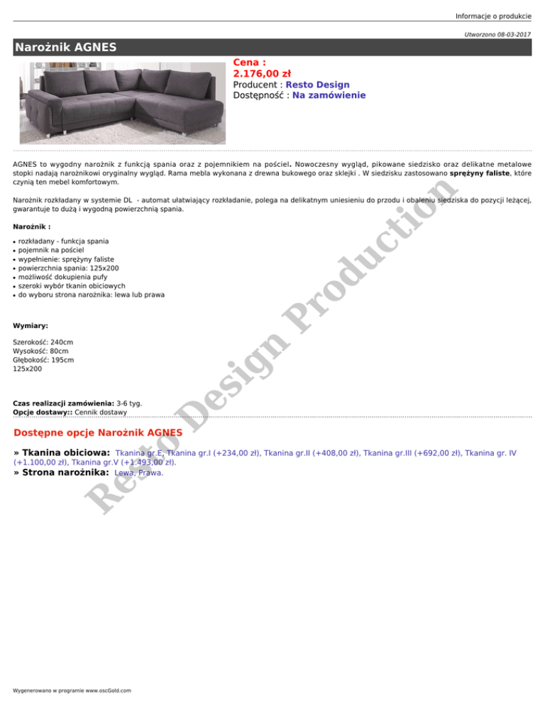 Informacje o produkcie Utworzono 08-03-2017 Narożnik AGNES Cena : 2.176,00 zł Producent : Resto Design Dostępność : Na zamówienie n AGNES to wygodny narożnik z funkcją spania oraz z pojemnikiem na pościel. Nowoczesny wygląd, pikowane siedzisko oraz delikatne metalowe stopki nadają narożnikowi oryginalny wygląd. Rama mebla wykonana z drewna bukowego oraz sklejki . W siedzisku zastosowano sprężyny faliste, które czynią ten mebel komfortowym. Pr od uc ti o Narożnik rozkładany w systemie DL - automat ułatwiający rozkładanie, polega na delikatnym uniesieniu do przodu i obaleniu siedziska do pozycji leżącej, gwarantuje to dużą i wygodną powierzchnią spania. Narożnik : ● ● ● ● ● ● ● rozkładany - funkcja spania pojemnik na pościel wypełnienie: sprężyny faliste powierzchnia spania: 125x200 możliwość dokupienia pufy szeroki wybór tkanin obiciowych do wyboru strona narożnika: lewa lub prawa Wymiary: Czas realizacji zamówienia: 3-6 tyg. Opcje dostawy:: Cennik dostawy D es ig n Szerokość: 240cm Wysokość: 80cm Głębokość: 195cm 125x200 o Dostępne opcje Narożnik AGNES » Tkanina obiciowa: Tkanina gr.E, Tkanina gr.I (+234,00 zł), Tkanina gr.II (+408,00 zł), Tkanina gr.III (+692,00 zł), Tkanina gr. IV R es t (+1.100,00 zł), Tkanina gr.V (+1.493,00 zł). » Strona narożnika: Lewa, Prawa. Wygenerowano w programie www.oscGold.com