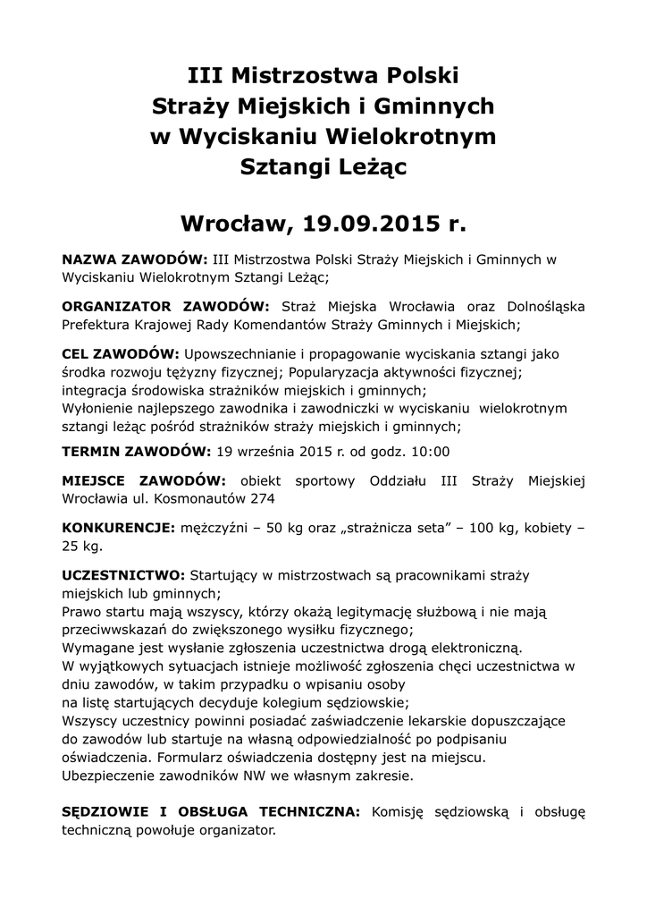 III Mistrzostwa Polski Straży Miejskich i Gminnych w Wyciskaniu Wielokrotnym Sztangi Leżąc Wrocław, 19.09.2015 r. NAZWA ZAWODÓW: III Mistrzostwa Polski Straży Miejskich i Gminnych w Wyciskaniu Wielokrotnym Sztangi Leżąc; ORGANIZATOR ZAWODÓW: Straż Miejska Wrocławia oraz Dolnośląska Prefektura Krajowej Rady Komendantów Straży Gminnych i Miejskich; CEL ZAWODÓW: Upowszechnianie i propagowanie wyciskania sztangi jako środka rozwoju tężyzny fizycznej; Popularyzacja aktywności fizycznej; integracja środowiska strażników miejskich i gminnych; Wyłonienie najlepszego zawodnika i zawodniczki w wyciskaniu wielokrotnym sztangi leżąc pośród strażników straży miejskich i gminnych; TERMIN ZAWODÓW: 19 września 2015 r. od godz. 10:00 MIEJSCE ZAWODÓW: obiekt Wrocławia ul. Kosmonautów 274 sportowy Oddziału III Straży Miejskiej KONKURENCJE: mężczyźni – 50 kg oraz „strażnicza seta” – 100 kg, kobiety – 25 kg. UCZESTNICTWO: Startujący w mistrzostwach są pracownikami straży miejskich lub gminnych; Prawo startu mają wszyscy, którzy okażą legitymację służbową i nie mają przeciwwskazań do zwiększonego wysiłku fizycznego; Wymagane jest wysłanie zgłoszenia uczestnictwa drogą elektroniczną. W wyjątkowych sytuacjach istnieje możliwość zgłoszenia chęci uczestnictwa w dniu zawodów, w takim przypadku o wpisaniu osoby na listę startujących decyduje kolegium sędziowskie; Wszyscy uczestnicy powinni posiadać zaświadczenie lekarskie dopuszczające do zawodów lub startuje na własną odpowiedzialność po podpisaniu oświadczenia. Formularz oświadczenia dostępny jest na miejscu. Ubezpieczenie zawodników NW we własnym zakresie. SĘDZIOWIE I OBSŁUGA TECHNICZNA: Komisję sędziowską i obsługę techniczną powołuje organizator. STRÓJ STARTOWY: Dozwolony jest dowolny strój startowy, obejmujący koszulkę z krótkim rękawem (aby widoczny był wyprost łokcia), spodnie sportowe lub krótkie spodenki. Konieczne jest zmienne obuwie sportowe. Dozwolone jest używanie opasek na nadgarstki, pasów usztywniających kręgosłup (jeśli jest on używany to powinien być noszony na kostiumie sportowym). Dopuszczalne jest używanie rękawiczek podczas wyciskania. WYŁONIENIE ZWYCIĘZCÓW: wygrywa ten zawodnik, który uzyska największą ilość powtórzeń. W razie uzyskania tego samego wyniku, o kolejności decyduje waga zawodnika (lżejszy wygrywa). Wśród zawodników startujących w konkurencji 50 kg i 100 kg wyłoniony zostanie „Najsilniejszy strażnik” – suma powtórzeń w obydwu konkurencjach. Za udział w zawodach nie będzie pobierana opłata startowa. REGULAMIN ZAWODÓW: 1. Limit czasowy wykonywania próby – 5 minut 2. Sposób wykonania ćwiczenia: a. Pozycja leżenia tyłem z nogami opuszczonymi i wspartymi całą powierzchnią stopy o podłoże; b. Wymagany jest kontakt łopatek i pośladków z ławeczką; c. Dowolna szerokość chwytu sztangi; d. Dowolne tempo wykonywania ruchu; 3. Rozpoczęcie próby: a. Zawodnik sam lub z pomocą unosi sztangę ze stojaków; b. Sędzia daje komendę do rozpoczęcia próby gdy sztanga znajdzie się w bezruchu nad zawodnikiem na wyprostowanych w stawach łokciowych ramionach; 4. Zaliczenie ruchu: a. Sędzia zalicza ruch, gdy sztanga dotknie klatki piersiowej i nastąpi pełny wyprost ramion w stawach łokciowych (zaakcentowany), zawodnik może zatrzymać sztangę w „górze”); b. Rozpoczęcie ruchu przed zakończeniem limitu czasowego i jego zakończenie; 5. Niezaliczenie ruchu: a. Sztanga nie miała kontaktu z klatką piersiową; b. Nie nastąpił pełny wyprost ramion w stawach łokciowych; c. Poderwanie pośladków z siedziska ławeczki; d. Oderwanie stóp lub stopy od podłoża; 6. Zakończenie próby: a. Sędzia podał sygnał o zakończeniu limitu czasowego; b. Zawodnik zatrzyma sztangę na klatce piersiowej; c. Zawodnik oderwie stopy od podłoża; d. Zawodnik zmieni zadeklarowaną pozycję startową; e. Zawodnik odłoży sztangę przed upływem 5 minut; f. Zawodnik poprosi o pomoc w odłożeniu sztangi; 7. W przypadku wyrażenia chęci uczestnictwa w dwóch konkurencjach, t.j. wyciskanie 50 kg oraz 100 kg, zawodnicy rozpoczynają konkurencję 50 kg jako pierwsi, natomiast bój w kategorii 100 kg wykonują jako ostatni. Organizator nie ponosi odpowiedzialności za mogące się wydarzyć, w trakcie zawodów i transportu, ewentualne wypadki bądź kradzieże nie z winy organizatora. Wszyscy uczestnicy biorący udział w zawodach, startują na własną odpowiedzialność i nie będą wnosić żadnych roszczeń w stosunku do organizatora w razie zaistnienia zdarzeń losowych podczas trwania imprezy. Wszyscy zawodnicy zobowiązani są do zapoznania się i przestrzegania niniejszego regulaminu. Wszelkie sprawy zaistniałe i niezapisane w niniejszym regulaminie rozstrzyga kolegium sędziowskie. Decyzje te są niepodważalne i nie przysługuje na nie zażalenie.