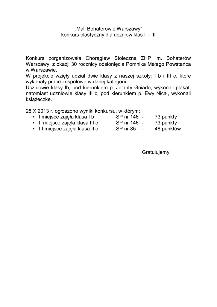 „Mali Bohaterowie Warszawy” konkurs plastyczny dla uczniów klas I – III Konkurs zorganizowała Chorągiew Stołeczna ZHP im. Bohaterów Warszawy, z okazji 30 rocznicy odsłonięcia Pomnika Małego Powstańca w Warszawie. W projekcie wzięły udział dwie klasy z naszej szkoły: I b i III c, które wykonały prace zespołowe w danej kategorii. Uczniowie klasy Ib, pod kierunkiem p. Jolanty Gniado, wykonali plakat, natomiast uczniowie klasy III c, pod kierunkiem p. Ewy Nicał, wykonali książeczkę. 28 X 2013 r. ogłoszono wyniki konkursu, w którym: I miejsce zajęła klasa I b SP nr 146 II miejsce zajęła klasa III c SP nr 146 III miejsce zajęła klasa II c SP nr 85 - 73 punkty 73 punkty 48 punktów Gratulujemy!