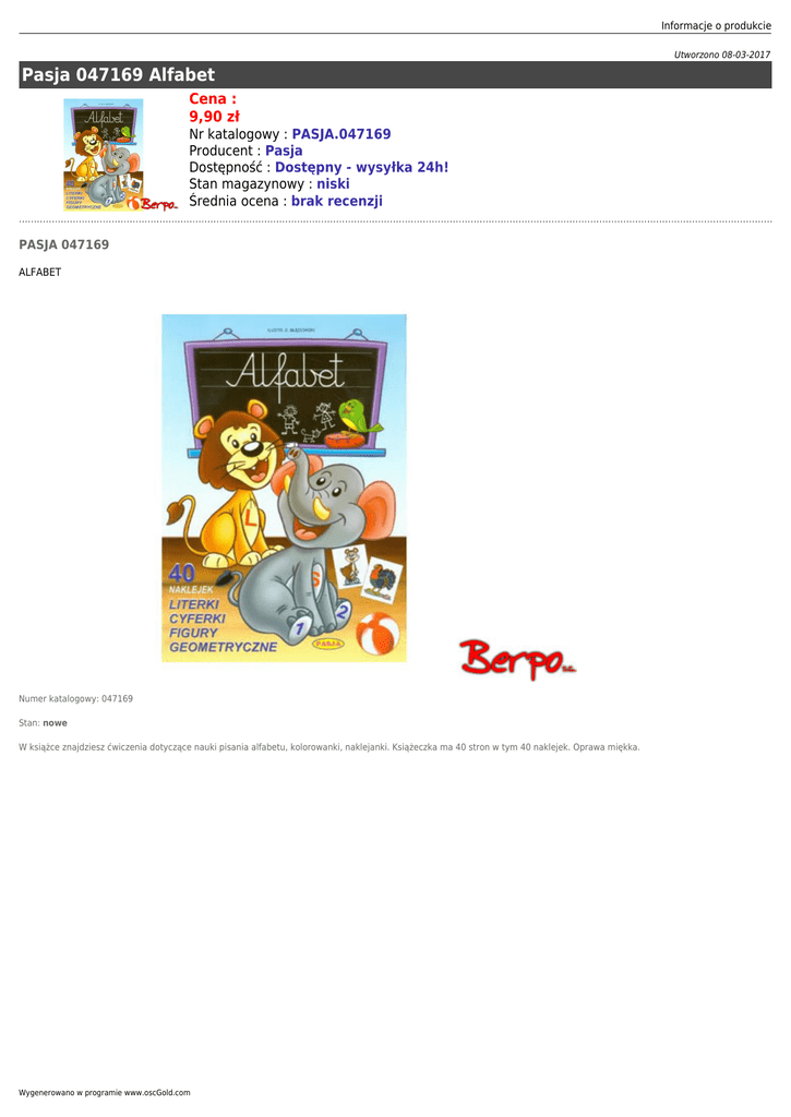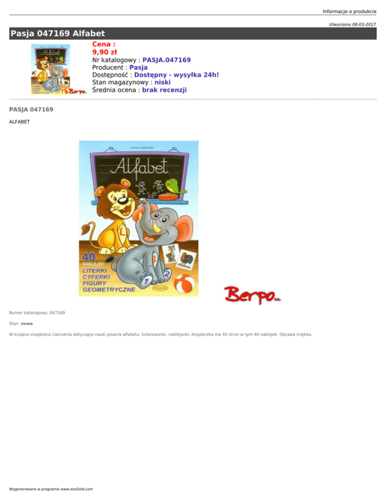 Informacje o produkcie Utworzono 08-03-2017 Pasja 047169 Alfabet Cena : 9,90 zł Nr katalogowy : PASJA.047169 Producent : Pasja Dostępność : Dostępny - wysyłka 24h! Stan magazynowy : niski Średnia ocena : brak recenzji PASJA 047169 ALFABET Numer katalogowy: 047169 Stan: nowe W książce znajdziesz ćwiczenia dotyczące nauki pisania alfabetu, kolorowanki, naklejanki. Książeczka ma 40 stron w tym 40 naklejek. Oprawa miękka. Wygenerowano w programie www.oscGold.com Dostępność w salonach: Ilość sztuk: Sklep - Złotniki: 1 Sklep - zlikwidowany: 0 Sklep - Szczepankowo: 0