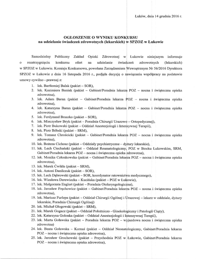 w SPZOZ w Lukowie. Komisja Konkursowa, powolana Zaru4dzeniem llVewngtrznym Nr