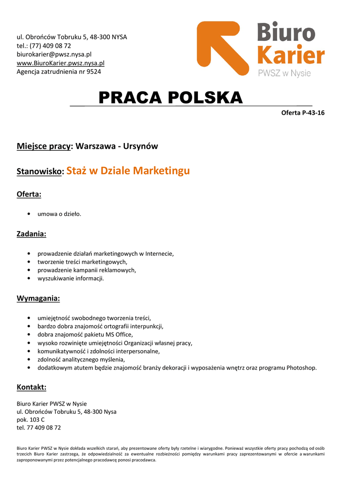 ul. Obrońców Tobruku 5, 48-300 NYSA tel.: (77) 409 08 72 [email protected] www.BiuroKarier.pwsz.nysa.pl Agencja zatrudnienia nr 9524 PRACA POLSKA Oferta P-43-16 Miejsce pracy: Warszawa - Ursynów Stanowisko: Staż w Dziale Marketingu Oferta: • umowa o dzieło. Zadania: • • • • prowadzenie działań marketingowych w Internecie, tworzenie treści marketingowych, prowadzenie kampanii reklamowych, wyszukiwanie informacji. Wymagania: • • • • • • • umiejętność swobodnego tworzenia treści, bardzo dobra znajomość ortografii interpunkcji, dobra znajomość pakietu MS Office, wysoko rozwinięte umiejętności Organizacji własnej pracy, komunikatywność i zdolności interpersonalne, zdolność analitycznego myślenia, dodatkowym atutem będzie znajomość branży dekoracji i wyposażenia wnętrz oraz programu Photoshop. Kontakt: Biuro Karier PWSZ w Nysie ul. Obrońców Tobruku 5, 48-300 Nysa pok. 103 C tel. 77 409 08 72 Biuro Karier PWSZ w Nysie dokłada wszelkich starań, aby prezentowane oferty były rzetelne i wiarygodne. Ponieważ wszystkie oferty pracy pochodzą od osób trzecich Biuro Karier zastrzega, że odpowiedzialność za ewentualne rozbieżności pomiędzy warunkami pracy zaprezentowanymi w ofercie a warunkami zaproponowanymi przez potencjalnego pracodawcę ponosi pracodawca.