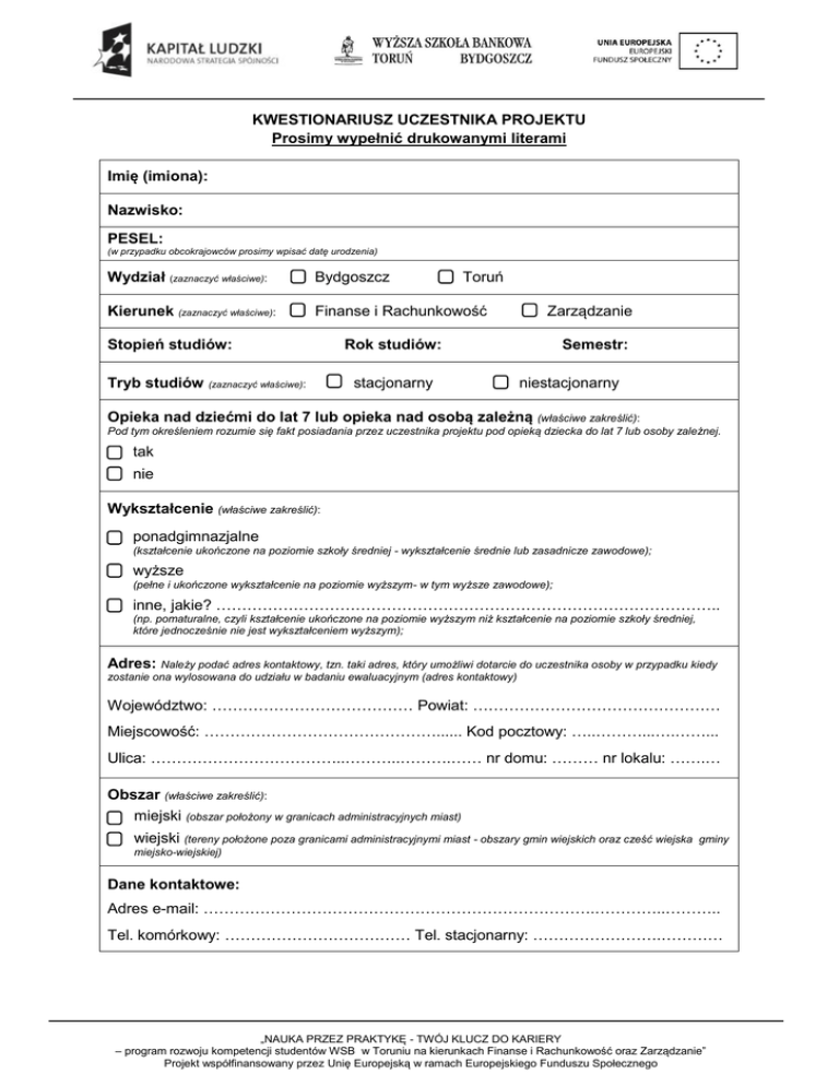 KWESTIONARIUSZ UCZESTNIKA PROJEKTU Prosimy wypełnić drukowanymi literami Imię (imiona): Nazwisko: PESEL: (w przypadku obcokrajowców prosimy wpisać datę urodzenia) Wydział (zaznaczyć właściwe): Bydgoszcz Kierunek (zaznaczyć właściwe): Finanse i Rachunkowość Stopień studiów: Tryb studiów (zaznaczyć właściwe): Toruń Zarządzanie Rok studiów: stacjonarny Semestr: niestacjonarny Opieka nad dziećmi do lat 7 lub opieka nad osobą zależną (właściwe zakreślić): Pod tym określeniem rozumie się fakt posiadania przez uczestnika projektu pod opieką dziecka do lat 7 lub osoby zależnej. tak nie Wykształcenie (właściwe zakreślić): ponadgimnazjalne (kształcenie ukończone na poziomie szkoły średniej - wykształcenie średnie lub zasadnicze zawodowe); wyższe (pełne i ukończone wykształcenie na poziomie wyższym- w tym wyższe zawodowe); inne, jakie? …………………………………………………………………………………….. (np. pomaturalne, czyli kształcenie ukończone na poziomie wyższym niż kształcenie na poziomie szkoły średniej, które jednocześnie nie jest wykształceniem wyższym); Adres: Należy podać adres kontaktowy, tzn. taki adres, który umożliwi dotarcie do uczestnika osoby w przypadku kiedy zostanie ona wylosowana do udziału w badaniu ewaluacyjnym (adres kontaktowy) Województwo: ………………………………… Powiat: ………………………………………… Miejscowość: ………………………………………...... Kod pocztowy: …..………...….……... Ulica: ………………………………..………..……….…… nr domu: ……… nr lokalu: …….… Obszar (właściwe zakreślić): miejski (obszar położony w granicach administracyjnych miast) wiejski (tereny położone poza granicami administracyjnymi miast - obszary gmin wiejskich oraz cześć wiejska gminy miejsko-wiejskiej) Dane kontaktowe: Adres e-mail: ………………………………………………………………….…………..……….. Tel. komórkowy: ……………………………… Tel. stacjonarny: …………………….………… „NAUKA PRZEZ PRAKTYKĘ - TWÓJ KLUCZ DO KARIERY – program rozwoju kompetencji studentów WSB w Toruniu na kierunkach Finanse i Rachunkowość oraz Zarządzanie” Projekt współfinansowany przez Unię Europejską w ramach Europejskiego Funduszu Społecznego KWESTIONARIUSZ UCZESTNIKA PROJEKTU Wybór form wsparcia: 1. Warsztaty z kompetencji miękkich (obowiązkowo do wyboru jeden warsztat): Autoprezentacja i wystąpienia publiczne Techniki kreatywnego myślenia Praca w zespole Organizacja pracy i zarządzanie czasem pracy Pozostałe formy wsparcia – do wyboru jedna forma z punktów 2-4: Priorytety wyboru: 1. wybór 2. wybór 3. wybór 2. Staż zawodowy 3. Szkolenie językowe certyfikowane (do wyboru jeden język): Język angielski Język niemiecki Poziom znajomości języka (wg klasyfikacji Rady Europy): B1 B2 C1 4. Szkolenie certyfikowane (do wyboru jedno szkolenie): ECDL o zaawansowane arkusze kalkulacyjne o zaawansowana grafika menedżerska i prezentacyjna PRINCE2 ………………..…………………………………………………….. Miejscowość i data ………………………………………………………………. Data przyjęcia dokumentów ………………..…………………………………………………….. CZYTELNY PODPIS STUDENTA ………………………………………………………………… Podpis pracownika WSB „NAUKA PRZEZ PRAKTYKĘ - TWÓJ KLUCZ DO KARIERY – program rozwoju kompetencji studentów WSB w Toruniu na kierunkach Finanse i Rachunkowość oraz Zarządzanie” Projekt współfinansowany przez Unię Europejską w ramach Europejskiego Funduszu Społecznego OŚWIADCZENIE UCZESTNIKA PROJEKTU W związku z przystąpieniem do Projektu „NAUKA PRZEZ PRAKTYKĘ - TWÓJ KLUCZ DO KARIERY – program rozwoju kompetencji studentów WSB w Toruniu na kierunkach Finanse i Rachunkowość oraz Zarządzanie” realizowanego w ramach Programu Operacyjnego Kapitał Ludzki oświadczam, iż przyjmuję do wiadomości, że: 1) administratorem moich danych osobowych jest Minister Infrastruktury i Rozwoju Regionalnego pełniący funkcję Instytucji Zarządzającej dla Programu Operacyjnego Kapitał Ludzki, mający siedzibę przy ul. Wspólnej 2/4, 00-926 Warszawa; 2) podstawę prawną przetwarzania moich danych osobowych stanowi art. 23 ust. 1 pkt 2 lub art. 27 ust. 2 pkt 2 ustawy z dnia 29 sierpnia 1997 r. o ochronie danych osobowych (tekst jednolity: Dz. U. z 2014 r., 1182) – dane osobowe są niezbędne dla realizacji Programu Operacyjnego Kapitał Ludzki; 3) moje dane osobowe będą przetwarzane wyłącznie w celu udzielenia wsparcia, realizacji projektu „NAUKA PRZEZ PRAKTYKĘ - TWÓJ KLUCZ DO KARIERY – program rozwoju kompetencji studentów WSB w Toruniu na kierunkach Finanse i Rachunkowość oraz Zarządzanie” ewaluacji, kontroli, monitoringu i sprawozdawczości w ramach Programu Operacyjnego Kapitał Ludzki (POKL); 4) moje dane osobowe zostały powierzone do przetwarzania Instytucji Pośredniczącej – Narodowemu Centrum Badań i Rozwoju z siedzibą w Warszawie, przy ul. Nowogrodzkiej 47a, beneficjentowi realizującemu projekt – Wyższej Szkole Bankowej w Toruniu z siedzibą w Toruniu, przy ul. Młodzieżowej 31a. Moje dane osobowe mogą zostać udostępnione firmom badawczym realizującym na zlecenie Instytucji Zarządzającej POKL, Instytucji Pośredniczącej lub beneficjenta badania ewaluacyjne w ramach POKL oraz specjalistycznym firmom realizującym na zlecenie Instytucji Zarządzającej POKL lub Instytucji Pośredniczącej kontrole w ramach POKL; 5) podanie danych jest dobrowolne, aczkolwiek odmowa ich podania jest równoznaczna z brakiem możliwości udzielenia wsparcia w ramach Projektu; 6) mam prawo dostępu do treści swoich danych i ich poprawiania. ………………..…