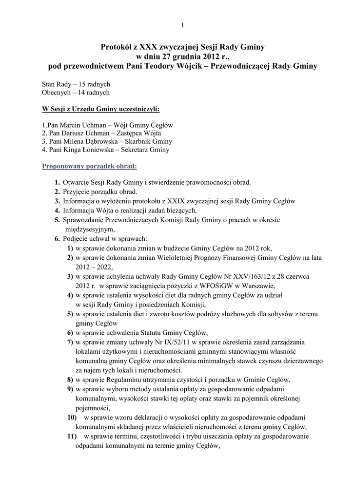 1 Protokół z XXX zwyczajnej Sesji Rady Gminy w dniu 27 grudnia 2012 r., pod przewodnictwem Pani Teodory Wójcik – Przewodniczącej Rady Gminy Stan Rady – 15 radnych Obecnych – 14 radnych W Sesji z Urzędu Gminy uczestniczyli: 1.Pan Marcin Uchman – Wójt Gminy Cegłów 2. Pan Dariusz Uchman – Zastępca Wójta 3. Pani Milena Dąbrowska – Skarbnik Gminy 4. Pani Kinga Łoniewska – Sekretarz Gminy Proponowany porządek obrad: 1. 2. 3. 4. 5. Otwarcie Sesji Rady Gminy i stwierdzenie prawomocności obrad. Przyjęcie porządku obrad. Informacja o wyłożeniu protokołu z XXIX zwyczajnej sesji Rady Gminy Cegłów Informacja Wójta o realizacji zadań bieżących, Sprawozdanie Przewodniczących Komisji Rady Gminy o pracach w okresie międzysesyjnym, 6. Podjęcie uchwał w sprawach: 1) w sprawie dokonania zmian w budżecie Gminy Cegłów na 2012 rok, 2) w sprawie dokonania zmian Wieloletniej Prognozy Finansowej Gminy Cegłów na lata 2012 – 2022, 3) w sprawie uchylenia uchwały Rady Gminy Cegłów Nr XXV/163/12 z 28 czerwca 2012 r. w sprawie zaciągnięcia pożyczki z WFOŚiGW w Warszawie, 4) w sprawie ustalenia wysokości diet dla radnych gminy Cegłów za udział w sesji Rady Gminy i posiedzeniach Komisji, 5) w sprawie ustalenia diet i zwrotu kosztów podróży służbowych dla sołtysów z terenu gminy Cegłów 6) w sprawie uchwalenia Statutu Gminy Cegłów, 7) w sprawie zmiany uchwały Nr IX/52/11 w sprawie określenia zasad zarządzania lokalami użytkowymi i nieruchomościami gminnymi stanowiącymi własność komunalną gminy Cegłów oraz określenia minimalnych stawek czynszu dzierżawnego za najem tych lokali i nieruchomości. 8) w sprawie Regulaminu utrzymania czystości i porządku w Gminie Cegłów, 9) w sprawie wyboru metody ustalania opłaty za gospodarowanie odpadami komunalnymi, wysokości stawki tej opłaty oraz stawki za pojemnik określonej pojemności, 10) w sprawie wzoru deklaracji o wysokości opłaty za gospodarowanie odpadami komunalnymi składanej przez właścicieli nieruchomości z terenu gminy Cegłów, 11) w sprawie terminu, częstotliwości i trybu uiszczania opłaty za gospodarowanie odpadami komunalnymi na terenie gminy Cegłów, 2 12) w sprawie odbierania odpadów komunalnych od właścicieli nieruchomości na których nie zamieszkują mieszkańcy, a powstają odpady komunalne 7. Interpelacje i zapytania. 8. Sprawy bieżące. 9. Przyjęcie protokołu z XXIX zwyczajnej sesji Rady Gminy Cegłów. 10. Zamknięcie obrad. Ad. 1 XXX zwyczajną Sesję R.G. w Cegłowie otworzyła Pani Przewodnicząca Teodora Wójcik oraz stwierdziła stan Rady 14 osób, w związku z czym podejmowane uchwały będą prawomocne. Następnie Przewodnicząca powitała Panów Wójtów, Panią Skarbnik, Panią Sekretarz, Sołtysów, Dyrektorów Szkół, Kierowników jednostek organizacyjnych, prasę oraz zgromadzonych mieszkańców Gminy. Ad. 2 Przewodnicząca przedstawiła proponowany porządek obrad, po czym zwróciła się z zapytaniem do Panów Wójtów oraz zebranych radnych czy mają jakieś uwagi do przedstawionego porządku obrad. Wójt poinformował, że w związku z aktualizacją powierzchni działki, która jest przeznaczona do sprzedaży w Wólce Wiciejowskiej, proponuje wprowadzić uchwałę w sprawie zmiany uchwały nr XIV/77/11 w sprawie wyrażenia zgody w drodze przetargu publicznego nieruchomości położonej we wsi Wólka Wiciejowska stanowiącej własność Gminy Cegłów. Wójt dodał, że wynika to z decyzji Starosty o zmianach geodezyjnych i w związku z tym w paragrafie 1 zamiast 0,1118ha powinno być 0,1014ha. Pan Zastępca Wójta dodał, że na potwierdzenie pokaże decyzję Starosty, która wpłynęła 14 grudnia br. Pani Przewodnicząca stwierdziła, że proponuje wprowadzenie tego projektu jako 13 projekt uchwały. Następnie przystąpiono do głosowania za rozszerzeniem porządku obrad o przedstawiony przez Wójta projekt uchwały. Głosowało 14 radnych obecnych na sali obrad. Przyjęto jednogłośnie. I przystąpiono do głosowania za przyjęciem rozszerzonego porządku obrad. Głosowało 14 radnych obecnych na sali obrad. Przyjęto jednogłośnie. Ad. 3. Przewodnicząca poinformowała o wyłożeniu protokołu z XXIX zwyczajnej, po czym poprosiła Pana Wójta Marcina Uchmana o przedstawienie informacji z realizacji zadań bieżących. Ad. 4 Pan Wójt powitał wszystkich zgromadzonych na Sesji, a następnie przystąpił do przekazania informacji z realizacji zadań bieżących. Następnie powiedział, że kluczową informacją tej kadencji jest rozbudowa oczyszczalni ścieków, do 15 stycznia powinno być już gotowe pozwolenie na użytkowanie tego obiektu, a wykonawca nanosi już ostatnie poprawki. Wójt dodał, że łącznie kwota tej inwestycji wynosi 3 prawie 2,5 mln zł, ale dodatkowo plac jest ogrodzony, wyłożony kostką, a przepuszczalność ścieków to 500 m3 na dobę. Drugą informacją była budowa kanalizacji w Mieni. Wójt dodał, że jest zrealizowana sieć główna bez przyłączy, zainstalowano 2 pompownie. Długość całkowita kanalizacji grawitacyjnej to 2091m. Wartość zrealizowanej części inwestycji to 1 220 000zł. Kolejna informacja dotyczyła rozpoczętej budowy chodnika przy ul. Kościuszki. Wójt poinformował, że prace są wykonywane przez Zarząd Dróg Powiatowych, a finansowane są w 50% ze środków gminnych, w tym z funduszu sołeckiego. Wójt poinformował, że zakupiony został ciągnik na potrzeby referatu gospodarki komunalnej, używany z 2002 r. Koszt zakupu to 53 tys. zł. Następną informacją była modernizacja oświetlenia w Mieni do DPS Jedlina, która została dofinansowana z WFOŚiGW 50 % wartości całego zadania czyli kwotą 14 500 zł. Pan Wójt wspomniał też, że dzięki środkom z powiatu odbyło się otwarcie drogi we wsi Podskwarne. Wykonano nakładkę od ronda o łącznej długości 2200 m. Odbiór nastąpił 7 grudnia. Ponadto również wykonano budowę chodnika przy ul. Kościuszki finanso