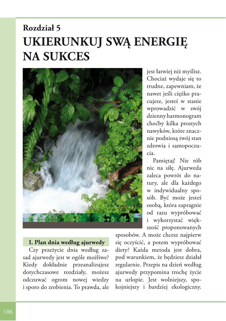 Rozdział 5 UKIERUNKUJ SWĄ ENERGIĘ NA SUKCES I. Plan dnia według ajurwedy Czy przeżycie dnia według zasad ajurwedy jest w ogóle możliwe? Kiedy dokładnie przeanalizujesz dotychczasowe rozdziały, możesz odczuwać ogrom nowej wiedzy i sporo do zrobienia. To prawda, ale 106 jest łatwiej niż myślisz. Chociaż wydaje się to trudne, zapewniam, że nawet jeśli ciężko pracujesz, jesteś w stanie wprowadzić w swój dzienny harmonogram choćby kilka prostych nawyków, które znacznie podniosą twój stan zdrowia i samopoczucia. Pamiętaj! Nie rób nic na siłę. Ajurweda zaleca powrót do natury, ale dla każdego w indywidualny sposób. Być może jesteś osobą, która zapragnie od razu wypróbować i wykorzystać większość proponowanych sposobów. A może chcesz najpierw się oczyścić, a potem wypróbować diety? Każda metoda jest dobra, pod warunkiem, że będziesz działał regularnie. Przepis na dzień według ajurwedy przypomina trochę życie na urlopie. Jest wolniejszy, spokojniejszy i bardziej ekologiczny. Na korzyść działa także to, że z wyjątkiem profesjonalnych masaży oraz Pancha karmy wprowadzenie ajurwedy do twojego życia nic Cię nie kosztuje. Możesz jedynie zyskać polepszenie zdrowia i samopoczucia. Dobowe zmiany w dosha Organizm każdego z nas funkcjonuje w określonych rytmach. Dosza mają swoje ulubione godziny, w których są najbardziej aktywne. Czas od godziny 6: 00 do 10: 00 rano to pora kapha. Jest ona odpowiedzialna za gromadzenie siły i energii na cały dzień. Wtedy następuje powolny rozruch. Ten okres jest najlepszy na oczyszczanie, masaż, umiarkowane ćwiczenia fizyczne, niewielki posiłek. Od godziny 10: 00 do 14: 00 przychodzi czas pitta. Wtedy rozbudza się apetyt i jest najlepsze trawienie, dlatego około godziny 12 - 13 najlepiej zjeść obiad. Ten okołopołudniowy posiłek powinien być najobfitszy w ciągu całego dnia. W czasie pitta jesteśmy też najbardziej wydajni. Czasem wczesnym popołudniem zdarza się kryzys. Świadczy on o tym, że posiłek był zbyt ciężki. Następny okres dnia to czas vata. Trwa od godziny 14: 00 do godziny 18: 00. Vata wzmaga naszą kre- atywność i błyskotliwość. To w tym czasie najlepiej pracować z koncepcjami, przedstawiać nowatorskie pomysły, przeprowadzać rozmowy o pracę. Mózg jest wtedy najbardziej rozbudzony i twórczy. Tak jest aż do godziny 18: 00. Po tym czasie w swoją fazę wchodzi znów kapha. Tym razem nie rozbudza, ale przygotowuje cię do snu. Wtedy najlepiej zjeść lekką kolację. Powinno się ją spożywać około 18: 00 – 19: 00, co najmniej 3 godziny przed pójściem spać. Potem kapha, która jest obecna w ciele do godziny 22: 00 powoduje ociężałość i tym samym wolniejsze trawienie. Od godziny 22: 00 do 2: 00 w nocy następuje faza pitta. Ta dosha aktywnie gromadzi w twoim ciele energię na kolejny dzień oraz ogrzewa cię podczas snu. Pitta działa nie tylko w twoim ciele, ale także w sferze psychicznej. Trawi wszystkie wydarzenia i problemy, które przeżyłeś w minionym dniu. Od godziny 2: 00 po raz kolejny przychodzi faza vata. Trwa ona do godziny 6: 00. Jeśli rano wstaniesz, będąc w tej fazie, uda ci się zachować energię przez cały dzień, bowiem vata wspaniale rozbudza i ożywia. Plan dnia według ajurwedy 107