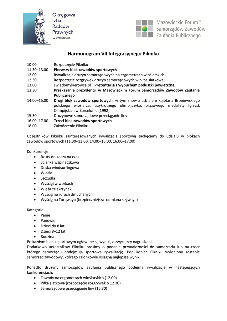 Harmonogram VII Integracyjnego Pikniku 10.00 11.30–13.00 12.00 12.30 13.00 13.30 14.00–15.00 15.30 16.00–17.00 18.00 Rozpoczęcie Pikniku Pierwszy blok zawodów sportowych Rywalizacja drużyn samorządowych na ergometrach wioślarskich Rozpoczęcie rozgrywek drużyn samorządowych w piłce siatkowej swiadomykierowca.pl Prezentacja z wybuchem poduszki powietrznej Przekazanie prezydencji w Mazowieckim Forum Samorządów Zawodów Zaufania Publicznego Drugi blok zawodów sportowych, w tym show z udziałem Kajetana Broniewskiego polskiego wioślarza, trzykrotnego olimpijczyka, brązowego medalisty Igrzysk Olimpijskich w Barcelonie (1992) Drużynowe samorządowe przeciąganie liny Trzeci blok zawodów sportowych Zakończenie Pikniku Uczestników Pikniku zainteresowanych rywalizacją sportową zachęcamy do udziału w blokach zawodów sportowych (11.30–13.00, 14.00–15.00, 16.00–17.00) Konkurencje: Rzuty do kosza na czas Ścianka wspinaczkowa Deska windsurfingowa Wiosła Szczudła Wyścigi w workach Wieża ze skrzynek Wyścig na rurach dmuchanych Wyścig na Torqwayu (bezpieczniejsza odmiana segwaya) Kategorie: Panie Panowie Dzieci do 8 lat Dzieci 8–12 lat Rodzina Po każdym bloku sportowym ogłaszane są wyniki, a zwycięzcy nagradzani. Dodatkowo uczestników Pikniku prosimy o podanie przynależności do samorządu lub na rzecz którego samorządu podejmują sportową rywalizację. Pod koniec Pikniku wyłoniony zostanie samorząd zawodowy, którego członkowie osiągną najlepsze wyniki. Ponadto drużyny samorządów zaufania publicznego podejmą rywalizację w następujących konkurencjach: Zawody na ergometrach wioślarskich (12.00) Piłka siatkowa (rozpoczęcie rozgrywek o 12.30) Samorządowe przeciąganie liny (15.30)