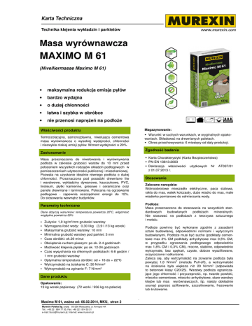 Karta Techniczna Technika klejenia KLT_Maximo M61wykładzin i parkietów Masa wyrównawcza MAXIMO M 61 (Nivelliermasse Maximo M 61) • maksymalna redukcja emisja pyłów • bardzo wydajna • o dużej chłonności • łatwa i szybka w obróbce • nie przenosi naprężeń na podłoże Magazynowanie: Właściwości produktu Warunki: w suchych warunkach, w oryginalnych opakowaniach. Składować na drewnianych paletach. Okres przechowywania: 6 miesięcy od daty produkcji. Termoizolacyjna, samorozpływna, niwelująca cementowa masa wyrównawcza o wysokiej wydajności, chłonności i niezwykle niskiej emisji pyłów. Wzrost wydajności o 20%. Zgodność badania Zastosowanie Karta Charakterystyki (Karta Bezpieczeństwa) PN-EN 13813:2003 Deklaracja właściwości użytkowych Nr AT037/01 z 01.07.2013 r. Masa przeznaczona do niwelowania i wyrównywania podłoża w zakresie grubości warstw do 10 mm przed położeniem wszystkich rodzajów okładzin podłogowych w pomieszczeniach użyteczności publicznej i mieszkaniowej. Pozwala na uzyskanie idealnie równego podłoża o dużej chłonności. Przeznaczona pod posadzki drewniane lite i warstwowe, wykładziny dywanowe, kauczukowe, PVC, linoleum, płytki kamienne, gresowe i ceramiczne oraz panele drewniane i laminowane. Polecana na ogrzewanie podłogowe - zapewnia oszczędność energii do 12%. Do stosowania wewnątrz budynków. Stosowanie Zalecane narzędzia: Wolnoobrotowe mieszadło elektryczne, paca stalowa, rakla do mas, wałek kolczasty, duże wiadro do mas, małe wiaderko pomiarowe do odmierzania wody. Podłoże: Masa przeznaczona do stosowania na wszystkich standardowych budowlanych podłożach mineralnych. Nie stosować na podłożach z tworzywa sztucznego i metalu. Parametry techniczne Dane dotyczą warunków: temperatura powietrza 20oC, wilgotność względna powietrza 55% Zużycie: 1,0 kg/m²/mm grubości warstwy Wymagana ilość wody: 0,30 l/kg (3,9 l /13 kg worek) Podłoże powinno być wykonane zgodnie z zasadami sztuki budowlanej, odpowiednimi normami i wytycznymi budowlanymi. Podłoże musi być suche (podkłady cementowe max 2% CM podkłady anhydrytowe max 0,5% CM, w przypadku ogrzewania podłogowego odpowiednio max 1,8% CM i 0,3% CM), mocne, stabilne, odpowiednio wytrzymałe, bez spękań, czyste, dobrze wyszlifowane, oczyszczone i odkurzone. Zaleca się, aby wytrzymałość na zrywanie podłoża była powyżej 1,0 N/mm2 (metoda Pull-off), a wytrzymałość na ściskanie była większa niż 20 N/mm² (odpowiada to betonowi klasy C20/25). Warstwy podłoża ograniczające jego chłonność i przyczepność, np. twarde powłoki, mleczko cementowe, mleczko anhydrytowe, stare warstwy klejów lub mas wyrównawczych, itp. należy dokładnie usunąć poprzez szlifowanie, szczotkowanie, frezowanie lub śrutowanie. Maksymalna grubość warstwy: 10 mm Minimalna grubość warstwy pod parkiet: 3 mm Czas obróbki: ok.20 minut Obciążenie ruchem pieszym: po ok. 2-4 godzinach Możliwość klejenia płytek: po ok. 12-24 godzinach Czas wysychania na chłonnych podłożach: 6-8 godzin / 1 mm grubości warstwy Optymalna temperatura obróbki: od + 16 do + 22°C Wytrzymałość na ściskanie C: 30 N/mm² Wytrzymałość na zginanie F: 7 N/mm² Dane produktu Opakowanie: 13 kg worek papierowy (72 worki / 936 kg na palecie) Maximo M 61, ważna od: 06.02.2014, MKU, stron 2 Murexin Polska Sp. z o.o. 03-236 Warszawa, ul. Annopol 4A Tel.: +48 22 / 884 77 55, Fax: +48 22 / 814 53 31 e-mail: [email protected], Internet: www.murexin.pl 1 Karta Techniczna Technika klejenia KLT_Maximo M61wykładzin i parkietów Wszystkie rysy i pęknięcia w podłożu należy poszerzyć, poprzecznie do rysy wykonać nacięcia co ok. 20÷30 cm na ½ grubości podkładu, dokładnie odkurzyć i umieścić tam klamry HOCO, a następnie całość wypełnić żywicą 2K HOCO24 lub żywicą 2K IS 60, czy żywicą epoksydową EP70 BM i obficie zasypać piaskiem kwarcowym 0,4÷0,8 mm (min. 2,5 kg/m2). Ubytki w podłożu uzupełnić używając masy szpachlowej SF80 w grubości do 50 mm lub masy SF83 w grubości do 40 mm. Słabe podłoża, o niskiej wytrzymałości należy odpowiednio wzmocnić poprzez gruntowanie w systemie Murexin. Dylatacje konstrukcyjne należy przenieść przez wszystkie warstwy podłogi. Wokół ścian i słupów należy wykonać dylatacje obwodowe (przykleić obwodową taśmę dylatacyjną). W większych i dłuższych pomieszczeniach oraz w przewężeniach pomieszczeń (w progach drzwi) należy wykonać na powierzchni dylatacje pośrednie. Zalecane pola dylatacyjne to ok. 36 m2. W przypadku konieczności nałożenia kolejnej warstwy, układać ją dopiero wtedy, gdy będzie można wejść na warstwę ułożoną wcześniej (po upływie ok. 2-4 godz.). Przy dłuższej przerwie ponownie zagruntować gruntem D1. Na dużych powierzchniach masa NE30 może być układana za pomocą odpowiedniej pompy ślimakowej. Uwaga: Minimalna grubość warstwy pod parkiet: 3 mm. Przy niechłonnych podłożach, grubszych warstwach masy i złych warunkach klimatycznych należy uwzględnić dłuższe czasy schnięcia masy. Czas schnięcia masy na chłonnych podłożach wynosi około 6 - 8 godzin na 1 mm grubości warstwy. Optymalna temperatura pracy: 16-22°C. Pielęgnacja: Świeżo wylaną masę należy chronić przed nasłonecznieniem i zbyt szybkim wysychaniem podczas wiązania. Gruntowanie: Podłoża chłonne: Podłoża chłonne należy wyszlifować, odkurzyć i zagruntować preparatem gruntującym Murexin D1 (w razie potrzeby rozcieńczyć grunt wodą w proporcji od 1:3 do 1:1). Pozostawić do wyschnięcia przez ok. 2÷3 godziny. Alternatywnie można użyć grunt penetrujący Murexin D7. Pozostawić do wyschnięcia przez ok. 15 minut. Przy bardzo chłonnym podłożu gruntowanie należy powtórzyć. Podłoża niechłonne: Podłoża niechłonne (np. lastriko, płytki ceramiczne) należy odtłuścić, wyszlifować, odkurzyć i zagruntować preparatem gruntującym Murexin Super grunt D4. 