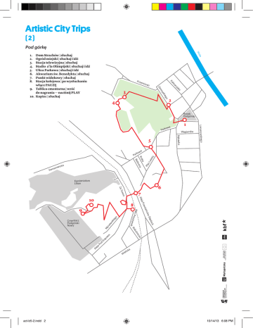 Artistic City Trips (2) Pod górkę sła Wi 3 4 a sk yj ar lw Ka Krz em ion ki go kie ys mo Za 1. Dom Strachów | słuchaj 2. Ogród miejski | słuchaj i idź 3. Stacja telewizyjna | słuchaj 4. Stadio a’la Olimpijski | słuchaj i idź 5. Ulica Parkowa | słuchaj i idź 6. Akwarium św. Benedykta | słuchaj 7. Punkt widokowy | słuchaj 8. Stacja kolejowa | po wysłuchaniu włącz PAUZĘ 9. Tablica cmentarna | wróć do nagrania — naciśnij PLAY 10. Kopiec | słuchaj 2 Rynek Podgórski Rękawka ka Kra sna do Ra Pla cL as oty 5 wa rko Pa Węgierska Limanowskiego 1 a kow Par ka wic szo Swo Kamieniołom Liban m ore Za T 6 7 8 M ar ye ws kie go Al ej a Po d Ko pc em Cmentarz Podgórski Nowy za nic Plac ot Przy ob stan ek R 9 ich ląsk wŚ ńcó sta ow ja P Ale 10 act-b5-2.indd 2 a ick iel W 10/14/13 6:08 PM