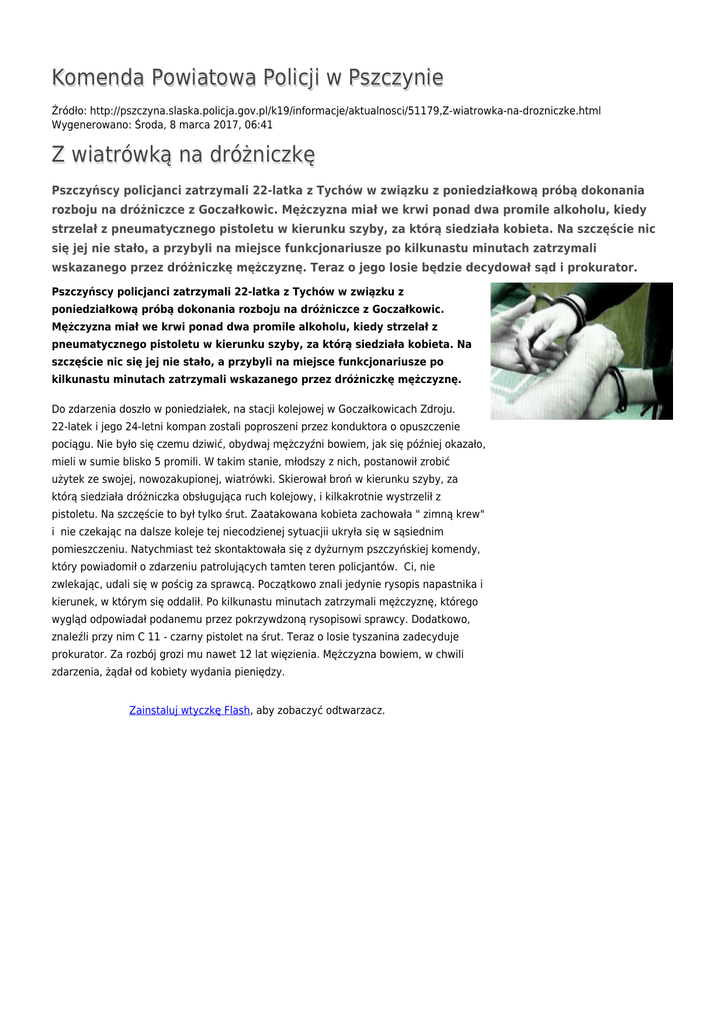 Komenda Powiatowa Policji w Pszczynie Źródło: http://pszczyna.slaska.policja.gov.pl/k19/informacje/aktualnosci/51179,Z-wiatrowka-na-drozniczke.html Wygenerowano: Środa, 8 marca 2017, 06:41 Z wiatrówką na dróżniczkę Pszczyńscy policjanci zatrzymali 22-latka z Tychów w związku z poniedziałkową próbą dokonania rozboju na dróżniczce z Goczałkowic. Mężczyzna miał we krwi ponad dwa promile alkoholu, kiedy strzelał z pneumatycznego pistoletu w kierunku szyby, za którą siedziała kobieta. Na szczęście nic się jej nie stało, a przybyli na miejsce funkcjonariusze po kilkunastu minutach zatrzymali wskazanego przez dróżniczkę mężczyznę. Teraz o jego losie będzie decydował sąd i prokurator. Pszczyńscy policjanci zatrzymali 22-latka z Tychów w związku z poniedziałkową próbą dokonania rozboju na dróżniczce z Goczałkowic. Mężczyzna miał we krwi ponad dwa promile alkoholu, kiedy strzelał z pneumatycznego pistoletu w kierunku szyby, za którą siedziała kobieta. Na szczęście nic się jej nie stało, a przybyli na miejsce funkcjonariusze po kilkunastu minutach zatrzymali wskazanego przez dróżniczkę mężczyznę. Do zdarzenia doszło w poniedziałek, na stacji kolejowej w Goczałkowicach Zdroju. 22-latek i jego 24-letni kompan zostali poproszeni przez konduktora o opuszczenie pociągu. Nie było się czemu dziwić, obydwaj mężczyźni bowiem, jak się później okazało, mieli w sumie blisko 5 promili. W takim stanie, młodszy z nich, postanowił zrobić użytek ze swojej, nowozakupionej, wiatrówki. Skierował broń w kierunku szyby, za którą siedziała dróżniczka obsługująca ruch kolejowy, i kilkakrotnie wystrzelił z pistoletu. Na szczęście to był tylko śrut. Zaatakowana kobieta zachowała " zimną krew" i nie czekając na dalsze koleje tej niecodzienej sytuacjii ukryła się w sąsiednim pomieszczeniu. Natychmiast też skontaktowała się z dyżurnym pszczyńskiej komendy, który powiadomił o zdarzeniu patrolujących tamten teren policjantów. Ci, nie zwlekając, udali się w pościg za sprawcą. Początkowo znali jedynie rysopis napastnika i kierunek, w którym się oddalił. Po kilkunastu minutach zatrzymali mężczyznę, którego wygląd odpowiadał podanemu przez pokrzywdzoną rysopisowi sprawcy. Dodatkowo, znaleźli przy nim C 11 - czarny pistolet na śrut. Teraz o losie tyszanina zadecyduje prokurator. Za rozbój grozi mu nawet 12 lat więzienia. Mężczyzna bowiem, w chwili zdarzenia, żądał od kobiety wydania pieniędzy. Zainstaluj wtyczkę Flash, aby zobaczyć odtwarzacz. pobierz film - 1.66 MB Ocena: 0/5 (0) Tweetnij