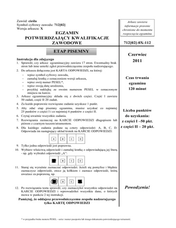 Zawód: cieśla Symbol cyfrowy zawodu: 712[02] Wersja arkusza: X EGZAMIN POTWIERDZAJĄCY KWALIFIKACJE ZAWODOWE ETAP PISEMNY Instrukcja dla zdającego 1. Sprawdź, czy arkusz egzaminacyjny zawiera 17 stron. Ewentualny brak stron lub inne usterki zgłoś przewodniczącemu zespołu nadzorującego. 2. Do arkusza dołączona jest KARTA ODPOWIEDZI, na której: wpisz symbol cyfrowy zawodu, zamaluj kratkę z oznaczeniem wersji arkusza, wpisz swój numer PESEL, wpisz swoją datę urodzenia, przyklej naklejkę ze swoim numerem PESEL w oznaczonym miejscu na karcie. 3. Arkusz egzaminacyjny składa się z dwóch części. Część I zawiera 50 zadań, część II 20 zadań. 4. Za każde poprawnie rozwiązane zadanie uzyskasz 1 punkt. 5. Aby zdać etap pisemny egzaminu, musisz uzyskać co najmniej 25 punktów z części I i co najmniej 6 punktów z części II. 6. Czytaj uważnie wszystkie zadania. 7. Rozwiązania zaznaczaj na KARCIE ODPOWIEDZI długopisem lub piórem z czarnym tuszem/atramentem. 8. Dla każdego zadania podane są cztery odpowiedzi: A, B, C, D. Odpowiada im następujący układ kratek na KARCIE ODPOWIEDZI: Arkusz zawiera informacje prawnie chronione do momentu rozpoczęcia egzaminu 712[02]-0X-112 Czerwiec 2011 Czas trwania egzaminu 120 minut Liczba punktów do uzyskania: z części I –50 pkt. z części II – 20 pkt. 9. Tylko jedna odpowiedź jest poprawna. 10. Wybierz właściwą odpowiedź i zamaluj kratkę z odpowiadającą jej literą - np. gdy wybrałeś odpowiedź „A”: 11. Staraj się wyraźnie zaznaczać odpowiedzi. Jeżeli się pomylisz i błędnie zaznaczysz odpowiedź, otocz ją kółkiem i zaznacz odpowiedź, którą uważasz za poprawną, np. 12. Po rozwiązaniu testu sprawdź, czy zaznaczyłeś wszystkie odpowiedzi na KARCIE ODPOWIEDZI i wprowadziłeś wszystkie dane, o których mowa w punkcie 2 tej instrukcji. Powodzenia! Pamiętaj, że oddajesz przewodniczącemu zespołu nadzorującego tylko KARTĘ ODPOWIEDZI * w przypadku braku numeru PESEL - seria i numer paszportu lub innego dokumentu potwierdzającego tożsamość. Część I Zadanie 1. Pracownik podczas wykonywania prac rozbiórkowych skaleczył stopę o wystający z deski gwóźdź. Pierwsza pomoc będzie polegała na A. B. C. D. opatrzeniu rany i skierowaniu do lekarza. wezwaniu pogotowia ratunkowego. założeniu opatrunku uciskowego. wygodnym ułożeniu poszkodowanego. Zadanie 2. Obecnie coraz częściej buduje się drewniane domy jednorodzinne, letniskowe, pawilony handlowe szczególnie w technologii A. B. C. D. szwedzkiej. kanadyjskiej. fińskiej. niemieckiej. Zadanie 3. Ograniczenie stosowania drewna w budownictwie wynika z A. B. C. D. nieracjonalnej gospodarki i nieodporności drewna na ogień. wysokiej ceny drewna. wysokich kosztów pozyskania drewna. braku wykonawców. Zadanie 4. Zalety budynków drewnianych, to A. B. C. D. trudnopalność. odporność na wilgoć. ciepłochłonność i lekkość brak skurczu drewna przy wysychaniu. Zadanie 5. Z wymienionych gatunków drewna, najtwardsze jest A. B. C. D. sosnowe. dębowe. lipowe. świerkowe. Strona 2 z 17 Zadanie 6. Gęstość drewna wynosi około A. 500 kg/m3 B. 1 500 kg/m3 C. 2 600 kg/m3 D. 3 400 kg/m3 Zadanie 7. Za drewno suche uważa się takie, którego wilgotność jest poniżej A. B. C. D. 30% 20% 13 % 35% Zadanie 8. Tarcicę iglastą otrzymujemy po rozpiłowaniu drewna z A. B. C. D. akacji. jodły. brzozy. dębu. Zadanie 9. Punktem w kolorze niebieskim oznacza się tarcicę iglastą klasy A. B. C. D. I II III IV Zadanie 10. Wadą płyt wiórowych jest A. B. C. D. duża sprężystość. duże wymiary płyt. pękanie podczas obróbki. mała wartość termoizolacyjna. Strona 3 z 17 Zadanie 11. Na wykonanie podłogi o powierzchni 30,00 m2 z desek o grubości 35 mm zużyjemy deski o łącznej objętości około A. B. C. D. 1 m3 2 m3 2,5 m3 3 m3 Zadanie 12. Sęki powodują A. B. C. D. zmniejszenie wytrzymałości drewna. zmniejszenie wartości izolacyjnej drewna. polepszenie warunków obróbki drewna. zwiększenie trwałości drewna. Zadanie 13. Tarcica obrzynana o przekroju poprzecznym 50x150 mm, to A. B. C. D. bal. deska. belka. krawędziak. Zadanie 14. Zsuwaniu się materiałów z pomostów roboczych rusztowań zapobiegają A. B. C. D. poręcze. odbojnice (burtnice). krzyżulce. podłużnice. Zadanie 15. Dyble są to A. B. C. D. wkładki drewniane. wkręty metalowe. specjalne gwoździe. kołki rozporowe. Strona 4 z 17 Zadanie 16. Czas przeznaczony na wykonanie 1 m2 podłogi wynosi 2 roboczogodziny. Stawka pracownika wynosi 10,00 zł za godzinę Jakie będzie wynagrodzenie za wykonanie podłogi o wymiarach 6 x 4 m? A. B. C. D. 200 zł 350 zł 520 zł 480 zł Zadanie 17. Podaj kolejność czynność przy wykonaniu podłogi na legarach. A. B. C. D. Ułożenie legarów, wyrównanie podłoża, przymocowanie desek. Wyrównanie podłoża, przymocowanie desek, ułożenie legarów. Przymocowanie desek do legarów i całość ułożona na podłożu. Wyrównanie podłoża, ułożenie legarów, przymocowanie desek. Zadanie 18. Do odcięcia drewna i tworzyw drzewnych służy A. B. C. D. strugarka. frezarka. pilarka. dłutownica. Zadanie 19. Do wykonania cięć ukośnych pod kątem 45 stopni do osi elementu używa się A. B. C. D. strugu. zdzieraka. strugnicy stolarskiej. skrzynki uciosowej. Zadanie 20. Gdy siekiera ulegnie całkowitemu stępieniu należy ją A. B. C. D. ostrzyć papierem ściernym. ostrzyć na toczaku. ostrzyć osełką. przekuć. Strona 5 z 17 Zadanie 21. Do pilarek nie zalicza się A. B. C. D. pił tarczowych. pił taśmowych. wyrówniarek. traków. Zadanie 22. Pobijak i dłuto są potrzebne do A. B. C. D. wybierania gniazd. wykonania podłogi. umocowania połaci dachu. montażu elementów rusztowania. Zadanie 23. Impregnowanie drewna polega na A. B. C. D. malowaniu drewna farbą emulsyjną. zabezpieczeniu drewna przed owadami i zagrzybieniem. moczeniu drewna w wodzie. suszeniu naturalnym zwanym sezonowaniem. Zadanie 24. Pracownika zabezpi