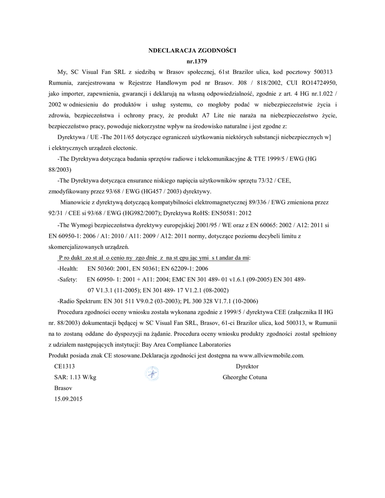 NDECLARACJA ZGODNOŚCI nr.1379 My, SC Visual Fan SRL z siedzibą w Brasov społecznej, 61st Brazilor ulica, kod pocztowy 500313 Rumunia, zarejestrowana w Rejestrze Handlowym pod nr Brasov. J08 / 818/2002, CUI RO14724950, jako importer, zapewnienia, gwarancji i deklarują na własną odpowiedzialność, zgodnie z art. 4 HG nr.1.022 / 2002 w odniesieniu do produktów i usług systemu, co mogłoby podać w niebezpieczeństwie życia i zdrowia, bezpieczeństwa i ochrony pracy, że produkt A7 Lite nie naraża na niebezpieczeństwo życie, bezpieczeństwo pracy, powoduje niekorzystne wpływ na środowisko naturalne i jest zgodne z: Dyrektywa / UE -The 2011/65 dotyczące ograniczeń użytkowania niektórych substancji niebezpiecznych w] i elektrycznych urządzeń electonic. -The Dyrektywa dotycząca badania sprzętów radiowe i telekomunikacyjne & TTE 1999/5 / EWG (HG 88/2003) -The Dyrektywa dotycząca ensurance niskiego napięcia użytkowników sprzętu 73/32 / CEE, zmodyfikowany przez 93/68 / EWG (HG457 / 2003) dyrektywy. Mianowicie z dyrektywą dotyczącą kompatybilności elektromagnetycznej 89/336 / EWG zmieniona przez 92/31 / CEE si 93/68 / EWG (HG982/2007); Dyrektywa RoHS: EN50581: 2012 -The Wymogi bezpieczeństwa dyrektywy europejskiej 2001/95 / WE oraz z EN 60065: 2002 / A12: 2011 si EN 60950-1: 2006 / A1: 2010 / A11: 2009 / A12: 2011 normy, dotyczące poziomu decybeli limitu z skomercjalizowanych urządzeń. P ro dukt zo st ał o cenio ny zgo dnie z na st ępu jąc ymi s t andar da mi: -Health: EN 50360: 2001, EN 50361; EN 62209-1: 2006 -Safety: EN 60950- 1: 2001 + A11: 2004; EMC EN 301 489- 01 v1.6.1 (09-2005) EN 301 48907 V1.3.1 (11-2005); EN 301 489- 17 V1.2.1 (08-2002) -Radio Spektrum: EN 301 511 V9.0.2 (03-2003); PL 300 328 V1.7.1 (10-2006) Procedura zgodności oceny wniosku została wykonana zgodnie z 1999/5 / dyrektywa CEE (załącznika II HG nr. 88/2003) dokumentacji będącej w SC Visual Fan SRL, Brasov, 61-ci Brazilor ulica, kod 500313, w Rumunii na to zostaną oddane do dyspozycji na żądanie. Procedura oceny wniosku produkty zgodności został spełniony z udziałem następujących instytucji: Bay Area Compliance Laboratories Produkt posiada znak CE stosowane.Deklaracja zgodności jest dostępna na www.allviewmobile.com. CE1313 SAR: 1.13 W/kg Brasov 15.09.2015 Dyrektor Gheorghe Cotuna