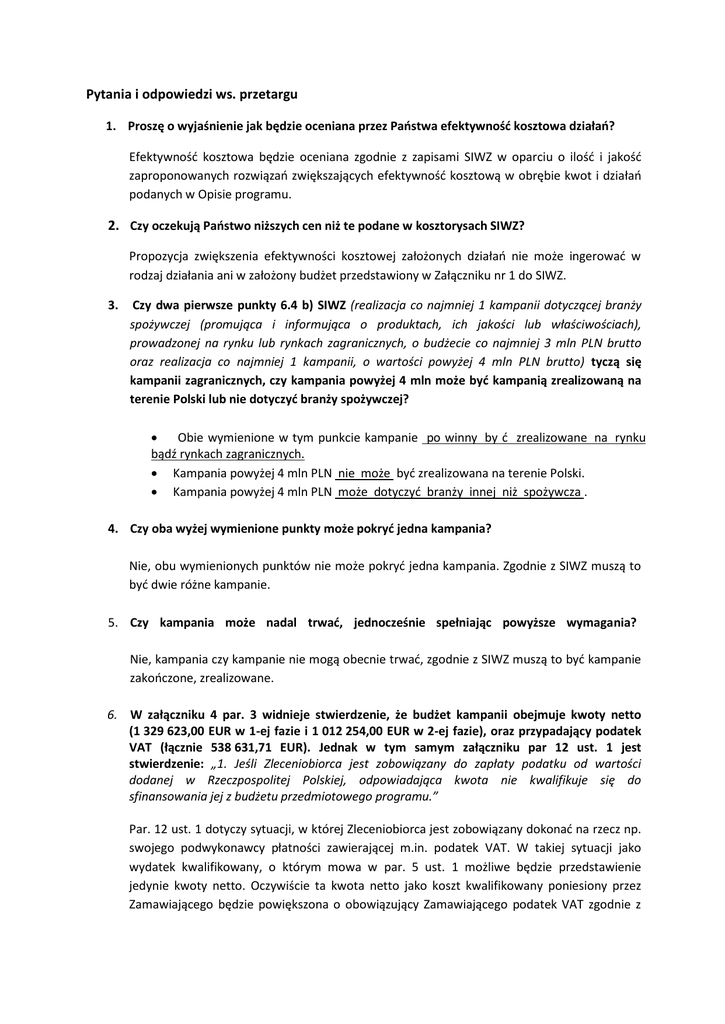 Pytania i odpowiedzi ws. przetargu 1. Proszę o wyjaśnienie jak będzie oceniana przez Państwa efektywność kosztowa działań? Efektywność kosztowa będzie oceniana zgodnie z zapisami SIWZ w oparciu o ilość i jakość zaproponowanych rozwiązań zwiększających efektywność kosztową w obrębie kwot i działań podanych w Opisie programu. 2. Czy oczekują Państwo niższych cen niż te podane w kosztorysach SIWZ? Propozycja zwiększenia efektywności kosztowej założonych działań nie może ingerować w rodzaj działania ani w założony budżet przedstawiony w Załączniku nr 1 do SIWZ. 3. Czy dwa pierwsze punkty 6.4 b) SIWZ (realizacja co najmniej 1 kampanii dotyczącej branży spożywczej (promująca i informująca o produktach, ich jakości lub właściwościach), prowadzonej na rynku lub rynkach zagranicznych, o budżecie co najmniej 3 mln PLN brutto oraz realizacja co najmniej 1 kampanii, o wartości powyżej 4 mln PLN brutto) tyczą się kampanii zagranicznych, czy kampania powyżej 4 mln może być kampanią zrealizowaną na terenie Polski lub nie dotyczyć branży spożywczej? Obie wymienione w tym punkcie kampanie po winny by ć zrealizowane na rynku bądź rynkach zagranicznych. Kampania powyżej 4 mln PLN nie może być zrealizowana na terenie Polski. Kampania powyżej 4 mln PLN może dotyczyć branży innej niż spożywcza . 4. Czy oba wyżej wymienione punkty może pokryć jedna kampania? Nie, obu wymienionych punktów nie może pokryć jedna kampania. Zgodnie z SIWZ muszą to być dwie różne kampanie. 5. Czy kampania może nadal trwać, jednocześnie spełniając powyższe wymagania? Nie, kampania czy kampanie nie mogą obecnie trwać, zgodnie z SIWZ muszą to być kampanie zakończone, zrealizowane. 6. W załączniku 4 par. 3 widnieje stwierdzenie, że budżet kampanii obejmuje kwoty netto (1 329 623,00 EUR w 1-ej fazie i 1 012 254,00 EUR w 2-ej fazie), oraz przypadający podatek VAT (łącznie 538 631,71 EUR). Jednak w tym samym załączniku par 12 ust. 1 jest stwierdzenie: „1. Jeśli Zleceniobiorca jest zobowiązany do zapłaty podatku od wartości dodanej w Rzeczpospolitej Polskiej, odpowiadająca kwota nie kwalifikuje się do sfinansowania jej z budżetu przedmiotowego programu.” Par. 12 ust. 1 dotyczy sytuacji, w której Zleceniobiorca jest zobowiązany dokonać na rzecz np. swojego podwykonawcy płatności zawierającej m.in. podatek VAT. W takiej sytuacji jako wydatek kwalifikowany, o którym mowa w par. 5 ust. 1 możliwe będzie przedstawienie jedynie kwoty netto. Oczywiście ta kwota netto jako koszt kwalifikowany poniesiony przez Zamawiającego będzie powiększona o obowiązujący Zamawiającego podatek VAT zgodnie z par. 5 ust 4. Nie będzie natomiast możliwa sytuacja, w której jako koszt kwalifikowany przedstawiana jest kwota brutto z faktury od podwykonawcy i dodatkowo naliczany jest od tej kwoty VAT należny Zleceniobiorcy z myśl par. 5 ust. 4. 7. Czy to oznacza, że mimo założenia w budżecie sumy 538 631,71 EUR na VAT, polski podatnik VAT - jak nasza firma - nie może wystawiać faktur z VAT, gdyż dla UPEMI to koszt niekwalifikowany? Nie, zgodnie z par. 5 ust. 4 w przypadku gdy Zleceniobiorca jest zobowiązany do naliczenia podatku VAT, płatność z tego tytułu zostanie uregulowana przez UPEMI. 8. Czy UPEMI zaakceptuje faktury bez VAT wystawione przez naszego partnera z Brukseli? TAK, jeżeli będzie to wynikało z dokumentów złożonych w przetargu. 9. Czy jeśli podwykonawcą Lidera Konsorcjum jest firma polska, np. wykonawca filmu promocyjnego, czy gadżetów to ta firma wystawi Liderowi konsorcjum fakturę z VAT, ale Lider może wystawić Zamawiającemu jedynie faktur bez VAT? W związku z tym pojawia się kolejne pytanie: o ile wynagrodzenia są płacone w trybie kwartalnym, to jak z kosztami? Np. jeśli mamy w koszty udziału w targach w wys. 50 000 EUR (sala, catering, hostessy itp.), a targi przypadły w pierwszym miesiącu kwartału, to czy faktura na te 50 000 może zostać wystawiona od razu po zakończeniu targów i zebraniu faktur podwykonawców, czy dopiero wraz z upływem kwartału? Wszystkie kwestie dotyczące wzajemnych rozliczeń pomiędzy Zamawiającym a Wykonawcą wynikające z realizacji umowy szczegółowo opisuje załącznik nr 4 - Wzór Istotnych Postanowień Umowy i na tym etapie sądzimy, że jest on wyczerpujący. Wszelkie doprecyzowania zapisów tej umowy będą uzgadniane już po zakończeniu postępowania z wybranym oferentem. 10. Budżety na targi i kongresy przewidują jedynie tzw. koszty zewnętrzne. Z jakiej pozycji budżetowej będzie opłacony czas pracy osób, które będą odpowiedzialne za organizację (budowę, funkcjonowanie) stoiska i udziału w targach oraz za zorganizowanie kongresów? Czy z pozycji 13% wynagrodzenia dla organizacji wdrażającej? Wszystkie koszty określone w pozycjach dotyczących targów oraz kongresów to całość budżetu na wszystkie działania i prace gwarantujące właściwe wykonanie działania. Organizacja wdrażająca angażuje podwykonawców niezbędnych do realizacji założonych działań. Całość prac zleconych podwykonawcom, pod warunkiem że ich zakres wpisuje się w poszczególne pozycje określone w budżecie danego działania, jest pokrywana z budżetów dla poszczególnych pozycji. Wynagrodzenie organizacji wdrażającej pokrywa natomiast pracę ludzi oraz wszystkie koszty firmy lub firm, w przypadku konsorcjum, które zostaną stroną umowy na realizację kampanii. Organizacja wdrażająca ma obowiązek wskazania podwykonawców, których zaangażuje wraz z informacją na temat prac, które zostaną przez nich wykonane. 11. Odnośnie zakupu i transportu mięsa na potrzeby pokazów na targach – czy mięso będzie transportowane z Polski? Jeżeli tak – czy będą Państwo pomagać w wypełnianiu dokumentacji, uzyskaniu certyfikatów itp., koniecznych do transportu i wpuszczenia towaru do kraju docelowego? Budżet i opis programu nie zawierają